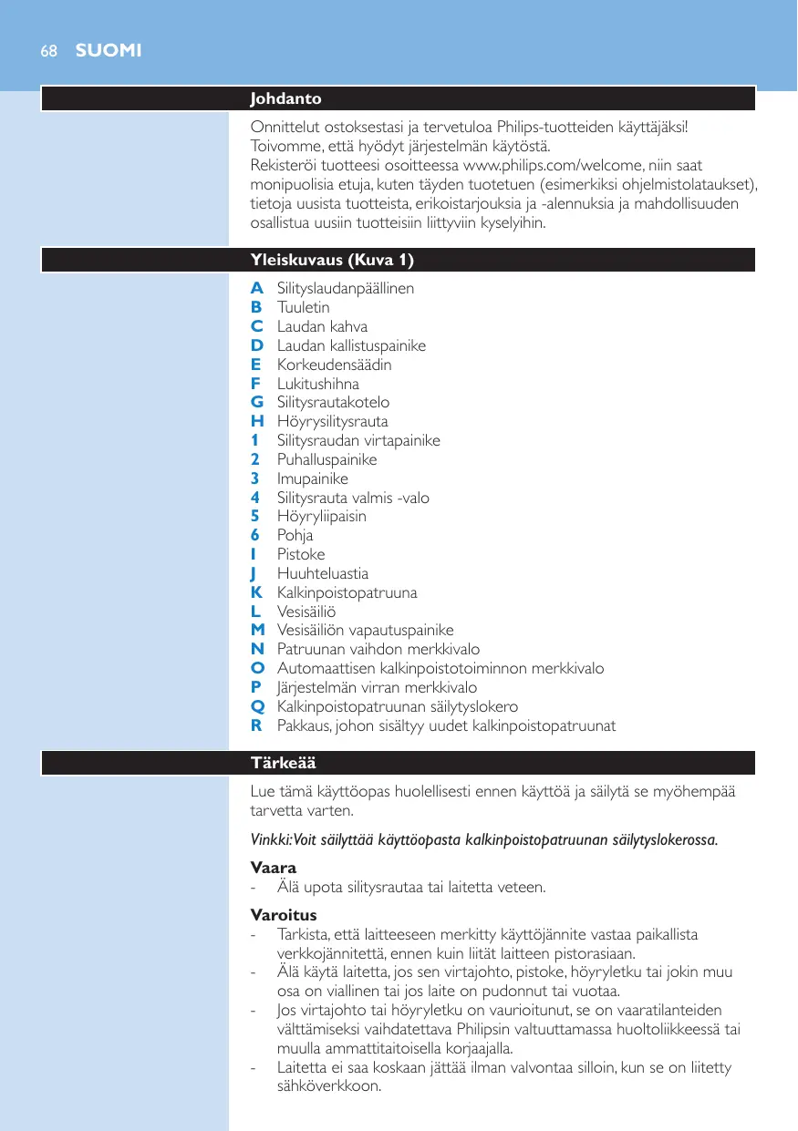 Lisez attentivement ce mode d’emploi avant d’utiliser l’appareil et conservez-le pour un usage ultérieur. Conseil :Vous pouvez loger le mode d’emploi dans le compartiment de rangement des cartouches anticalcaire. Danger -- Ne plongez jamais le fer ni l’appareil dans l’eau. Avertissement -- Avant de brancher l’appareil, vérifiez que la tension indiquée sur l’appareil correspond à la tension supportée par le secteur local. -- N’utilisez pas l’appareil si la fiche, le cordon d’alimentation, le cordon flexible ou l’appareil lui-même sont endommagés, si l’appareil est tombé ou s’il fuit.