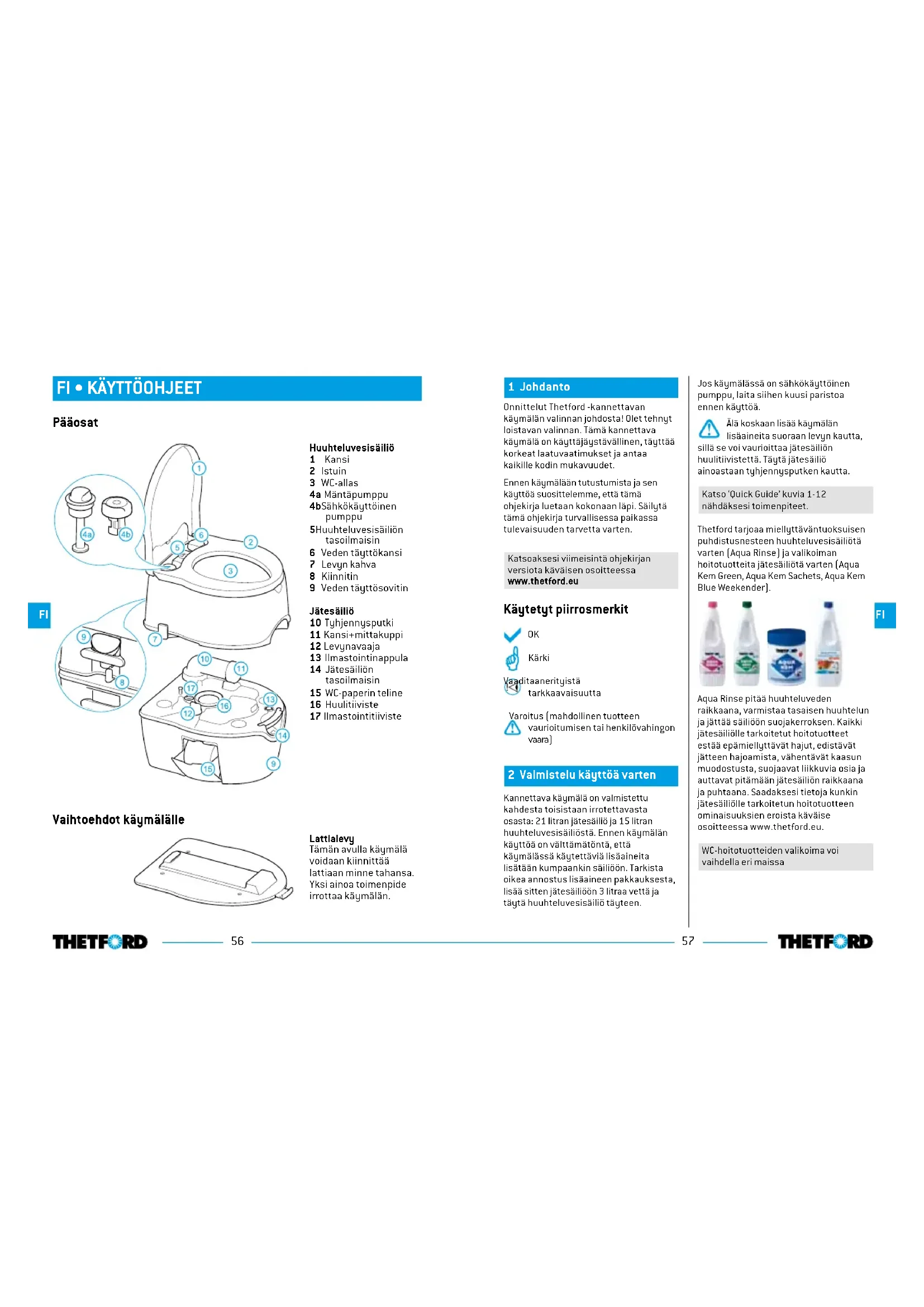 Kärki Vaaditaan erityistä tarkkaavaisuutta Varoitus (mahdollinen tuotteen vaurioitumisen tai henkilövahingon vaara) 2 Valmistelu käyttöä varten Kannettava käymälä on valmistettu kahdesta toisistaan irrotettavasta osasta: 21 litran jätesäiliö ja 15 litran huuhteluvesisäiliöstä. Ennen käymälän käyttöä on välttämätöntä, että käymälässä käytettäviä lisäaineita lisätään kumpaankin säiliöön. Tarkista oikea annostus lisäaineen pakkauksesta, lisää sitten jätesäiliöön 3 litraa vettä ja täytä huuhteluvesisäiliö täyteen. Jos käymälässä on sähkökäyttöinen pumppu, laita siihen kuusi paristoa ennen käyttöä.Älä koskaan lisää käymälän lisäaineita suoraan levyn kautta, sillä se voi vaurioittaa jätesäiliön huulitiivistettä. Täytä jätesäiliö ainoastaan tyhjennysputken kautta. Katso ‘Quick Guide’ kuvia 1-12 nähdäksesi toimenpiteet.Thetford tarjoaa miellyttäväntuoksuisen puhdistusnesteen huuhteluvesisäiliötä varten (Aqua Rinse) ja valikoiman hoitotuotteita jätesäiliötä varten (Aqua Kem Green, Aqua Kem Sachets, Aqua Kem Blue Weekender). Aqua Rinse pitää huuhteluveden raikkaana, varmistaa tasaisen huuhtelun ja jättää säiliöön suojakerroksen. Kaikki jätesäiliölle tarkoitetut hoitotuotteet estää epämiellyttävät hajut, edistävät jätteen hajoamista, vähentävät kaasun muodostusta, suojaavat liikkuvia osia ja auttavat pitämään jätesäiliön raikkaana ja puhtaana. Saadaksesi tietoja kunkin jätesäiliölle tarkoitetun hoitotuotteen ominaisuuksien eroista käväise osoitteessa www.thetford.eu.WC-hoitotuotteiden valikoima voi vaihdella eri maissa