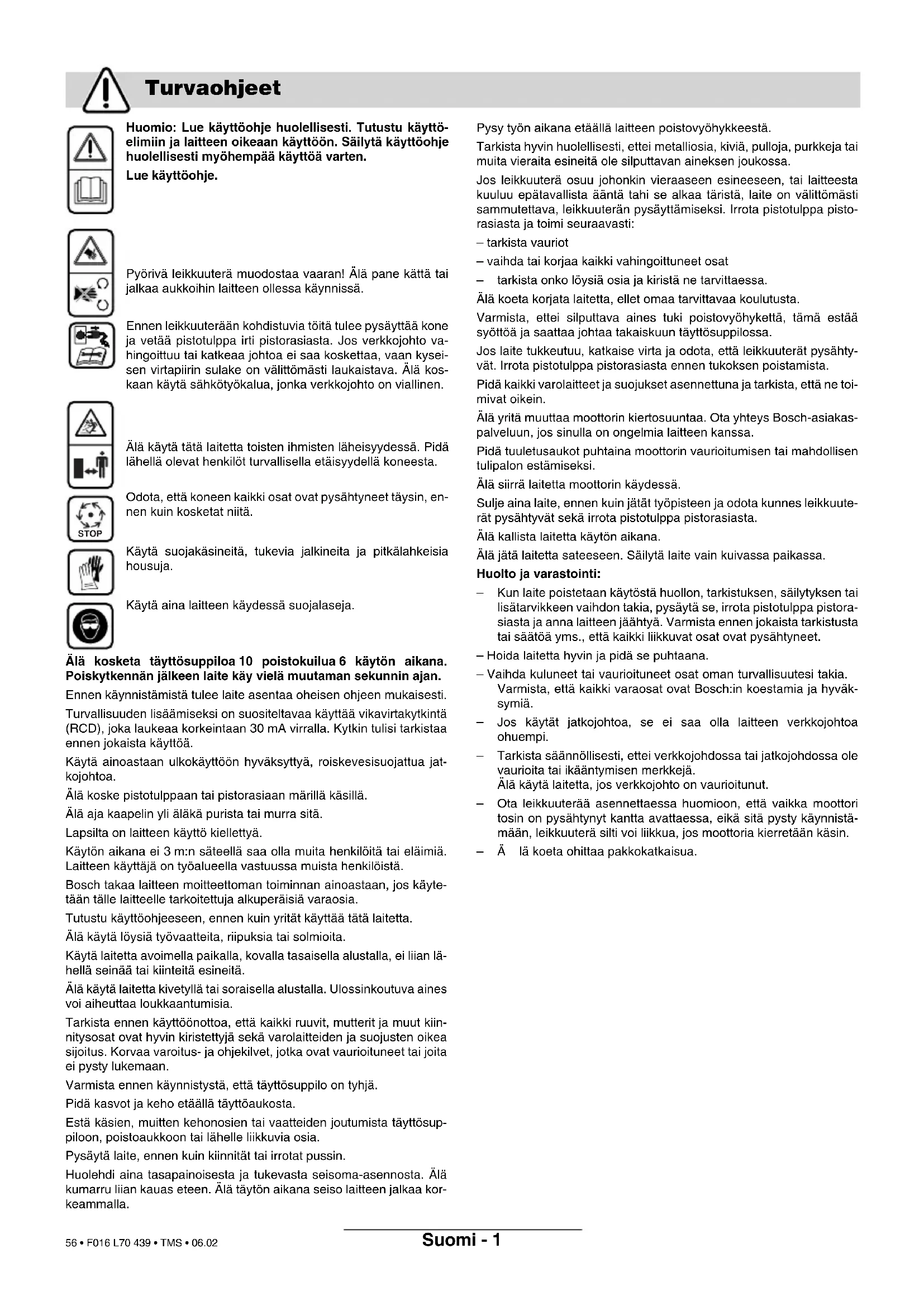 Samsvarserklæring F016 L70 439 - book.book Seite 5 Dienstag, 28. Februar 2006 7:57 07 55 • F016 L70 439 • TMS • 06.02Suomi - 1 Huomio: Lue käyttöohje huolellisesti. Tutustu käyttö- elimiin ja laitteen oikeaan käyttöön. Säilytä käyttöohje huolellisesti myöhempää käyttöä varten. Lue käyttöohje. Pyörivä leikkuuterä muodostaa vaaran! Älä pane kättä tai jalkaa aukkoihin laitteen ollessa käynnissä. Ennen leikkuuterään kohdistuvia töitä tulee pysäyttää kone ja vetää pistotulppa irti pistorasiasta. Jos verkkojohto va- hingoittuu tai katkeaa johtoa ei saa koskettaa, vaan kysei- sen virtapiirin sulake on välittömästi laukaistava. Älä kos- kaan käytä sähkötyökalua, jonka verkkojohto on viallinen. Älä käytä tätä laitetta toisten ihmisten läheisyydessä. Pidä lähellä olevat henkilöt turvallisella etäisyydellä koneesta. Odota, että koneen kaikki osat ovat pysähtyneet täysin, en- nen kuin kosketat niitä. Käytä suojakäsineitä, tukevia jalkineita ja pitkälahkeisia housuja. Käytä aina laitteen käydessä suojalaseja. Älä kosketa täyttösuppiloa 10 poistokuilua 6 käytön aikana. Poiskytkennän jälkeen laite käy vielä muutaman sekunnin ajan. Ennen käynnistämistä tulee laite asentaa oheisen ohjeen mukaisesti. Turvallisuuden lisäämiseksi on suositeltavaa käyttää vikavirtakytkintä (RCD), joka laukeaa korkeintaan 30 mA virralla. Kytkin tulisi tarkistaa ennen jokaista käyttöä. Käytä ainoastaan ulkokäyttöön hyväksyttyä, roiskevesisuojattua jat- kojohtoa. Älä koske pistotulppaan tai pistorasiaan märillä käsillä. Älä aja kaapelin yli äläkä purista tai murra sitä. Lapsilta on laitteen käyttö kiellettyä. Käytön aikana ei 3 m:n säteellä saa olla muita henkilöitä tai eläimiä. Laitteen käyttäjä on työalueella vastuussa muista henkilöistä. Bosch takaa laitteen moitteettoman toiminnan ainoastaan, jos käyte- tään tälle laitteelle tarkoitettuja alkuperäisiä varaosia. Tutustu käyttöohjeeseen, ennen kuin yrität käyttää tätä laitetta. Älä käytä löysiä työvaatteita, riipuksia tai solmioita. Käytä laitetta avoimella paikalla, kovalla tasaisella alustalla, ei liian lä- hellä seinää tai kiinteitä esineitä. Älä käytä laitetta kivetyllä tai soraisella alustalla. Ulossinkoutuva aines voi aiheuttaa loukkaantumisia. Tarkista ennen käyttöönottoa, että kaikki ruuvit, mutterit ja muut kiin- nitysosat ovat hyvin kiristettyjä sekä varolaitteiden ja suojusten oikea sijoitus. Korvaa varoitus- ja ohjekilvet, jotka ovat vaurioituneet tai joita ei pysty lukemaan. Varmista ennen käynnistystä, että täyttösuppilo on tyhjä. Pidä kasvot ja keho etäällä täyttöaukosta. Estä käsien, muitten kehonosien tai vaatteiden joutumista täyttösup- piloon, poistoaukkoon tai lähelle liikkuvia osia. Pysäytä laite, ennen kuin kiinnität tai irrotat pussin. Huolehdi aina tasapainoisesta ja tukevasta seisoma-asennosta. Älä kumarru liian kauas eteen. Älä täytön aikana seiso laitteen jalkaa kor- keammalla. Pysy työn aikana etäällä laitteen poistovyöhykkeestä. Tarkista hyvin huolellisesti, ettei metalliosia, kiviä, pulloja, purkkeja tai muita vieraita esineitä ole silputtavan aineksen joukossa. Jos leikkuuterä osuu johonkin vieraaseen esineeseen, tai laitteesta kuuluu epätavallista ääntä tahi se alkaa täristä, laite on välittömästi sammutettava, leikkuuterän pysäyttämiseksi. Irrota pistotulppa pisto- rasiasta ja toimi seuraavasti: – tarkista vauriot – vaihda tai korjaa kaikki vahingoittuneet osat – tarkista onko löysiä osia ja kiristä ne tarvittaessa. Älä koeta korjata laitetta, ellet omaa tarvittavaa koulutusta. Varmista, ettei silputtava aines tuki poistovyöhykettä, tämä estää syöttöä ja saattaa johtaa takaiskuun täyttösuppilossa. Jos laite tukkeutuu, katkaise virta ja odota, että leikkuuterät pysähty- vät. Irrota pistotulppa pistorasiasta ennen tukoksen poistamista. Pidä kaikki varolaitteet ja suojukset asennettuna ja tarkista, että ne toi- mivat oikein. Älä yritä muuttaa moottorin kiertosuuntaa. Ota yhteys Bosch-asiakas- palveluun, jos sinulla on ongelmia laitteen kanssa. Pidä tuuletusaukot puhtaina moottorin vaurioitumisen tai mahdollisen tulipalon estämiseksi. Älä siirrä laitetta moottorin käydessä. Sulje aina laite, ennen kuin jätät työpisteen ja odota kunnes leikkuute- rät pysähtyvät sekä irrota pistotulppa pistorasiasta. Älä kallista laitetta käytön aikana. Älä jätä laitetta sateeseen. Säilytä laite vain kuivassa paikassa. Huolto ja varastointi: – Kun laite poistetaan käytöstä huollon, tarkistuksen, säilytyksen tai lisätarvikkeen vaihdon takia, pysäytä se, irrota pistotulppa pistora- siasta ja anna laitteen jäähtyä. Varmista ennen jokaista tarkistusta tai säätöä yms., että kaikki liikkuvat osat ovat pysähtyneet. – Hoida laitetta hyvin ja pidä se puhtaana. – Vaihda kuluneet tai vaurioituneet osat oman turvallisuutesi takia. Varmista, että kaikki varaosat ovat Bosch:in koestamia ja hyväk- symiä. – Jos käytät jatkojohtoa, se ei saa olla laitteen verkkojohtoa ohuempi. – Tarkista säännöllisesti, ettei verkkojohdossa tai jatkojohdossa ole vaurioita tai ikääntymisen merkkejä. Älä käytä laitetta, jos verkkojohto on vaurioitunut. – Ota leikkuuterää asennettaessa huomioon, että vaikka moottori tosin on pysähtynyt kantta avattaessa, eikä sitä pysty käynnistä- mään, leikkuuterä silti voi liikkua, jos moottoria kierretään käsin. –Älä koeta ohittaa pakkokatkaisua. Turvaohjeet STOP F016 L70 439 - book.book Seite 1 Dienstag, 28. Februar 2006 7:57 07 56 • F016 L70 439 • TMS • 06.02Suomi - 2