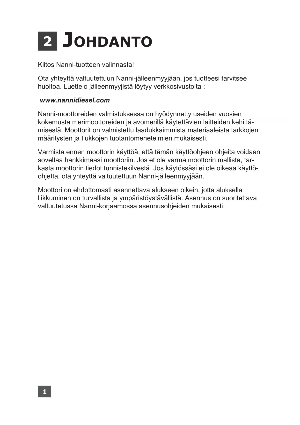 - Tekniset tiedot SISÄLTÖ 1Kiitos Nanni-tuotteen valinnasta! Ota yhteyttä valtuutettuun Nanni-jälleenmyyjään, jos tuotteesi tarvitsee huoltoa. Luettelo jälleenmyyjistä löytyy verkkosivustolta : www.nannidiesel.com Nanni-moottoreiden valmistuksessa on hyödynnetty useiden vuosien kokemusta merimoottoreiden ja avomerillä käytettävien laitteiden kehittä- misestä. Moottorit on valmistettu laadukkaimmista materiaaleista tarkkojen määritysten ja tiukkojen tuotantomenetelmien mukaisesti. Varmista ennen moottorin käyttöä, että tämän käyttöohjeen ohjeita voidaan soveltaa hankkimaasi moottoriin. Jos et ole varma moottorin mallista, tar- kasta moottorin tiedot tunnistekilvestä. Jos käytössäsi ei ole oikeaa käyttö- ohjetta, ota yhteyttä valtuutettuun Nanni-jälleenmyyjään. Moottori on ehdottomasti asennettava alukseen oikein, jotta aluksella liikkuminen on turvallista ja ympäristöystävällistä. Asennus on suoritettava valtuutetussa Nanni-korjaamossa asennusohjeiden mukaisesti. p. 61