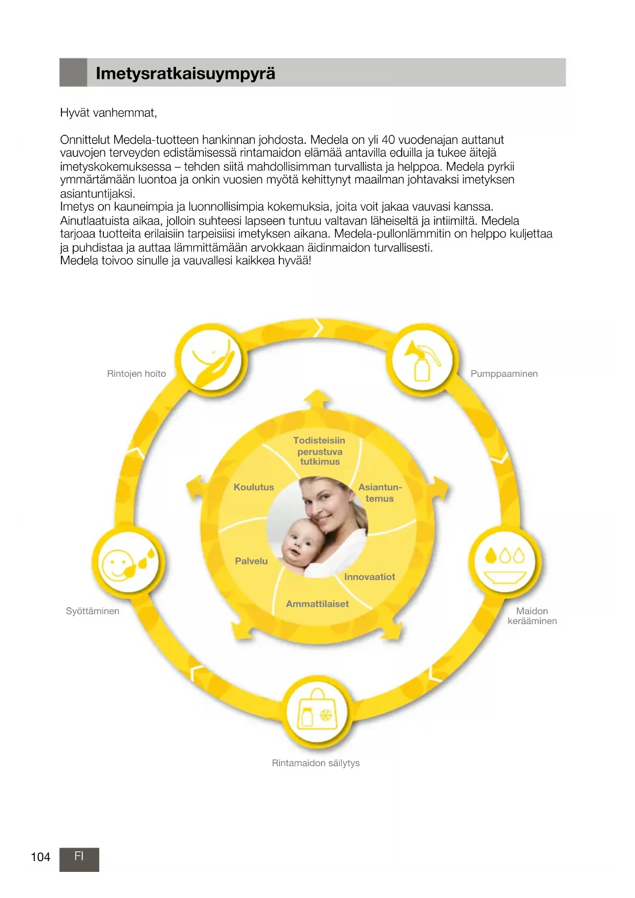 Imetysratkaisuympyrä Hyvät vanhemmat, Onnittelut Medela-tuotteen hankinnan johdosta. Medela on yli 40 vuodenajan auttanut vauvojen terveyden edistämisessä rintamaidon elämää antavilla eduilla ja tukee äitejä imetyskokemuksessa – tehden siitä mahdollisimman turvallista ja helppoa. Medela pyrkii ymmärtämään luontoa ja onkin vuosien myötä kehittynyt maailman johtavaksi imetyksen asiantuntijaksi. Imetys on kauneimpia ja luonnollisimpia kokemuksia, joita voit jakaa vauvasi kanssa. Ainutlaatuista aikaa, jolloin suhteesi lapseen tuntuu valtavan läheiseltä ja intiimiltä. Medela tarjoaa tuotteita erilaisiin tarpeisiisi imetyksen aikana. Medela-pullonlämmitin on helppo kuljettaa ja puhdistaa ja auttaa lämmittämään arvokkaan äidinmaidon turvallisesti. Medela toivoo sinulle ja vauvallesi kaikkea hyvää! Pumppaaminen Maidon kerääminen Rintamaidon säilytys Syöttäminen Rintojen hoito Innovaatiot Todisteisiin perustuva tutkimus Ammattilaiset Palvelu Asiantun- temus Koulutus105FI Tuotekatsaus Päälle/pois Valitse Enter