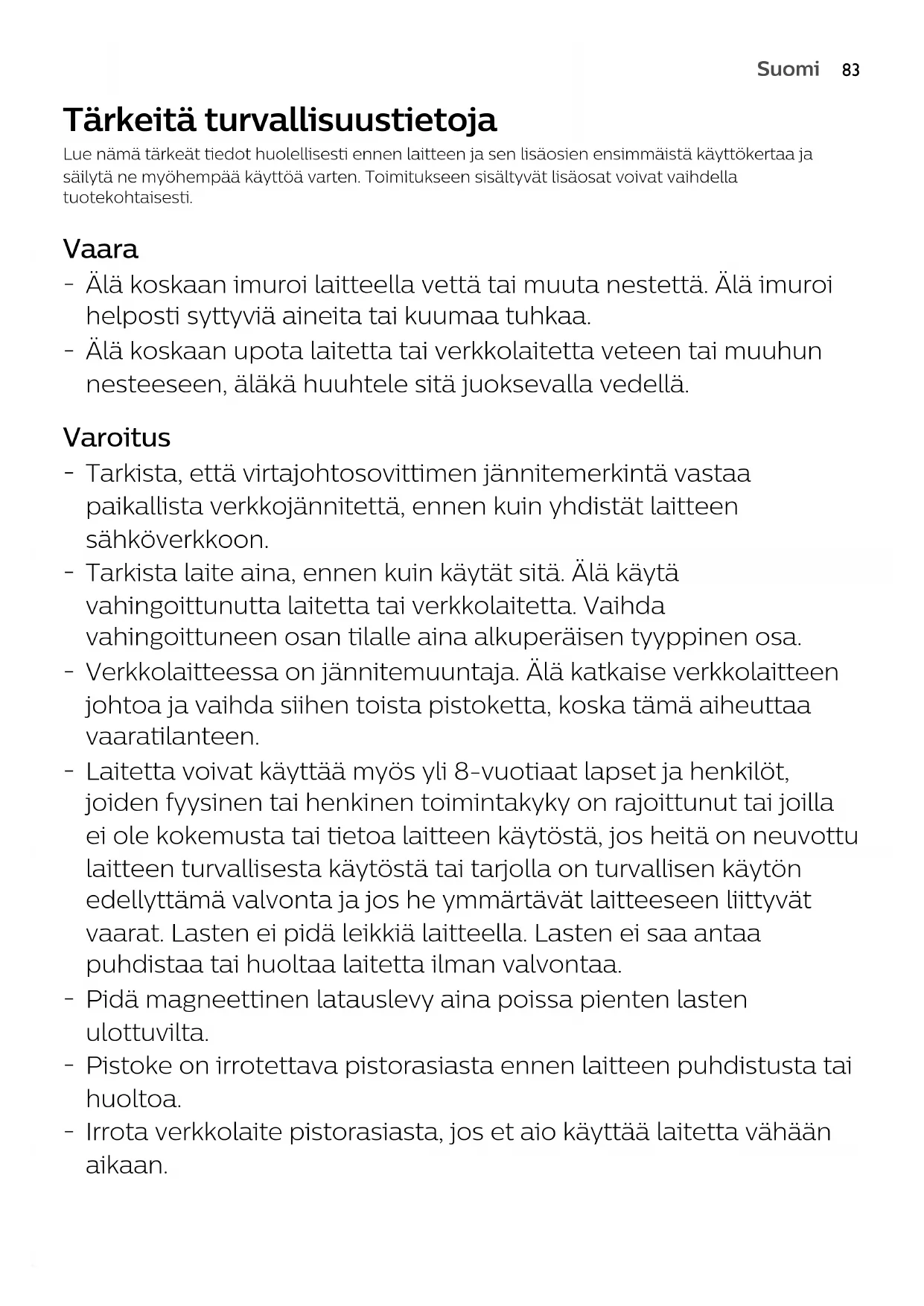 Älä koskaan imuroi laitteella vettä tai muuta nestettä. Älä imuroi helposti syttyviä aineita tai kuumaa tuhkaa.