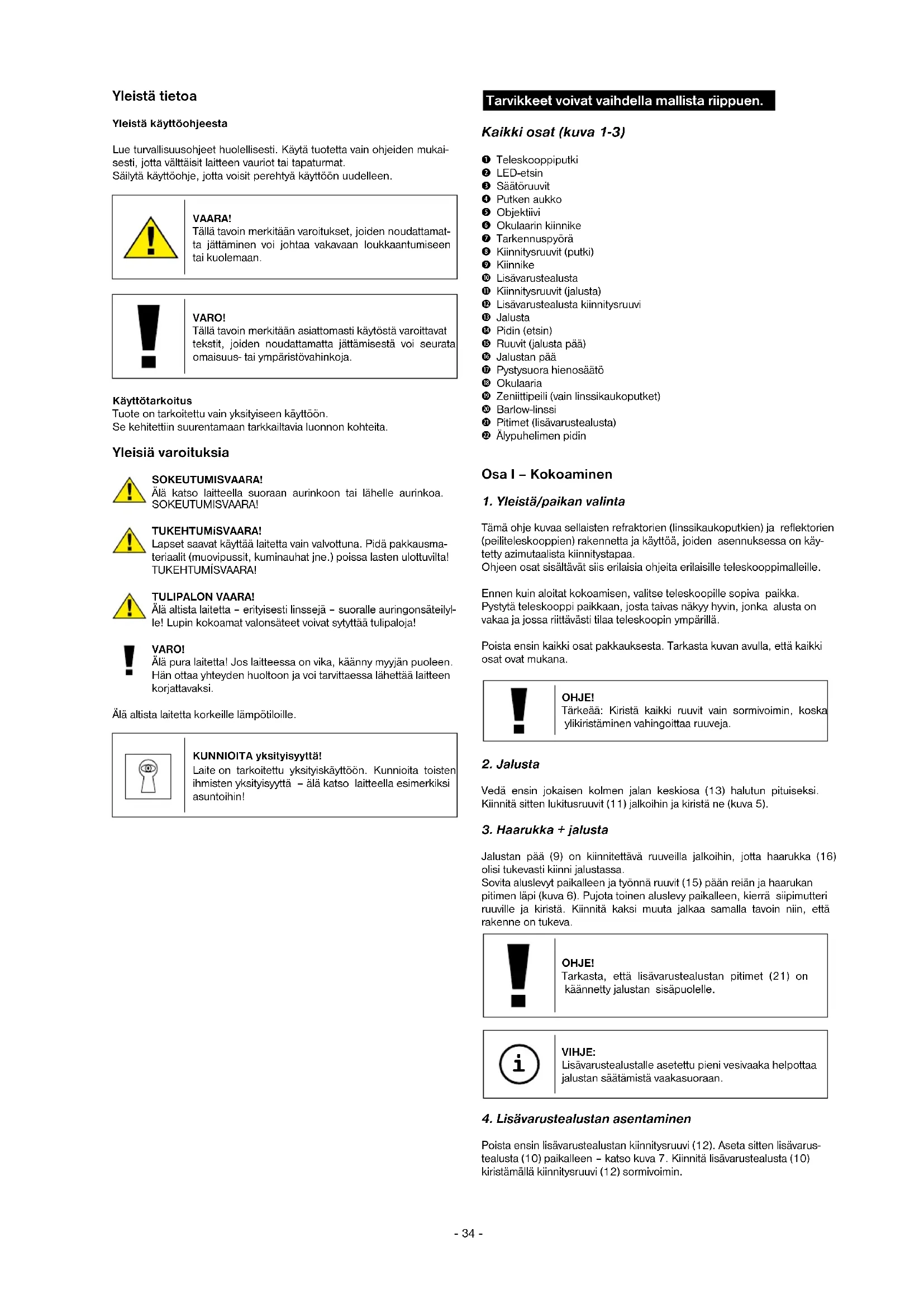 Tämä ohje kuvaa sellaisten refraktorien (linssikaukoputkien) ja reflektorien (peiliteleskooppien) rakennetta ja käyttöä, joiden asennuksessa on käy- tetty azimutaalista kiinnitystapaa. Ohjeen osat sisältävät siis erilaisia ohjeita erilaisille teleskooppimalleille. Ennen kuin aloitat kokoamisen, valitse teleskoopille sopiva paikka. Pystytä teleskooppi paikkaan, josta taivas näkyy hyvin, jonka alusta on vakaa ja jossa riittävästi tilaa teleskoopin ympärillä. Poista ensin kaikki osat pakkauksesta. Tarkasta kuvan avulla, että kaikki osat ovat mukana. OHJE! Tärkeää: Kiristä kaikki ruuvit vain sormivoimin, koska ylikiristäminen vahingoittaa ruuveja.