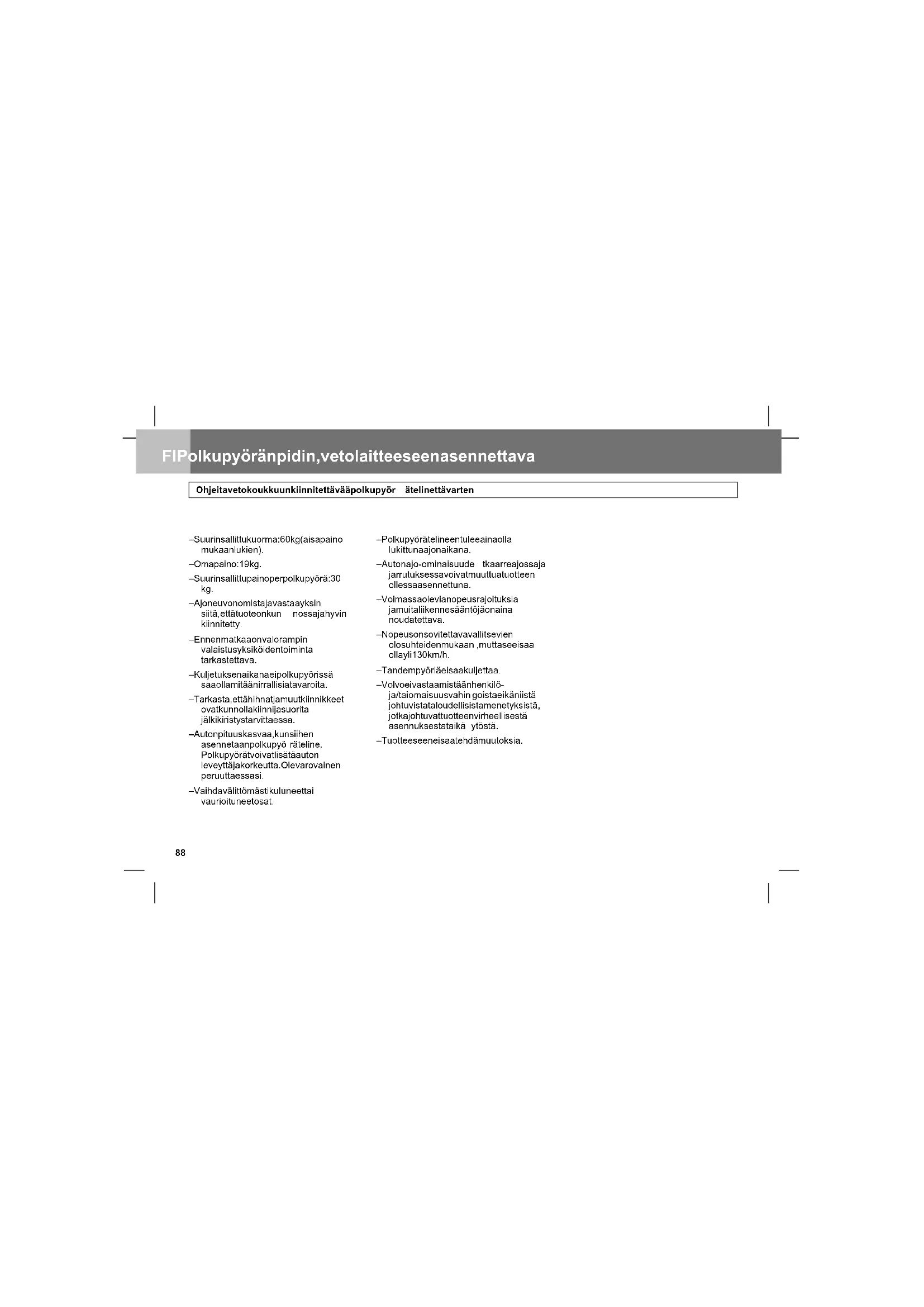 - Ramppi FI Polkupyöränpidin, vetolaitteeseen asennettava Ohjeita vetokoukkuun kiinnitettävää polkupyör ätelinettä varten – Suurin sallittu kuorma: 60 kg (aisapaino mukaan lukien). – Omapaino: 19 kg. – Suurin sallittu paino per polkupyörä: 30 kg. – Ajoneuvon omistaja vastaa yksin siitä, että tuote on kun nossa ja hyvin kiinnitetty. – Ennen matkaa on valorampin valaistusyksiköiden toiminta tarkastettava. – Kuljetuksen a ikana ei polkupyörissä saa olla mitään irrallisia tavaroita. – Tarkasta, että hihnat ja muut kiinnikkeet ovat ku nnolla kiinni ja suorita jälkikiristys tarvittaessa. – Auton pituus kasvaa, kun siihen asennetaan polkupyö räteline. Polkupyörät voivat lisätä auton leveyttä ja korkeutta. Ole varo v ainen peruuttaessasi. – Vaihda välittömästi k ul uneet tai vaurioituneet osat. – Polkupyöräte lineen tulee aina olla lukittuna ajon aikana. – Auton ajo-ominaisuude t kaarreajossa ja jarrutuksessa voivat muuttua tuotteen ollessa a sennettuna. – Voimassa olevia nopeusrajoituksia ja muita liikennesääntöjä o n aina noudatettava. – Nopeus on sovitettava v all itsevien olosuhteiden mukaan , mutta se ei saa olla yli 130 km/h. – Tandempyöriä ei saa kuljettaa. – Volvo ei vastaa mistään henkil ö- ja/tai omaisuusvahin goista eikä niistä johtuvista taloudellisista menetyksistä, jotka johtuvat tuotteen virheellise stä asennuksesta tai kä ytöstä. – Tuotteeseen ei saa tehdä mu utoksi a. 88Polkupyöränpidin, vetolaitteeseen asennettava FI Valmistelut p. 99