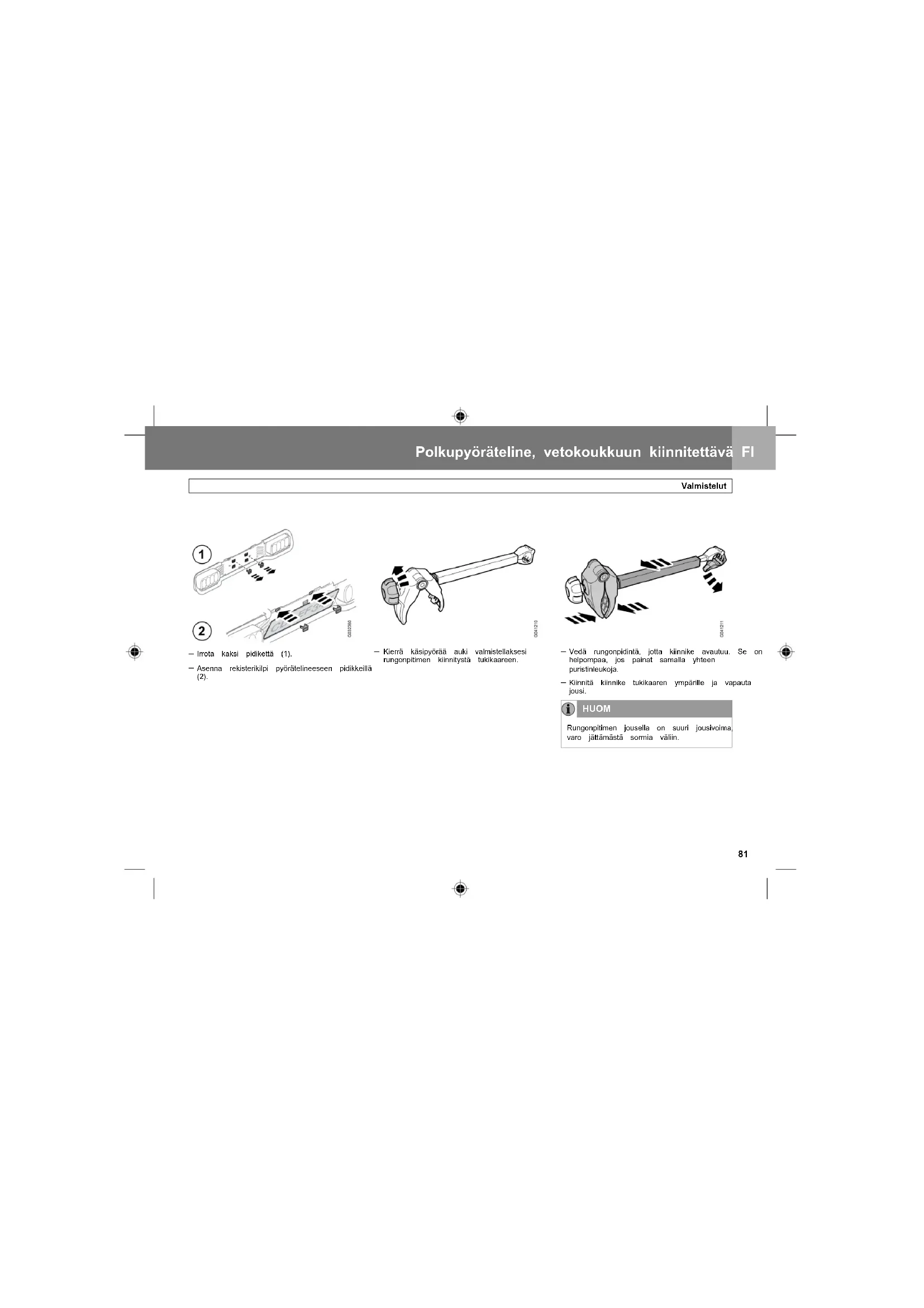 Kiinnitä kiinnike tukikaaren ympärille ja vapauta jousi. HUOM Rungonpitimen jousella on suuri jousivoima, varo jättämästä sormia väliin. Polkupyöräteline, vetokoukkuun kiinnitettävä FI Valmistelut