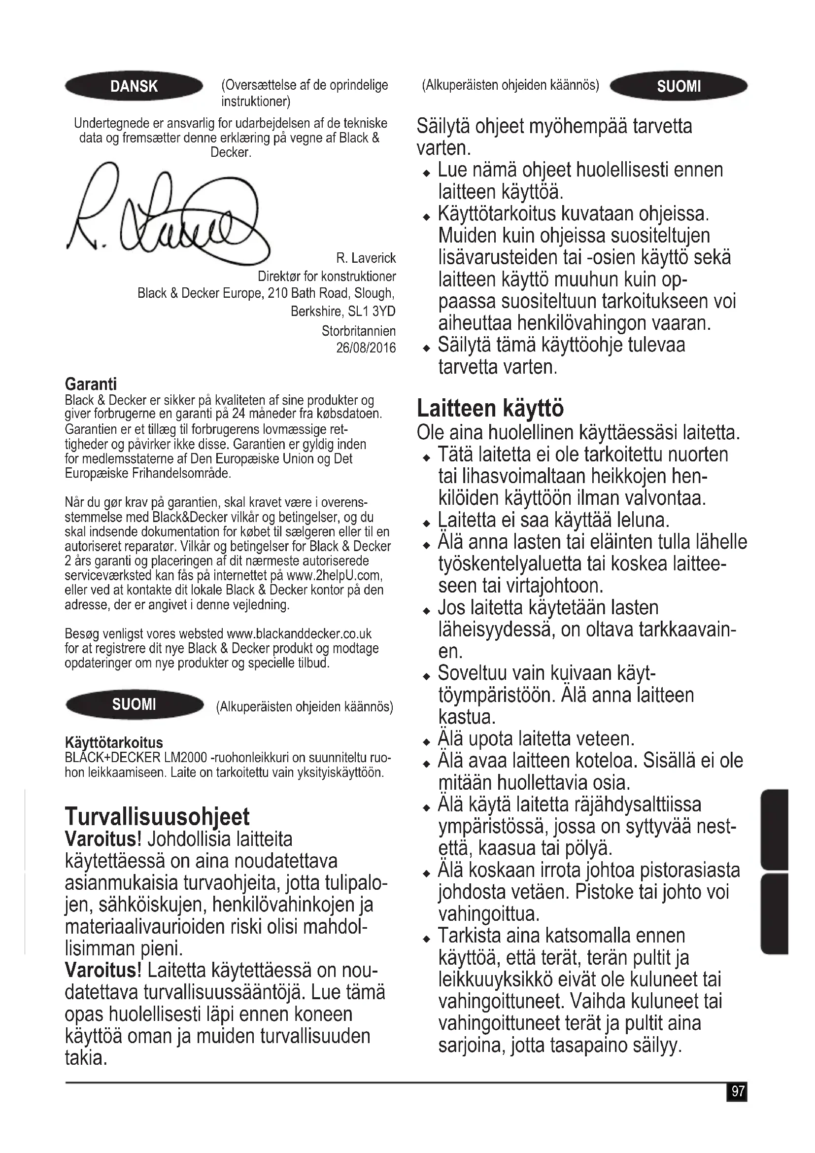 (garanteret lydeffekt) 96 dB(A) Disse produkter er endvidere i overensstemmelse med direktiv 2014/30/EU og 2011/65/EU. Kontakt Black & Decker på nedenstående adresse eller se vejledningens bagside for at få yderligere oplysninger.97 (Oversættelse af de oprindelige instruktioner) DANSK (Alkuperäisten ohjeiden käännös) SUOMI (Alkuperäisten ohjeiden käännös) SUOMI Undertegnede er ansvarlig for udarbejdelsen af de tekniske data og fremsætter denne erklæring på vegne af Black & Decker. R. Laverick Direktør for konstruktioner Black & Decker Europe, 210 Bath Road, Slough, Berkshire, SL1 3YD Storbritannien 26/08/2016 Garanti Black & Decker er sikker på kvaliteten af sine produkter og giver forbrugerne en garanti på 24 måneder fra købsdatoen. Garantien er et tillæg til forbrugerens lovmæssige ret- tigheder og påvirker ikke disse. Garantien er gyldig inden for medlemsstaterne af Den Europæiske Union og Det Europæiske Frihandelsområde. Når du gør krav på garantien, skal kravet være i overens- stemmelse med Black&Decker vilkår og betingelser, og du skal indsende dokumentation for købet til sælgeren eller til en autoriseret reparatør. Vilkår og betingelser for Black & Decker 2 års garanti og placeringen af dit nærmeste autoriserede serviceværksted kan fås på internettet på www.2helpU.com, eller ved at kontakte dit lokale Black & Decker kontor på den adresse, der er angivet i denne vejledning. Besøg venligst vores websted www.blackanddecker.co.uk for at registrere dit nye Black & Decker produkt og modtage opdateringer om nye produkter og specielle tilbud. Käyttötarkoitus BLACK+DECKER LM2000 -ruohonleikkuri on suunniteltu ruo- hon leikkaamiseen. Laite on tarkoitettu vain yksityiskäyttöön. Turvallisuusohjeet Varoitus! Johdollisia laitteita käytettäessä on aina noudatettava asianmukaisia turvaohjeita, jotta tulipalo- jen, sähköiskujen, henkilövahinkojen ja materiaalivaurioiden riski olisi mahdol- lisimman pieni. Varoitus! Laitetta käytettäessä on nou- datettava turvallisuussääntöjä. Lue tämä opas huolellisesti läpi ennen koneen käyttöä oman ja muiden turvallisuuden takia. Säilytä ohjeet myöhempää tarvetta varten. u Lue nämä ohjeet huolellisesti ennen laitteen käyttöä. u Käyttötarkoitus kuvataan ohjeissa. Muiden kuin ohjeissa suositeltujen lisävarusteiden tai -osien käyttö sekä laitteen käyttö muuhun kuin op- paassa suositeltuun tarkoitukseen voi aiheuttaa henkilövahingon vaaran. u Säilytä tämä käyttöohje tulevaa tarvetta varten. Laitteen käyttö Ole aina huolellinen käyttäessäsi laitetta. u Tätä laitetta ei ole tarkoitettu nuorten tai lihasvoimaltaan heikkojen hen- kilöiden käyttöön ilman valvontaa. u Laitetta ei saa käyttää leluna. u Älä anna lasten tai eläinten tulla lähelle työskentelyaluetta tai koskea laittee- seen tai virtajohtoon. u Jos laitetta käytetään lasten läheisyydessä, on oltava tarkkaavain- en. u Soveltuu vain kuivaan käyt- töympäristöön. Älä anna laitteen kastua. u Älä upota laitetta veteen. u Älä avaa laitteen koteloa. Sisällä ei ole mitään huollettavia osia. u Älä käytä laitetta räjähdysalttiissa ympäristössä, jossa on syttyvää nest- että, kaasua tai pölyä. u Älä koskaan irrota johtoa pistorasiasta johdosta vetäen. Pistoke tai johto voi vahingoittua. u Tarkista aina katsomalla ennen käyttöä, että terät, terän pultit ja leikkuuyksikkö eivät ole kuluneet tai vahingoittuneet. Vaihda kuluneet tai vahingoittuneet terät ja pultit aina sarjoina, jotta tasapaino säilyy.98 (Alkuperäisten ohjeiden käännös) SUOMI u Jotta lämpörajoitin ei nollautuisi vahi- ngossa ja vaaratilanteet vältettäisiin, tähän laitteeseen ei saa syöttää virtaa ulkoisesta kytkentälaitteesta (esim. ajastin) eikä sitä saa liittää virtapiiriin, joka kytketään säännöllisesti päälle ja pois päältä. Käytön jälkeen u Kun laitetta ei käytetä, säilytä sitä kuivassa, hyvin tuuletetussa paikassa poissa lasten ulottuvilta. u Pidä laite lasten ulottumattomissa. u Kun laitetta säilytetään tai kuljetetaan ajoneuvossa, sijoita se tavaratilaan tai kiinnitä se kunnolla, ettei se matkan aikana pääse liikkumaan. Tarkastus ja korjaus u Tarkista ennen laitteen käyttöä, ettei laitteessa ole vahingoittuneita tai vial- lisia osia. Tarkista osien ja kytkimien kunto sekä muut seikat, jotka voivat vaikuttaa laitteen toimintaan. u Älä käytä laitetta, jos jokin osa on vahingoittunut tai viallinen. u Korjauta tai vaihdata vaurioituneet tai vialliset osat valtuutetussa huoltoliik- keessä. u Älä yritä korjata tai vaihtaa muita kuin tässä käyttöohjeessa erikseen määrit- eltyjä osia. u Varo leikkuria säädettäessä, että sormesi eivät jää liikkuvien terien/osien ja kiinteästi asennettujen osien väliin. u Muista teriä huollettaessa, että vaikka virtalähde on sammutettu, terät liik- kuvat edelleen. Ruohonleikkurien lisäturvaohjeet u Pidä ruohonleikkuria työntöaisasta tuk- evasti molemmin käsin käytön aikana. u Jos joudut käytön aikana kallistamaan ruohonleikkuria, pidä molemmat kädet koko ajan ajoasennossa. Pidä molem- mat kädet ajoasennossa niin kauan, kunnes ruohonleikkuri on jälleen normaaliasennossa. u Älä käytä radiota tai kuulokkeita ruo- honleikkurin käytön aikana. u Älä koskaan säädä pyörien korkeutta moottorin käydessä tai turva-avaimen ollessa paikallaan kytkentäkotelossa. u Jos ruohonleikkuri pysähtyy, sammuta leikkuri vapauttamalla kahva, odota terän pysähtymistä ennen kuin yrität avata tukoksen tai poistaa mitään kan- nen alta. u Pidä kädet ja jalat poissa leikkausal- ueelta. u Pidä terät terävinä. Käytä aina suo- jakäsineitä käsitellessäsi ruohonleik- kurin terää. u Jos käytät keräyssäiliötä, tarkista säännöllisesti, ettei se ole kulunut tai rikkoutunut. Jos keräyssäiliö on hyvin kulunut, vaihda se uuteen turvallisu- uden vuoksi. u Ole erittäin varovainen ve
