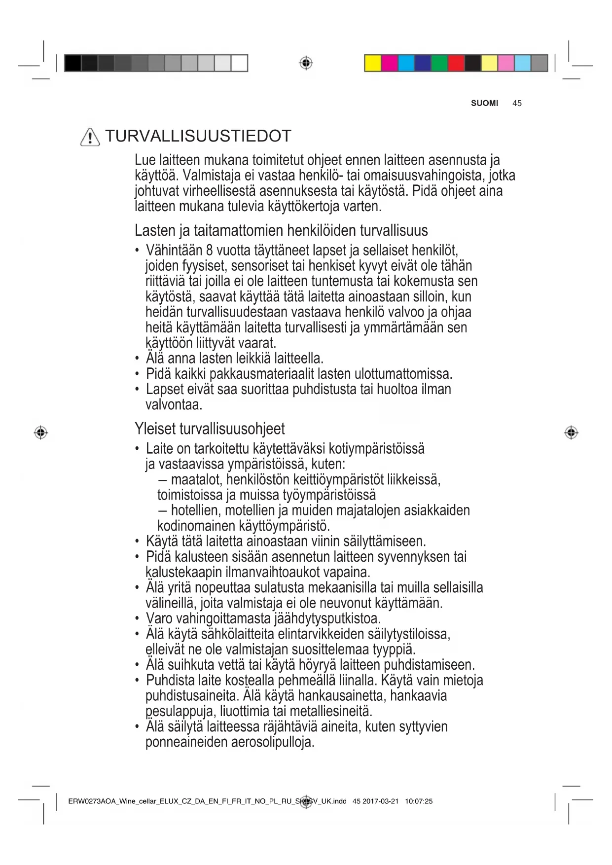ERW0273AOA_Wine_cellar_ELUX_CZ_DA_EN_FI_FR_IT_NO_PL_RU_SK_SV_UK.indd 44 2017-03-21 10:07:2545 SUOMI Lue laitteen mukana toimitetut ohjeet ennen laitteen asennusta ja käyttöä. Valmistaja ei vastaa henkilö- tai omaisuusvahingoista, jotka johtuvat virheellisestä asennuksesta tai käytöstä. Pidä ohjeet aina laitteen mukana tulevia käyttökertoja varten. Lasten ja taitamattomien henkilöiden turvallisuus
