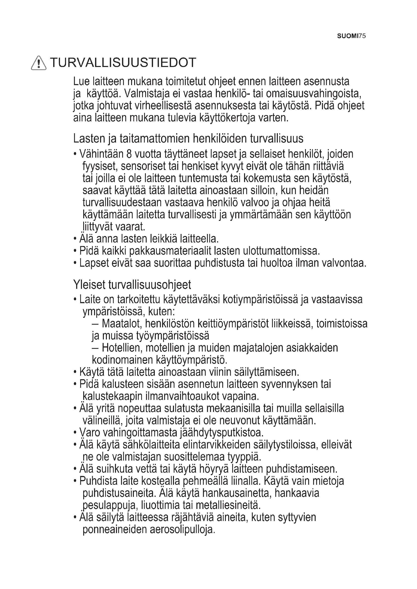 - Lapset eivät saa suorittaa puhdistusta tai huoltoa ilman valvontaa. Yleiset turvallisuusohjeet
