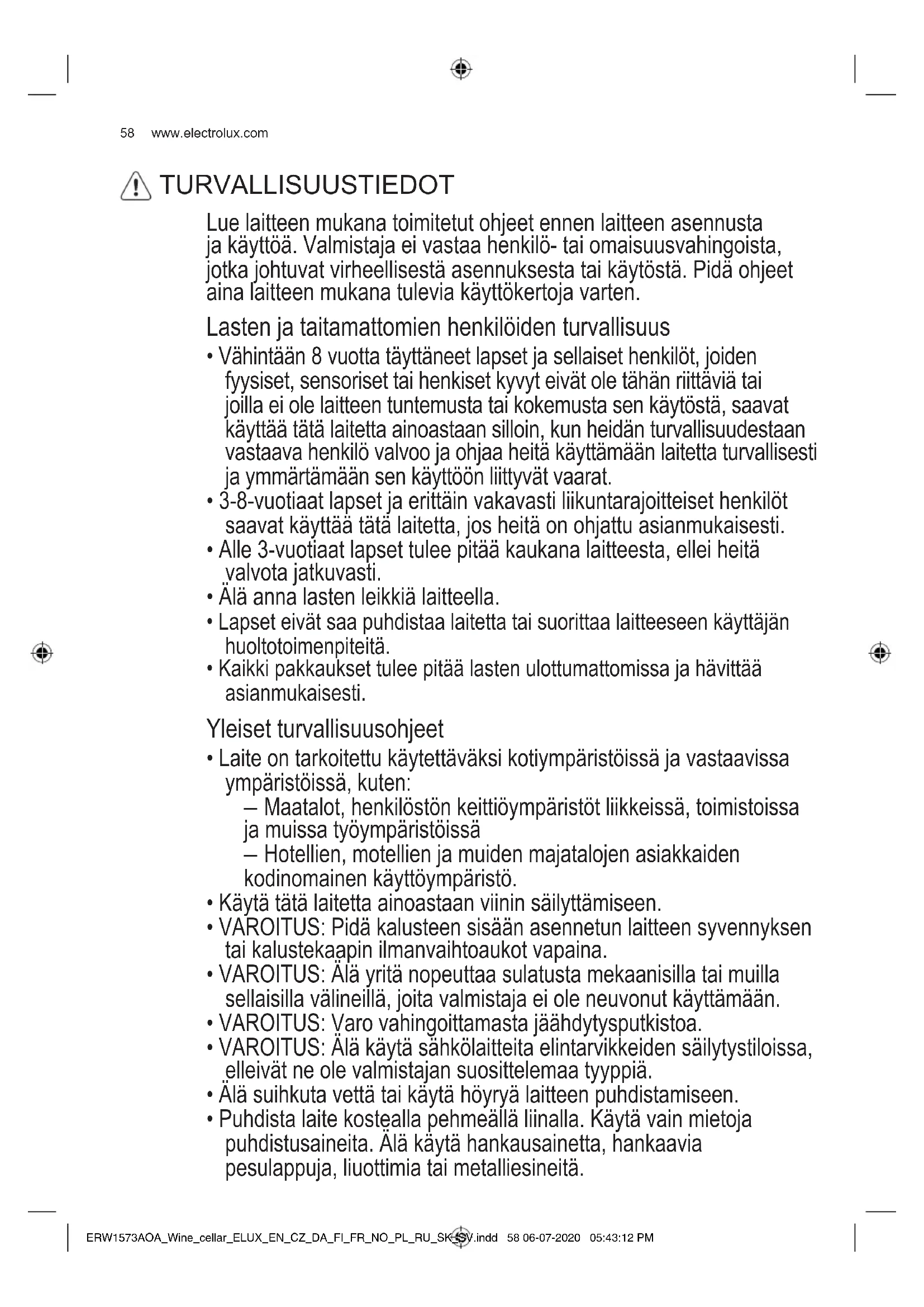 - Puhdista laite kostealla pehmeällä liinalla. Käytä vain mietoja puhdistusaineita. Älä käytä hankausainetta, hankaavia pesulappuja, liuottimia tai metalliesineitä. TURVALLISUUSTIEDOT ERW1573AOA_Wine_cellar_ELUX_EN_CZ_DA_FI_FR_NO_PL_RU_SK_SV.indd 58 06-07-2020 05:43:12 PMSUOMI