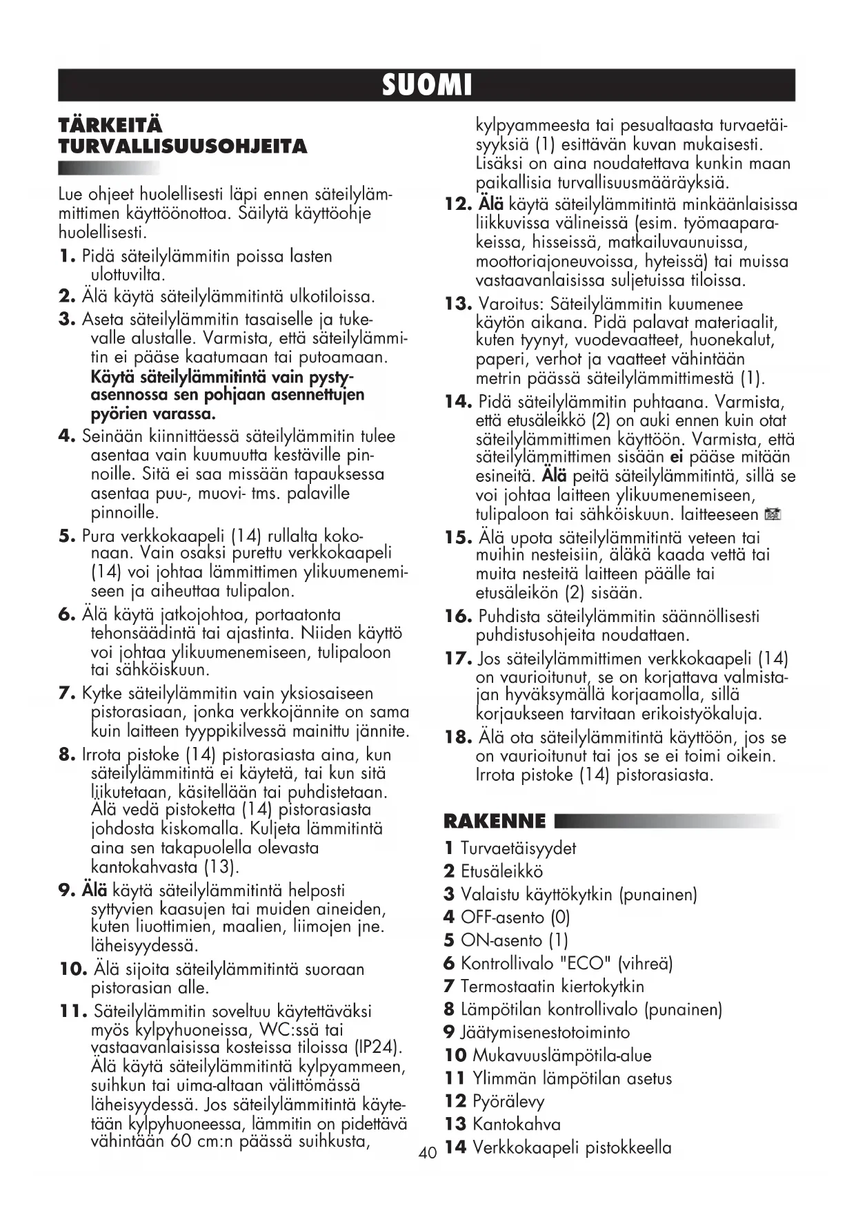 on vaurioitunut tai jos se ei toimi oikein. Irrota pistoke (14) pistorasiasta. RAKENNE 1 Turvaetäisyydet 2 Etusäleikkö 3 Valaistu käyttökytkin (punainen) 4 OFF-asento (0) 5 ON-asento (1) 6 Kontrollivalo "ECO" (vihreä) 7 Termostaatin kiertokytkin 8 Lämpötilan kontrollivalo (punainen) 9 Jäätymisenestotoiminto 10 Mukavuuslämpötila-alue 11 Ylimmän lämpötilan asetus 12 Pyörälevy 13 Kantokahva 14 Verkkokaapeli pistokkeella 40SUOMI 15 Kiinnike seinätelinettä varten 16 Seinäteline 17 Ruuvit 18 Tapit ENSIMMÄINEN
