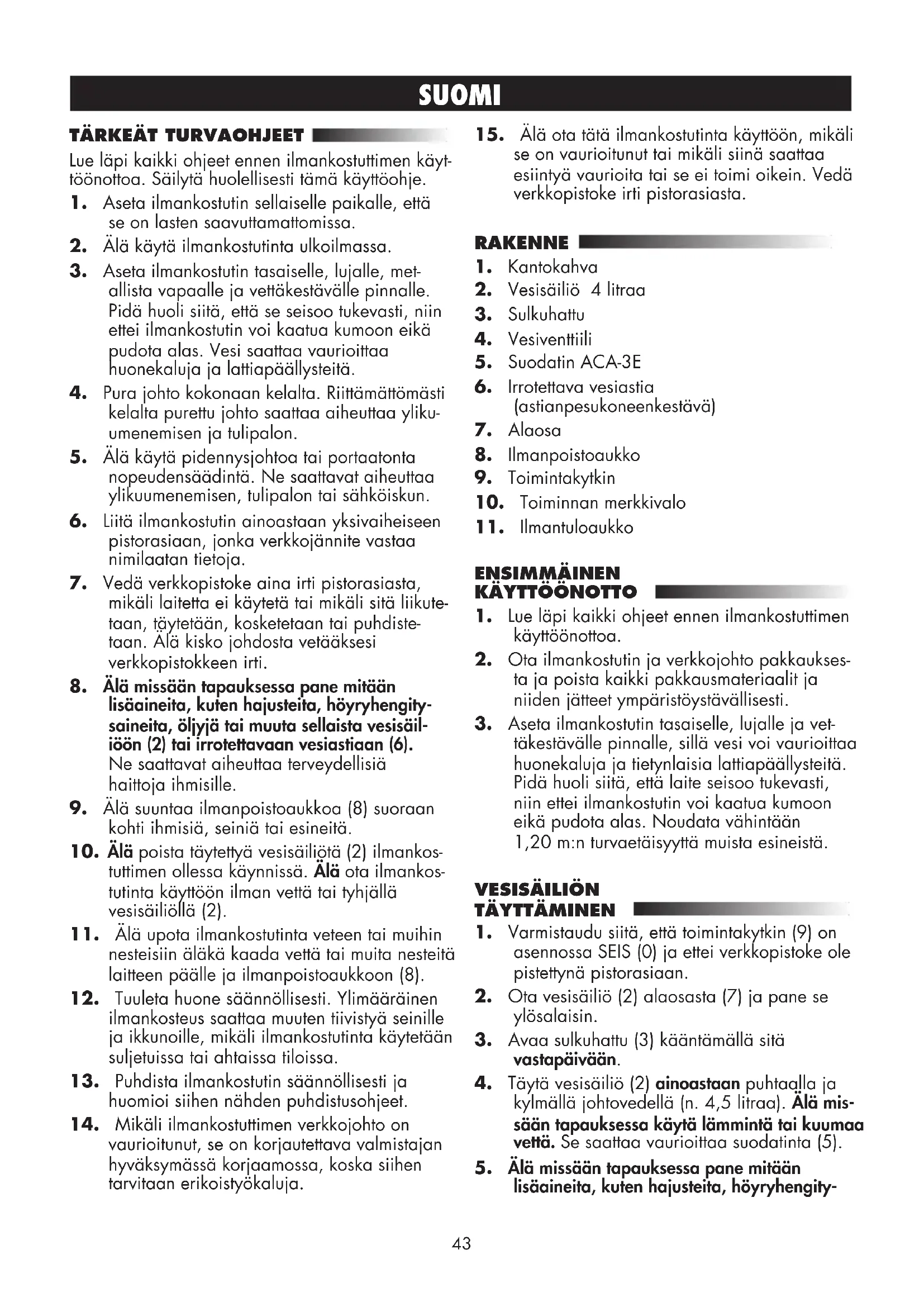 lisäaineita, kuten hajusteita, höyryhengity-44 SUOMI saineita, öljyjä tai muuta sellaista vesisäil- iöön (2), irrotettavaan vesiastiaan (6) ja suodattimelle (5). Ne saattavat aiheuttaa terveydellisiä haittoja.