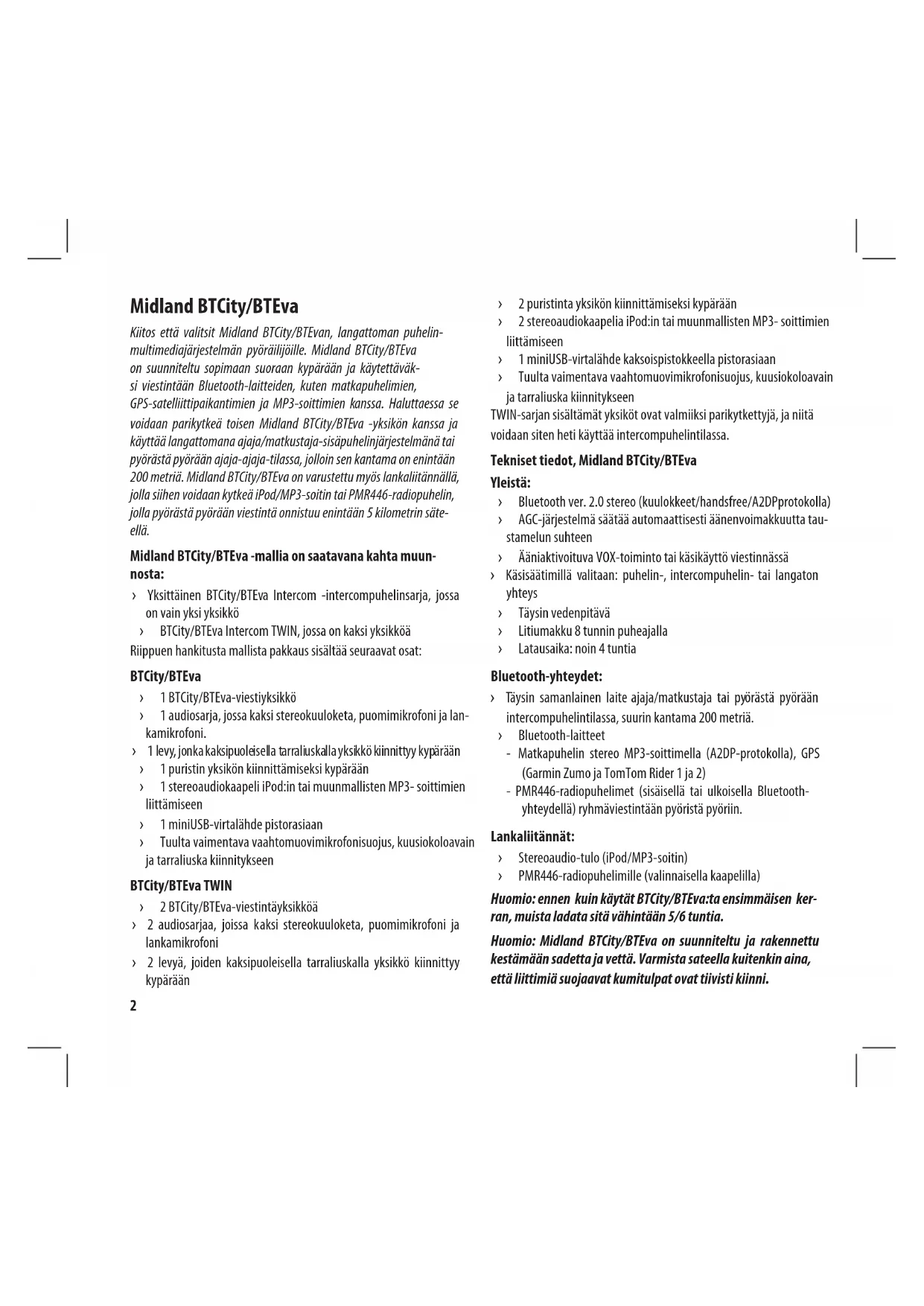Paina kahdesti “Control” painiketta. Punainen valo menee pois päältä ja sininen valo alkaa vilkkua. Voit nyt käyttää BTCity/BTEva- laitettasi. Intercom-puhelintoiminto Intercompuhelintoimintoa voi käyttää kahdella tavalla: Käyttäjä käynnistää: › Paina Control-painiketta toisessa kahdesta laitteesta. Viestikanava avautuu ja pysyy toiminnassa, kunnes painat Control-painiketta uudestaan. Öaite antaa yhden äänimerkin intercompuhelintoi- minnon alkaessa ja kaksi äänimerkkiä sen päättyessä. Ääniaktivointi (VOX): › Tämä on oletuskäyttötapa. Erillispuhelutoiminto aloitetaan yksin- kertaisesti aloittamalla puhe. Huomio: ensimmäinen intercom-yhteyden aktivointi täytyy te- hdä manuaalisesti control-näppäimellä. Sen jälkeen ääniakti- vointi on käytössä. › Jos mitään keskustelua ei kuulu, intercompuhelintoiminto katke- aa automaattisesti 20 sekunnin kuluttua. › Se saadaan uudestaan käyttöön aloittamalla yksinkertaisesti puhe uudestaan. Erillispuheluiden ääniaktivoinnin voi keskeyttää halu- tessaan ennen esiasetettua aikaa painamalla Controlpainiketta kerran. › Ääniaktivointitilan kytkemiseksi kokonaan pois käytöstä noudata luvussa ”Erityiskokoonpanot” esitettyjä ohjeita.8 Intercom ja GPS Jos BTCity/BTEva on liitetty GPS:ään, Intercom-ominaisuus ei mene pois päältä, kun GPS puhuu. Intercom- ja GPS-toiminnot toimivat samanaikaisesti. Sama koskee puheluja, kun matkapuhelin on liitetty GPS:ään. Tästä toiminnosta johtuen, kun puhelin on liitetty GPS:ään, kaikki puhelut eivät välttämättä toimi kunnolla. Tässä tapauksessa voit poistaa “Intercom+GPS “ ominaisuuden ja kuunnella GPS:n puhetta tai puhelinsoittoa ilman häiriöitä. (katso “Erityiskonguraatio” osio) Ensisijaisuus: Puhelun aikana: Intercom-toiminto keskeytetään puhelun aikana. Toiminto jatkuu automaattisesti kun puhelu päättyy. Musiikin toiston aikana: Bluetoothin kautta toistettu musiikki ke- skeytetään Intercom-toiminnon ollessa käytössä. GPS-navigaattorin ollessa käytössä: GPS-navigaattorin ilmoitukset kuuluvat taustalla, samalla kun Intercom-keskustelu on käynnissä. Kantomatka Kaksi Midland BTCity/BTEva-yksikköä voivat viestiä noin 200 metrin maksimialueella ulkona. Maksimikattavuus riippuu alueella olevista esteistä ja pään asennosta. Kaikkien parikytkettyjen laitteiden nollaus Joskus on tarpeen poistaa kaikki BTCity/BTEva-laitteeseen tallennetut parikytkentäviitteet (nollaustoiminto). › Käännä BTCity/BTEva pois päältä ja pidä “Control” painike painet- tuna tämän toiminnon suorittamista varten. Punainen valo syttyy. › Sen jälkeen paina samanaikaisesti ”VOL+ ja ”VOL-”-voimakku- uspainikkeita 4 sekuntia. Sininen merkkivalo syttyy 1 sekunnin ajaksi. Tämä menettely poistaa kaikki muistiin tallennetut Bluetoothlait- teiden parikytkennät, jolloin on mahdollista aloittaa uusi ”puhdas” parikytkentäistunto. Audiolankatuloliitännän käyttö Midland BTCity/BTEva on varustettu myös lanka-audiotulolla (merkit- ty AUX), jota voidaan käyttää audiolähteen liittämistä varten, kuten esimerkiksi iPod (tai mikä tahansa muu MP3-soitin) tai PMR446- radiopuhelin ryhmäviestintään tai kattavuuden lisäämiseksi. Lanka- audiotulo mahdollistaa suuremman kattavuusalueen Bluetooth- teknologiaan nähden. Etusija: lankaäänitulolla on alhaisempi etusija verrattuna muihin Blue- tooth-yhteyksiin (intercompuhelin mukaan lukien), ja siten se on aina katkaistuna pois käytöstä, kun jonkin Bluetoothviestintäyhteys on auki. I-Pod/MP3 käyttö Musiikin kuuntelu Musiikin kuuntelemiseksi lankatuloliittimen kautta liitä äänilähde BTCity/BTEva-laitteen mukana tulleella kaapelilla. AGC-järjestelmä muuttaa äänenvoimakkuutta, jolloin käyttäjän tarvitsee säätää ai- noastaan iPod/MP3-soittimen äänenvoimakkuus tasolle, joka sallii musiikin kuuntelon normaali nopeudella. Äänenvoimakkuutta iPod/MP3 soittimesta ei saa milloinkaan asettaa täydelle teholle Vinkki: suositamme, että teet muutaman testin säätämällä iPod/MP3- soittimen voimakkuuden sellaiseksi, että normaalilla nopeudella kuu- lokkeiden äänenvoimakkuus sopii tarpeisiisi. AGC-järjestelmä nostaa automaattisesti äänenvoimakkuutta nopeuden kasvaessa. Huomio: äänenvoimakkuuden säätöpainikkeita (”Volume+” ja ”Volume –”) ei voi käyttää lankaäänilähteen voimakkuuden säätöön (esim. MP3-soitin). Lankatulon kytkeminen päälle/pois päältä Lankatulo voidaan kytkeä päälle ja pois päältä Kytkeminen päälle: › Klikkaa kahdesti “Control” painiketta(kuulet yhden vahvistu- säänen). › Kytkeminen pois päältä: klikkaa kahdesti “Control” painiketta(kuulet kaksi vahvistusääntä). Huomautus: tämä toiminto on mahdollinen ainoastaan, jos musiikkia ei kuunnella Bluetoothin kautta.9 FIN Radiopuhelimen käyttö Radiopuhelimen käyttöä varten täytyy hankkia erikoiskaapeli (myydään erikseen), jolla radiopuhelin liitetään Midland BTCity/ BTEva-laitteeseen: Huomautus: joidenkin valmistajien radiopuhelimissa on erilainen piikkijako, joten suositamme kysymistä jälleenmyyjältä, millainen kaapeli parhaiten sopii tarpeisiisi. Liitetyn radiopuhelimen kautta viestitään painamalla lähettimen puhu-painiketta (PTT), puhutaan ja vapautetaan se sitten kuuntelua varten. Yhteydet voidaan aktivoida myös ilman PTTpainikkeen paina- mista kytkemällä VOX-toiminnon. Erityiskokoonpanot Midland BTCity/BTEva:n jotkut ominaisuudet voidaan määrittää py- öräilijöiden tarpeiden mukaan: › VOX-ominaisuuden säätäminen/käytöstä poistaminen (Intercom ja puhelin) › Lankaliitäntä aina päällä › Intercom ja GPS Vox-ominaisuuden säätäminen/käytöstä poista- minen (Intercom ja puhelin) Intercompuhelintoiminnon voi ottaa käyttöön käsitoiminnolla ja ääniohjauksella (VOX). Parhaan tuloksen saavuttamiseksi on mahdollista valita käyttö/ lähetyskynnys valitsemalla jokin seuraavista neljästä mikro