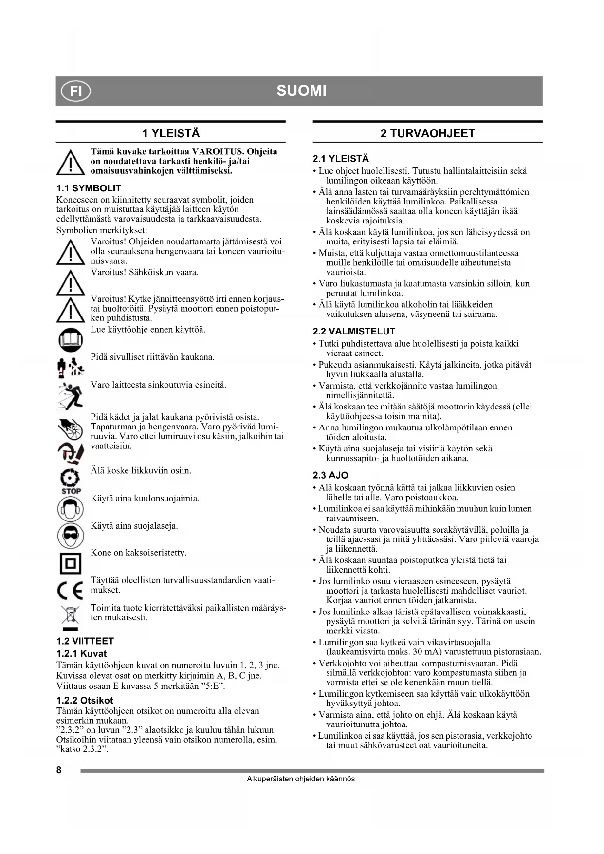 Koneeseen on kiinnitetty seuraavat symbolit, joiden tarkoitus on muistuttaa käyttäjää laitteen käytön edellyttämästä varovaisuudesta ja tarkkaavaisuudesta. Symbolien merkitykset: Varoitus! Ohjeiden noudattamatta jättämisestä voi olla seurauksena hengenvaara tai koneen vaurioitu- misvaara. Varoitus! Sähköiskun vaara. Varoitus! Kytke jännitteensyöttö irti ennen korjaus- tai huoltotöitä. Pysäytä moottori ennen poistoput- ken puhdistusta. Lue käyttöohje ennen käyttöä. Pidä sivulliset riittävän kaukana. Varo laitteesta sinkoutuvia esineitä. Pidä kädet ja jalat kaukana pyörivistä osista. Tapaturman ja hengenvaara. Varo pyörivää lumi- ruuvia. Varo ettei lumiruuvi osu käsiin, jalkoihin tai vaatteisiin. Älä koske liikkuviin osiin. Käytä aina kuulonsuojaimia. Käytä aina suojalaseja. Kone on kaksoiseristetty. Täyttää oleellisten turvallisuusstandardien vaati- mukset. Toimita tuote kierrätettäväksi paikallisten määräys- ten mukaisesti.
