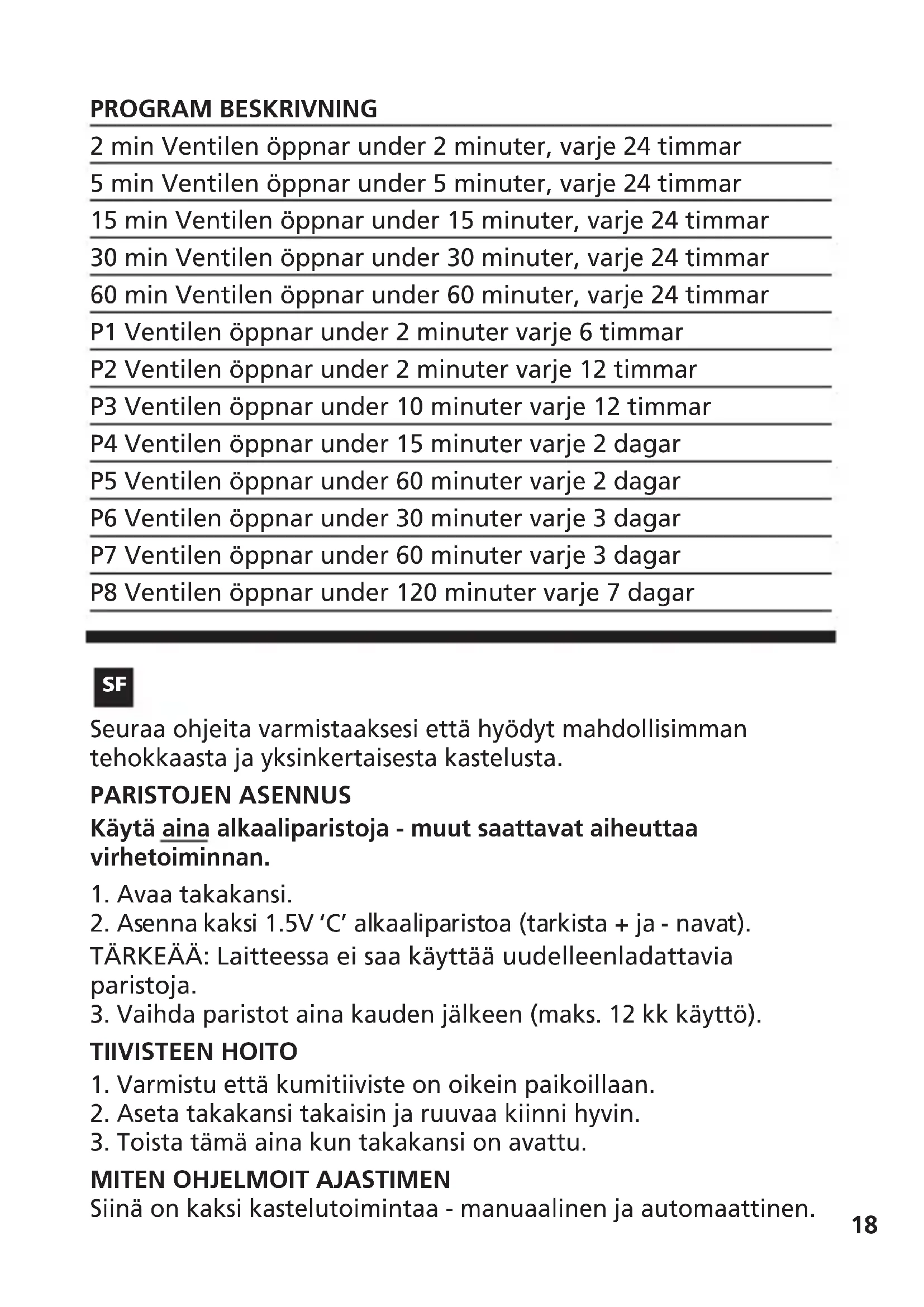KESTÄVÄ. POISTA PARISTOT KUN LAITE EI OLE KÄYTOSSÄ. VIAN ETSINTÄ ONGELMA Venttiili avautuu ja sulkeutuu kun paristot ensin asetetaan mutta ei toimi kun valinta on ON tai OFF. Venttiili ei aukea tai sulkeudu kun kiekko on ON tai OFF asennossa. Venttiili toimii, mutta vettä ei tule. Venttiili toimii manuaalisesti muttei automaattisesti. RATKAISU AC1 on huonolaatuiset paristot. Vaihda ne ALKAALI paristoihin. Puhdista pariston kosketuspinnat tai asenna uudet paristot. Tarkista että hana on auki. AUTO asento pitää asettaa. OHJELMAN KUVAUS 2 min Venttiili avautuu 2 minuutiksi 24 tunnin välein 5 min Venttiili avautuu 5 minuutiksi 24 tunnin välein 15 min Venttiili avautuu 15 minuutiksi 24 tunnin välein 30 min Venttiili avautuu 30 minuutiksi 24 tunnin välein 60 min Venttiili avautuu 60 minuutiksi 24 tunnin välein P1 Venttiili avautuu 2 minuutiksi 6 tunnin välein P2 Venttiili avautuu 2 minuutiksi 12 tunnin välein P3 Venttiili avautuu 10 minuutiksi 12 tunnin välein P4 Venttiili avautuu 15 minuutiksi 2 päivän välein P5 Venttiili avautuu 60 minuutiksi 2 päivän välein P6 Venttiili avautuu 30 minuutiksi 3 päivän välein P7 Venttiili avautuu 60 minuutiksi 3 päivän välein P8 Venttiili avautuu 120 minuutiksi 7 päivän väleinFølg bruksanvisningen slik at du kan utnytte vanningscomputeren maksimalt for en enkel og effektiv vanning.