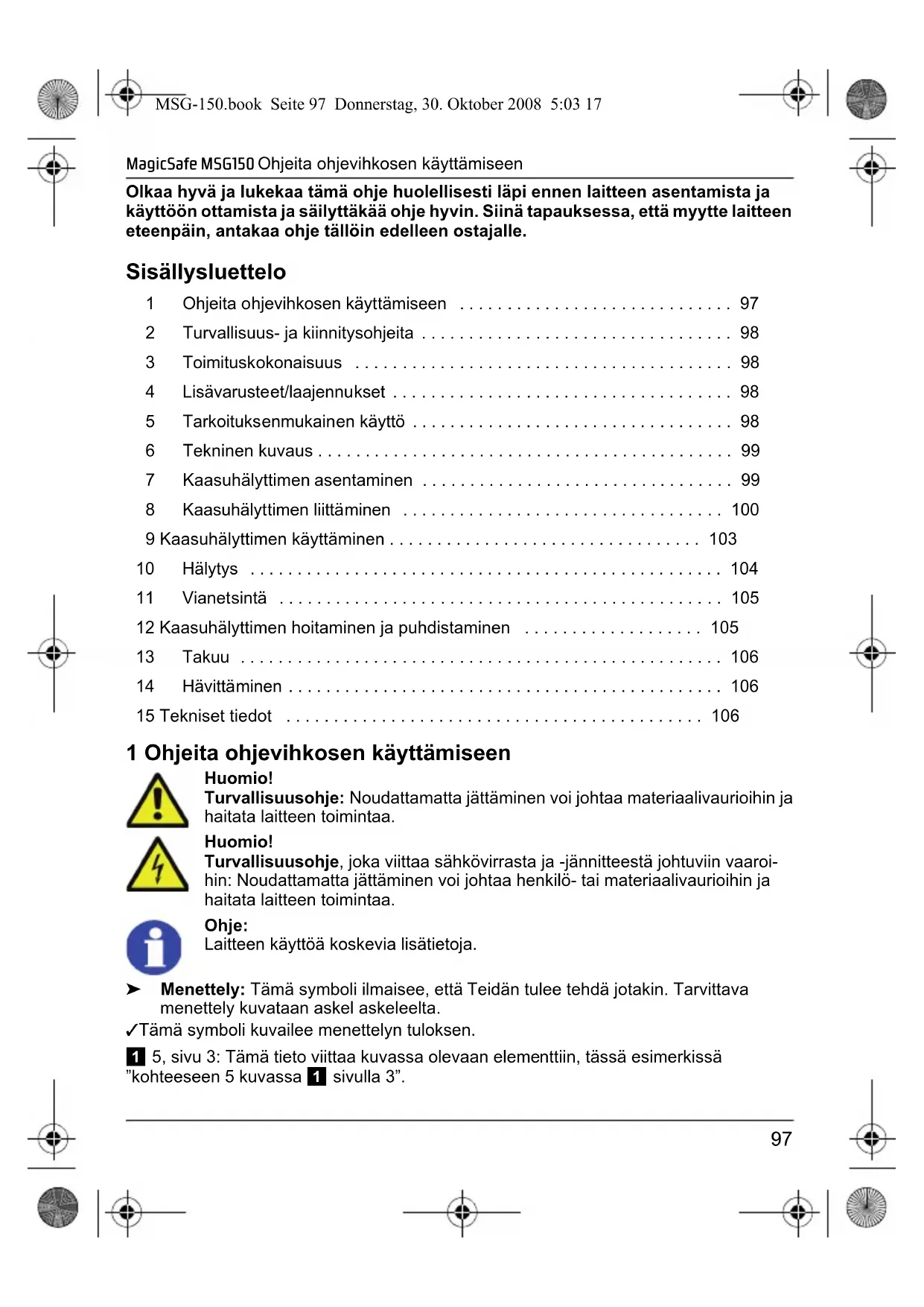 - 15 Tekniset tiedot 1 Ohjeita ohjevihkosen käyttämiseen Huomio! Turvallisuusohje: Noudattamatta jättäminen voi johtaa materiaalivaurioihin ja haitata laitteen toimintaa. Huomio! Turvallisuusohje, joka viittaa sähkövirrasta ja -jännitteestä johtuviin vaaroi- hin: Noudattamatta jättäminen voi johtaa henkilö- tai materiaalivaurioihin ja haitata laitteen toimintaa. Ohje: Laitteen käyttöä koskevia lisätietoja. ➤ Menettely: Tämä symboli ilmaisee, että Teidän tulee tehdä jotakin. Tarvittava menettely kuvataan askel askeleelta. ✓ Tämä symboli kuvailee menettelyn tuloksen. 1 5, sivu 3: Tämä tieto viittaa kuvassa olevaan elementtiin, tässä esimerkissä ”kohteeseen 5 kuvassa 1 sivulla 3”. MSG-150.book Seite 97 Donnerstag, 30. Oktober 2008 5:03 17Turvallisuus- ja kiinnitysohjeita MagicSafe MSG150 p. 106