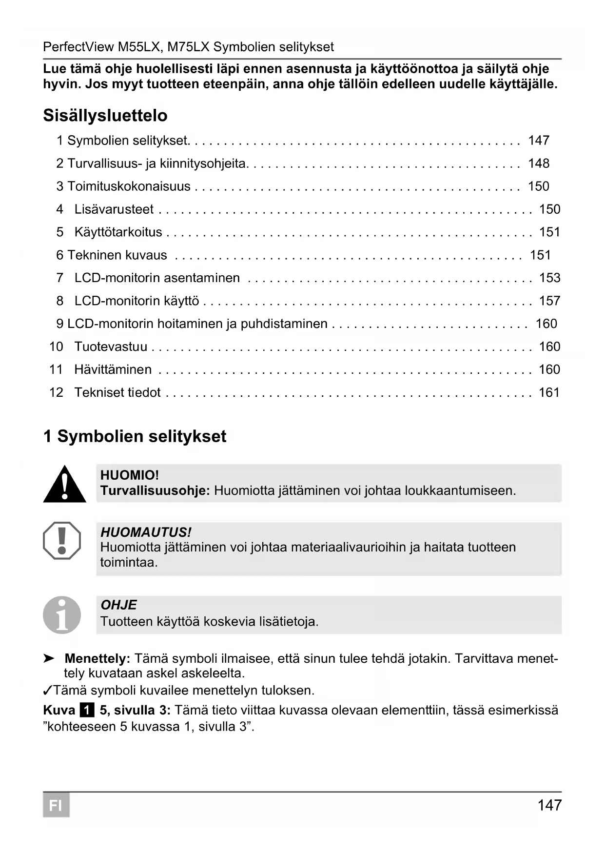 ➤ Menettely: Tämä symboli ilmaisee, että sinun tulee tehdä jotakin. Tarvittava menet- tely kuvataan askel askeleelta. ✓ Tämä symboli kuvailee menettelyn tuloksen. Kuva 1 5, sivulla 3: Tämä tieto viittaa kuvassa olevaan elementtiin, tässä esimerkissä ”kohteeseen 5 kuvassa 1, sivulla 3”. HUOMIO! Turvallisuusohje: Huomiotta jättäminen voi johtaa loukkaantumiseen. HUOMAUTUS! Huomiotta jättäminen voi johtaa materiaalivaurioihin ja haitata tuotteen toimintaa. OHJE Tuotteen käyttöä koskevia lisätietoja.Turvallisuus- ja kiinnitysohjeita PerfectView M55LX, M75LX