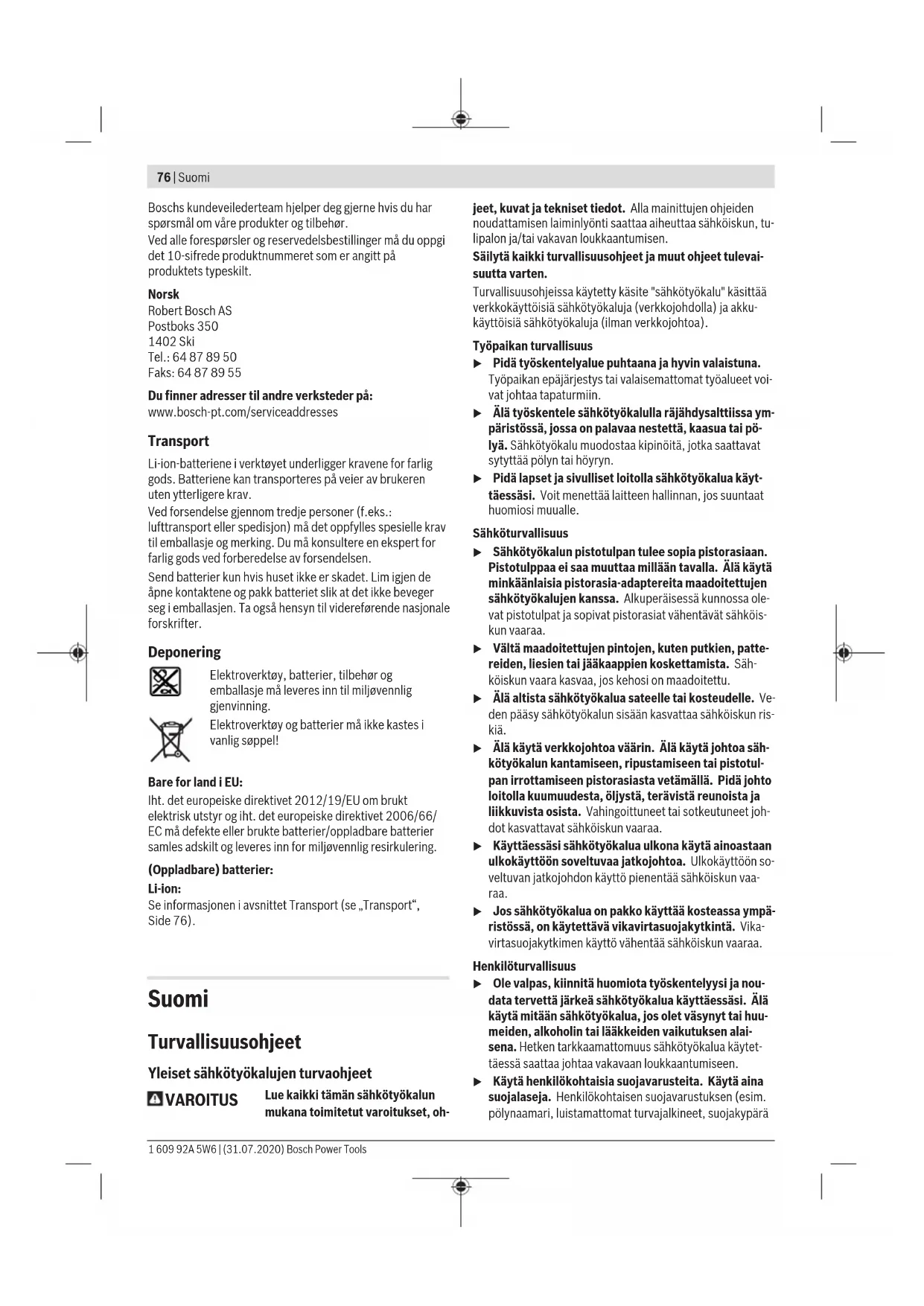 Näissä käyttöohjeissa ilmoitetut tärinä- ja melupäästötiedot on mitattu standardissa määritetyn mittausmenetelmän mu- kaan ja niitä voi käyttää sähkötyökalujen keskinäiseen vertai- luun. Ne soveltuvat myös tärinä- ja melupäästöjen alustavaan arviointiin. Ilmoitetut tärinä- ja melupäästöt vastaavat sähkötyökalun pääasiallisia käyttötapoja. Tärinä- ja melupäästöt saattavat kuitenkin poiketa ilmoitetuista arvoista, jos sähkötyökalua käytetään toisiin töihin, muilla käyttötarvikkeilla tai riittämät- tömästi huollettuna. Tämä saattaa suurentaa koko työsken- telyajan tärinä- ja melupäästöjä huomattavasti. Tärinä- ja melupäästöjen tarkaksi arvioimiseksi on huomioi- tava myös ne ajat, jolloin laite on sammutettuna tai tyhjä- käynnillä. Tämä voi vähentää huomattavasti koko työskente- lyajan tärinä- ja melupäästöjä. Bosch Power Tools 1 609 92A 5W6 | (31.07.2020)80 | Suomi Määrittele tarvittavat lisävarotoimenpiteet käyttäjän suojele- miseksi tärinän aiheuttamilta haitoilta (esimerkiksi sähkötyö- kalujen ja käyttötarvikkeiden huolto, käsien pitäminen lämpi- minä ja työprosessien organisointi). Asennus Akun lataus u Käytä vain teknisissä tiedoissa ilmoitettuja latauslait- teita. Vain nämä latauslaitteet soveltuvat sähkötyökalus- sasi käytettävälle litiumioniakulle. Huomautus: akku toimitetaan osittain ladattuna. Akun täy- den tehon varmistamiseksi akku tulee ladata latauslaitteessa täyteen ennen ensikäyttöä. Litiumioniakun voi ladata koska tahansa. Tämä ei lyhennä akun elinikää. Latauksen keskeytys ei vaurioita akkua. Litiumioniakku on suojattu "Electronic Cell Protection (ECP)" (elektronisella kennojen suojauksella) syväpurkautu- misen estämiseksi. Kun akku on lähes tyhjä, suojakytkin kat- kaisee sähkötyökalun toiminnan: käyttötarvike pysähtyy. u Älä paina enää käynnistyskytkintä sähkötyökalun toi- minnan automaattisen katkaisun jälkeen. Akku saattaa vahingoittua. Akun irrottaminen Kun haluat irrottaa akun sähkötyökalusta, paina akun lukituk- sen avauspainiketta ja vedä akku takakautta pois. Älä irrota akkua väkisin. Akun lataustilan näyttö Akun lataustilan näyttö (13) koostuu 3 vihreästä LED-va- losta. Se näyttää akun lataustilan muutaman sekunnin ajan käynnistyspainikkeen (14) painalluksen tai pohjaan painami- sen yhteydessä. LED-valo Kapasiteetti 3vihreää LED-valoa palaa jatkuvasti ≥ 66% 2vihreää LED-valoa palaa jatkuvasti 33–66% 1 vihreä LED-valo palaa jatkuvasti 11–33% 1 vihreä LED-valo vilkkuu hitaasti ≤ 10% Lataustilan näytön 3 LED-valoa vilkkuvat nopeasti, jos akun lämpötila ei ole –30...+65°C alueella ja/tai ylikuor- mitussuoja on lauennut. Käyttötarvikkeen vaihto Käyttötarvikkeen asennus (katso kuva A) Työnnä käyttötarvike pitimen (2) pohjaan. Pitimen mag- neetti pitää käyttötarviketta paikallaan. Käyttötarvikkeen irrotus Vedä käyttötarvike pois pitimestä (2). Poraistukan asennus (katso kuva B) Irrota käyttötarvike. Työnnä istukka pitimeen (2). Istukka lukittuu kuuluvasti pai- kalleen. Tarkista kunnollinen kiinnitys istukasta vetämällä. Käyttötarvikkeen asentaminen istukkaan (katso kuva C) Työnnä käyttötarvike istukan pohjaan. Istukan magneetti pi- tää käyttötarviketta paikallaan. Ruuvinpidin (katso kuva D) Ruuvinpidin (16) pitää ruuvit suorassa niin, että ne saa oh- jattua helpommin työkappaletta vasten. Irrota käyttötarvike. Työnnä ruuvinpidin käyttötarvikkeen pitimeen (2) niin, että se lukittuu kuuluvasti paikalleen. Paina magneettikaulus (15) rajoittimeen asti sähkötyökalun suuntaan. Asenna sen jälkeen ruuvauskärki (20) ruuvinpitimeen (16) ja vedä magneettikaulusta eteenpäin ruuvauskärjen päälle. Aseta ruuvi ruuvauskärkeen. Poraistukka (katso kuva E) Avaa poraistukka (18) kääntämällä sitä kiertosuuntaan ➊, kunnes voit asentaa käyttötarvikkeen. Asenna käyttötarvike paikalleen. Kiristä poraistukan (18) holkkia voimakkaasti kädellä kierto- suuntaan ➋. Tämän myötä poranistukka lukittuu automaatti- sesti. Istukan kääntäminen (katso kuva F) Vedä vapautusrengasta (1) sähkötyökalusta poispäin ja ir- rota sen jälkeen istukka pitimestä (2). Käännä istukka haluamaasi asentoon ja työnnä se jälleen pai- kalleen. Tarkista kunnollinen kiinnitys istukasta vetämällä. Istukan irrottaminen (katso kuva G) Irrota käyttötarvike. Vedä vapautusrengasta (1) sähkötyökalusta poispäin ja vedä istukka irti pitimestä (2). Istukoiden yhdistely (katso kuva H) Irrota käyttötarvike. Asenna kulmavaihtopää (17) pitimeen (2). Tarkista kunnollinen kiinnitys kulmavaihtopäästä (17) vetä- mällä. Asenna poraistukka (18) kulmavaihtopäähän (17). Tarkista kunnollinen kiinnitys poraistukasta (18) vetämällä. 1 609 92A 5W6 | (31.07.2020) Bosch Power ToolsSuomi | 81 Pölyn-/purunpoisto Työstettävistä materiaaleista syntyvä pöly (esimerkiksi lyijy- pitoinen pinnoite, tietyt puulaadut, kivi ja metalli) voi olla ter- veydelle vaarallista. Pölyn koskettaminen tai hengittäminen saattaa aiheuttaa käyttäjälle tai lähellä oleville ihmisille aller- gisia reaktioita ja/tai hengitystiesairauksia. Tietyt pölylaadut (esimerkiksi tammi- tai pyökkipöly) katso- taan syöpää aiheuttaviksi, varsinkin puunkäsittelyaineiden yhteydessä (kromaatti, puunsuoja-aine). Asbestipitoisia ai- neita saavat käsitellä vain ammattilaiset. – Huolehdi työkohteen hyvästä tuuletuksesta. – Suosittelemme käyttämään suodatusluokan P2 hengitys- suojanaamaria. Noudata käsiteltäviä materiaaleja koskevia maakohtaisia määräyksiä. u Estä pölyn kertyminen työpisteeseen. Pöly saattaa olla herkästi syttyvää. Käyttö Käyttöönotto Akun asennus Työnnä ladattu akku (9) takakautta sähkötyökalun rungon si- sään niin, että se lukkiutuu kunnolla paikalleen. Pyörintäsuunnan asetus Elektronisella suunnanvaihtokytkimellä (7) voit va