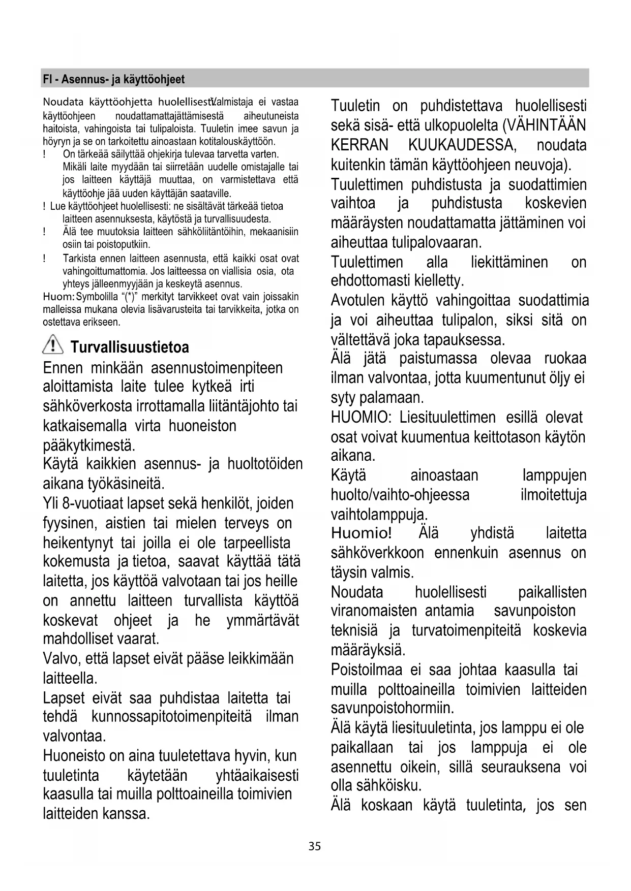 Funksjon Viften er utstyrt med et kontrollpanel med viftehastighetsvalg og en lysbryter for å kontrollere kokeområdets lys. Bruk største hastighet ved høy dampkonsentrasjon på kjøkkenet. Vi anbefaler å slå på viften 5 minutter før du begynner å lage mat, og la den fortsette å virke i enda cirka 15 minutter etter du er ferdig med matlagingen. Vedlikehold Rengjøring Til rengjøring skal det KUN benyttes en klut fuktet med et nøytralt rengjøringsmiddel. VERKTØY ELLER APPARATER SKAL IKKE BRUKES TIL RENGJØRING! Unngå bruk av slipende eller etsende produkter. ALKOHOL SKAL IKKE BRUKES! Fettfilteret Fanger kokefettpartikler. Fettfilteret må rengjøres en gang i måneden uten bruk av aggressive rengjøringsmidler, for hånd eller i oppvaskmaskin ved lav temperatur og med kort syklus. Ved vask i oppvaskmaskin kan fettfilteret i metall miste fargen, men dets filterkarakteristikker endres absolutt ikke. For å demontere fettfilteret må man dra i fjærhåndtaket. Fig. 1 Kullfilter (kun med resirkulering av luften) Fig. 2 Holder tilbake ubehagelige lukter fra matlaging. Kulllteret må skiftes ut hver 4. måned ved middels bruk av ventilatoren, og oftere hvis ventilatoren brukes mye. Det kan IKKE vaskes eller benyttes om igjen Ta vekk fettfiltrene. Monter filtrene så de dekker motoren. Kontroller at boltene R på filtergitteret korrisponderer med hullene S, vri så etter klokken helt til gitteret er blokkert. Gå frem i motsatt rekkefølge for å demontere filtrene. Sett på plass fettfiltrene. Utskifting av lyspærer Fig. 1 Koble ventilatoren fra strømnettet. Merk! Forsikre deg om at lyspæren er kald før du tar i den. Skift ut den utbrente lyspæren med en av samme type, som spesifisert på typeskiltet eller i nærheten av selve lyspæren på kjøkkenhetten. For å få tilgang til lamperommet må man ta vekk dekselet A. Dersom belysningen ikke skulle virke, kontroller at lyspærene er satt korrekt på plass før du henvender deg til teknisk assistanse.35 FI - Asennus- ja käyttöohjeet Noudata käyttöohjetta huolellisesti. Valmistaja ei vastaa käyttöohjeen noudattamattajättämisestä aiheutuneista haitoista, vahingoista tai tulipaloista. Tuuletin imee savun ja höyryn ja se on tarkoitettu ainoastaan kotitalouskäyttöön. ! On tärkeää säilyttää ohjekirja tulevaa tarvetta varten. Mikäli laite myydään tai siirretään uudelle omistajalle tai jos laitteen käyttäjä muuttaa, on varmistettava että käyttöohje jää uuden käyttäjän saataville. ! Lue käyttöohjeet huolellisesti: ne sisältävät tärkeää tietoa laitteen asennuksesta, käytöstä ja turvallisuudesta. ! Älä tee muutoksia laitteen sähköliitäntöihin, mekaanisiin osiin tai poistoputkiin. ! Tarkista ennen laitteen asennusta, että kaikki osat ovat vahingoittumattomia. Jos laitteessa on viallisia osia, ota yhteys jälleenmyyjään ja keskeytä asennus. Huom: Symbolilla “(*)” merkityt tarvikkeet ovat vain joissakin malleissa mukana olevia lisävarusteita tai tarvikkeita, jotka on ostettava erikseen. Turvallisuustietoa Ennen minkään asennustoimenpiteen aloittamista laite tulee kytkeä irti sähköverkosta irrottamalla liitäntäjohto tai katkaisemalla virta huoneiston pääkytkimestä. Käytä kaikkien asennus- ja huoltotöiden aikana työkäsineitä. Yli 8-vuotiaat lapset sekä henkilöt, joiden fyysinen, aistien tai mielen terveys on heikentynyt tai joilla ei ole tarpeellista kokemusta ja tietoa, saavat käyttää tätä laitetta, jos käyttöä valvotaan tai jos heille on annettu laitteen turvallista käyttöä koskevat ohjeet ja he ymmärtävät mahdolliset vaarat. Valvo, että lapset eivät pääse leikkimään laitteella. Lapset eivät saa puhdistaa laitetta tai tehdä kunnossapitotoimenpiteitä ilman valvontaa. Huoneisto on aina tuuletettava hyvin, kun tuuletinta käytetään yhtäaikaisesti kaasulla tai muilla polttoaineilla toimivien laitteiden kanssa. Tuuletin on puhdistettava huolellisesti sekä sisä- että ulkopuolelta (VÄHINTÄÄN KERRAN KUUKAUDESSA, noudata kuitenkin tämän käyttöohjeen neuvoja). Tuulettimen puhdistusta ja suodattimien vaihtoa ja puhdistusta koskevien määräysten noudattamatta jättäminen voi aiheuttaa tulipalovaaran. Tuulettimen alla liekittäminen on ehdottomasti kielletty. Avotulen käyttö vahingoittaa suodattimia ja voi aiheuttaa tulipalon, siksi sitä on vältettävä joka tapauksessa. Älä jätä paistumassa olevaa ruokaa ilman valvontaa, jotta kuumentunut öljy ei syty palamaan. HUOMIO: Liesituulettimen esillä olevat osat voivat kuumentua keittotason käytön aikana. Käytä ainoastaan lamppujen huolto/vaihto-ohjeessa ilmoitettuja vaihtolamppuja. Huomio! Älä yhdistä laitetta sähköverkkoon ennenkuin asennus