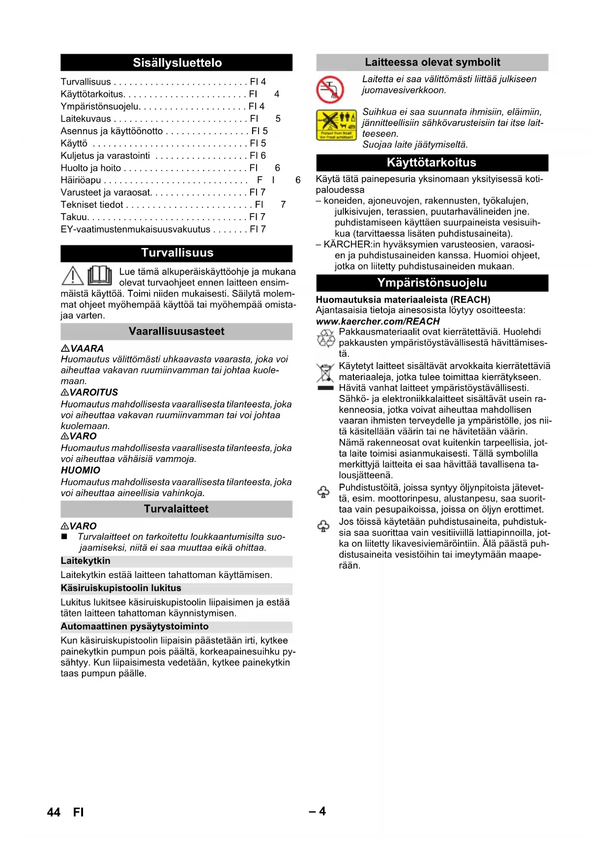 90 dB(A) Tekniska ändringar förbehålls. Garanti EU-försäkran om överensstämmelse Produkt: Högtryckstvätt Typ: 1.673-xxx Tillämpliga EU-direktiv 2000/14/EG 2014/30/EU 2006/42/EG (+2009/127/EG) 2011/65/EU Tillämpade harmoniserade normer EN 50581 EN 55014–1: 2006+A1: 2009+A2: 2011 EN 55014–2: 2015 EN 60335–1 EN 60335–2–79 EN 61000–3–2: 2014 EN 61000–3–3: 2013 EN 62233: 2008 Tillämpad metod för överensstämmelsevärdering 2000/14/EG: Bilaga V Ljudeffektsnivå dB(A) Upmätt: 88 Garanterad: 90 Winnenden, 2016/08/01 CEO Head of Approbation 43SV– 4 Lue tämä alkuperäiskäyttöohje ja mukana olevat turvaohjeet ennen laitteen ensim- mäistä käyttöä. Toimi niiden mukaisesti. Säilytä molem- mat ohjeet myöhempää käyttöä tai myöhempää omista- jaa varten. VAARA Huomautus välittömästi uhkaavasta vaarasta, joka voi aiheuttaa vakavan ruumiinvamman tai johtaa kuole- maan. 몇 VAROITUS Huomautus mahdollisesta vaarallisesta tilanteesta, joka voi aiheuttaa vakavan ruumiinvamman tai voi johtaa kuolemaan. 몇 VARO Huomautus mahdollisesta vaarallisesta tilanteesta, joka voi aiheuttaa vähäisiä vammoja. HUOMIO Huomautus mahdollisesta vaarallisesta tilanteesta, joka voi aiheuttaa aineellisia vahinkoja. 몇 VARO Turvalaitteet on tarkoitettu loukkaantumisilta suo- jaamiseksi, niitä ei saa muuttaa eikä ohittaa. Laitekytkin estää laitteen tahattoman käyttämisen. Lukitus lukitsee käsiruiskupistoolin liipaisimen ja estää täten laitteen tahattoman käynnistymisen. Kun käsiruiskupistoolin liipaisin päästetään irti, kytkee painekytkin pumpun pois päältä, korkeapainesuihku py- sähtyy. Kun liipaisimesta vedetään, kytkee painekytkin taas pumpun päälle. Käytä tätä painepesuria yksinomaan yksityisessä koti- paloudessa – koneiden, ajoneuvojen, rakennusten, työkalujen, julkisivujen, terassien, puutarhavälineiden jne. puhdistamiseen käyttäen suurpaineista vesisuih- kua (tarvittaessa lisäten puhdistusaineita). – KÄRCHER:in hyväksymien varusteosien, varaosi- en ja puhdistusaineiden kanssa. Huomioi ohjeet, jotka on liitetty puhdistusaineiden mukaan. Huomautuksia materiaaleista (REACH) Ajantasaisia tietoja ainesosista löytyy osoitteesta: www.kaercher.com/REACH Sisällysluettelo Turvallisuus . . . . . . . . . . . . . . . . . . . . . . . . . . FI 4 Käyttötarkoitus. . . . . . . . . . . . . . . . . . . . . . . . FI4 Ympäristönsuojelu. . . . . . . . . . . . . . . . . . . . . FI 4 Laitekuvaus . . . . . . . . . . . . . . . . . . . . . . . . . . FI5 Asennus ja käyttöönotto . . . . . . . . . . . . . . . . FI 5 Käyttö . . . . . . . . . . . . . . . . . . . . . . . . . . . . . . FI 5 Kuljetus ja varastointi . . . . . . . . . . . . . . . . . . FI 6 Huolto ja hoito . . . . . . . . . . . . . . . . . . . . . . . . FI6 Häiriöapu . . . . . . . . . . . . . . . . . . . . . . . . . . . .FI 6 Varusteet ja varaosat. . . . . . . . . . . . . . . . . . . FI 7 Tekniset tiedot . . . . . . . . . . . . . . . . . . . . . . . . FI7 Takuu. . . . . . . . . . . . . . . . . . . . . . . . . . . . . . . FI 7 EY-vaatimustenmukaisuusvakuutus . . . . . . . FI 7 Turvallisuus Vaarallisuusasteet Turvalaitteet Laitekytkin Käsiruiskupistoolin lukitus Automaattinen pysäytystoiminto Laitteessa olevat symbolit Laitetta ei saa välittömästi liittää julkiseen juomavesiverkkoon. Suihkua ei saa suunnata ihmisiin, eläimiin, jännitteellisiin sähkövarusteisiin tai itse lait- teeseen. Suojaa laite jäätymiseltä. Käyttötarkoitus Ympäristönsuojelu Pakkausmateriaalit ovat kierrätettäviä. Huolehdi pakkausten ympäristöystävällisestä hävittämises- tä. Käytetyt laitteet sisältävät arvokkaita kierrätettäviä materiaaleja, jotka tulee toimittaa kierrätykseen. Hävitä vanhat laitteet ympäristöystävällisesti. Sähkö- ja elektroniikkalaitteet sisältävät usein ra- kenneosia, jotka voivat aiheuttaa mahdollisen vaaran ihmisten terveydelle ja ympäristölle, jos nii- tä käsitellään väärin tai ne hävitetään väärin. Nämä rakenneosat ovat kuitenkin tarpeellisia, jot- ta laite toimisi asianmukaisesti. Tällä symbolilla merkittyjä laitteita ei saa hävittää tavallisena ta- lousjätteenä. Puhdistustöitä, joissa syntyy öljynpitoista jätevet- tä, esim. moottorinpesu, alustanpesu, saa suorit- taa vain pesupaikoissa, joissa on öljyn erottimet. Jos töissä käytetään puhdistusaineita, puhdistuk- sia saa suorittaa vain vesitiiviillä lattiapinnoilla, jot- ka on liitetty likavesiviemäröintiin. Älä päästä puh- distusaineita vesistöihin tai imeytymään maape- rään. 44 FI– 5 Laitteen toimituslaajuus (riippuu mallista) käy ilmi pak- kauksessa olevasta kuvasta. Käyttöohje sisältää kaikki- en mahdollisten valinnaisten varusteiden kuvauksen. Ks. kuvasivut 1 Korkeapaineliitäntä 2 Laitekytkin „0/OFF“ / „I/ON“ 3 Säilytyskoukku 4 Kantokahva 5 Kuljetuskahva, ulosvedettävä 6 Pidike suihkuputkelle 7 Pesukahvan säilytyspaikka 8 Suodattimella varustettu vesiliitäntä 9 Tulovesiliitäntä 10 Verkkojohto, jossa on verkkopistoke 11 Kuljetuspyörä 12 Pesukahva 13 Käsiruiskupistoolin lukitus 14 Korkeapaineletkun pikaliitin 15 Korkeapaineletku 16 Full Control -likajyrsin-ruiskuputki Pinttyneen lian poistoon. Paineporras: HARD 17 Full Control -ruiskuputki Click-Vario Power Tarkoitettu yleisimpiin puhdistustehtäviin. Paineportaat: HARD / MEDIUM / SOFT / MIX Ks. kuvasivut Kuvat - Kiinnitä laitteen mukana irtonaisena tulleet osat laitteeseen ennen käyttöönottamista. Pysäköi laite tasaiselle alustalle. Kuvat - Vedä kiinnityskappale ulos pesukahvasta ja yhdis- tä paineletku pesukahvaan. Paina pikaliitintä sisään kunnes se lukittuu. Kokeile liitoksen pitävyys korkeapaineletkusta vetämällä. Kuvat - HUOMIO Veden epäpuhtaudet voivat vahingoittaa korkeapaine- pumppua ja varusteita. Vahinkojen estämiseksi suosit- telemme käyttämään KÄRCHER-vesisuodatinta (lisä- varuste, tilausnumero 4.730-059). 몇 VARO Yli 2 minuuttia 