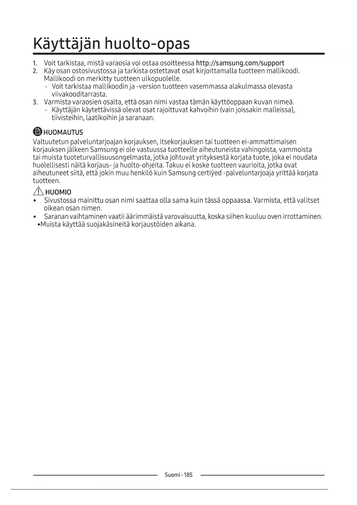 ‐ Käyttäjän käytettävissä olevat osat rajoittuvat kahvoihin (vain joissakin malleissa), tiivisteihin, laatikoihin ja saranaan. HUOMAUTUS Valtuutetun palveluntarjoajan korjauksen, itsekorjauksen tai tuotteen ei-ammattimaisen korjauksen jälkeen Samsung ei ole vastuussa tuotteelle aiheutuneista vahingoista, vammoista tai muista tuoteturvallisuusongelmasta, jotka johtuvat yrityksestä korjata tuote, joka ei noudata huolellisesti näitä korjaus- ja huolto-ohjeita. Takuu ei koske tuotteen vaurioita, jotka ovat aiheutuneet siitä, että jokin muu henkilö kuin Samsung certiÿed -palveluntarjoaja yrittää korjata tuotteen. HUOMIO