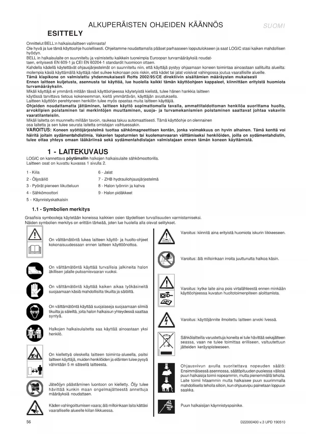 BELL in halkaisulaite on suunniteltu ja valmistetu kaikein tuoreimpia Europan turvamaarayksia noudataen, erityisesti EN 609-1 ja CEI EN 60204-1 standardit huomioon otaen.