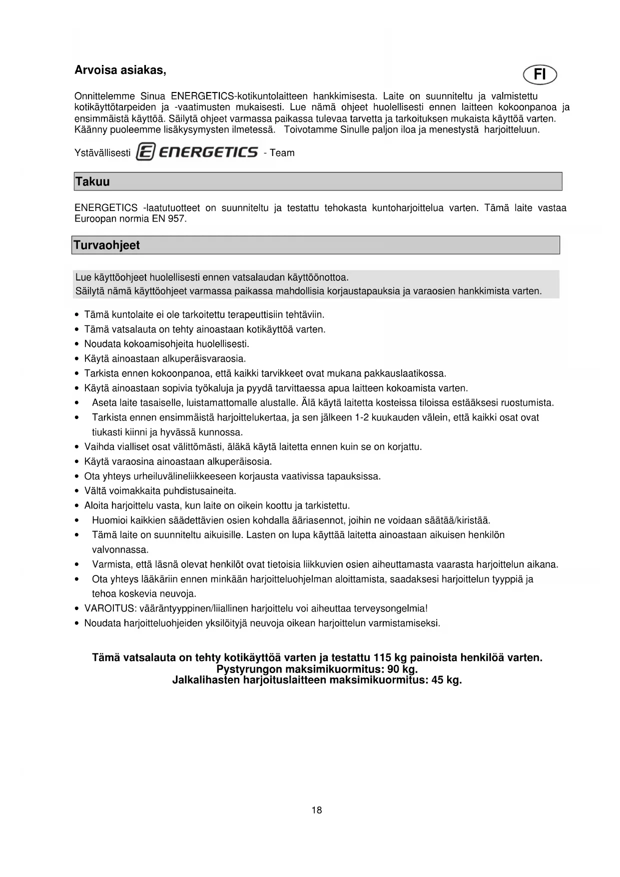 32 ANTI-SLIP DYNA 2 33 SEXKANTSSKRUV M10 x 70mm 5 34 SEXKANTSSKRUV M10 x 65mm 4 35 SEXKANTSSKRUV M10 x 60mm 2 36 SEXKANTSSKRUV M10 x 145mm 1 37 SEXKANTSSKRUV M10 x 50mm 1 38 SEXKANTSSKRUV M10 x 16mm 2 39 INSEXSKRUV M8 x 40mm 8 40 KRYSSKRUV M6 x 16mm 1 41 FLYGPLANSMUTTER M10 13 42 FLYGPLANSMUTTER M6 2 43 BRICKA Ø 25mm 1 44 BRICKA Ø 10mm 28 45 BRICKA Ø 8mm 8 46 BRICKA Ø 6mm 118 Arvoisa asiakas, Onnittelemme Sinua ENERGETICS-kotikuntolaitteen hankkimisesta. Laite on suunniteltu ja valmistettu kotikäyttötarpeiden ja -vaatimusten mukaisesti. Lue nämä ohjeet huolellisesti ennen laitteen kokoonpanoa ja ensimmäistä käyttöä. Säilytä ohjeet varmassa paikassa tulevaa tarvetta ja tarkoituksen mukaista käyttöä varten. Käänny puoleemme lisäkysymysten ilmetessä. Toivotamme Sinulle paljon iloa ja menestystä harjoitteluun. Ystävällisesti - Team Takuu ENERGETICS -laatutuotteet on suunniteltu ja testattu tehokasta kuntoharjoittelua varten. Tämä laite vastaa Euroopan normia EN 957. Turvaohjeet
