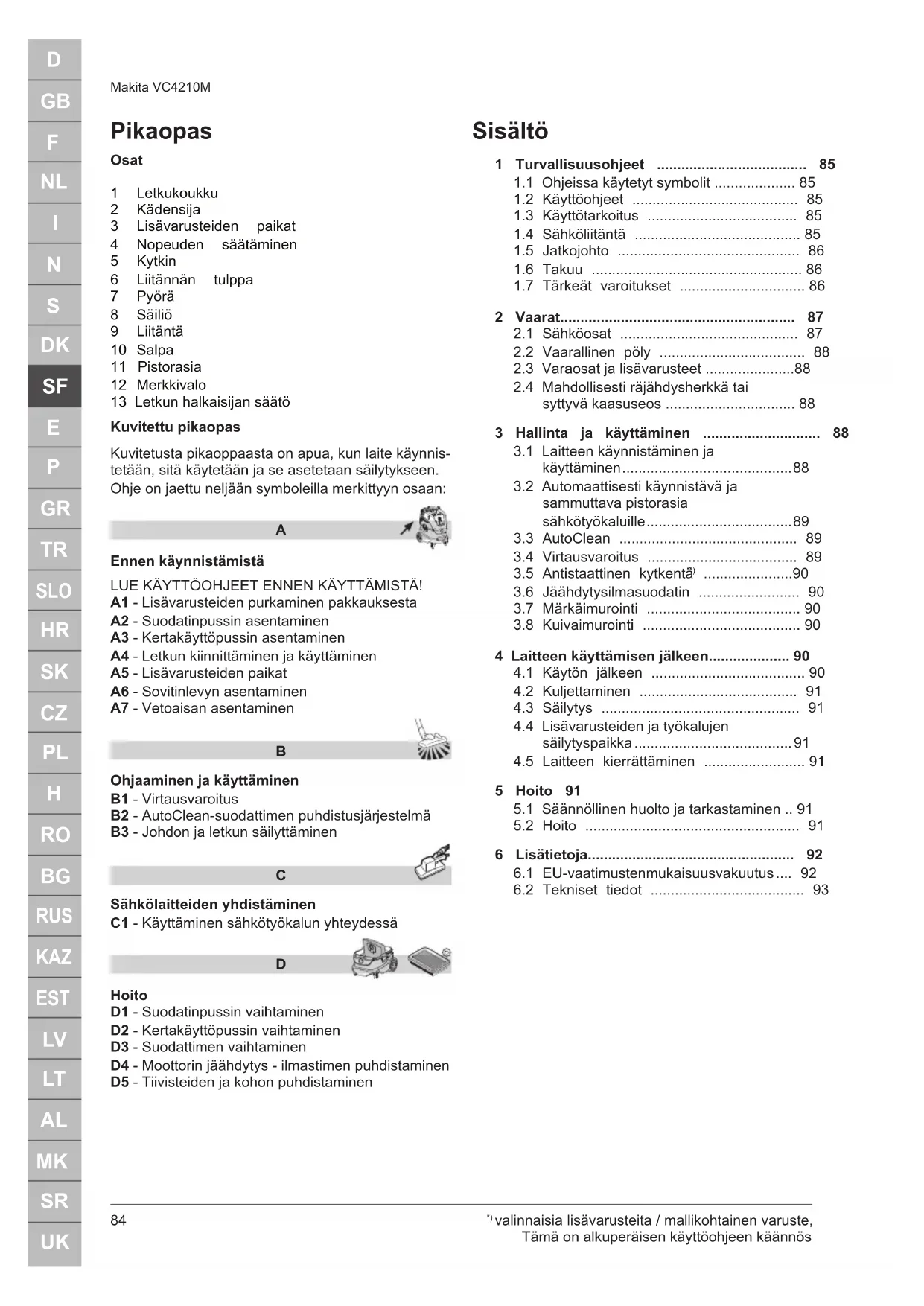 Hoito D1 - Suodatinpussin vaihtaminen D2 - Kertakäyttöpussin vaihtaminen D3 - Suodattimen vaihtaminen D4 - Moottorin jäähdytys - ilmastimen puhdistaminen D5 - Tiivisteiden ja kohon puhdistaminen Sisältö 1 Turvallisuusohjeet ..................................... 85