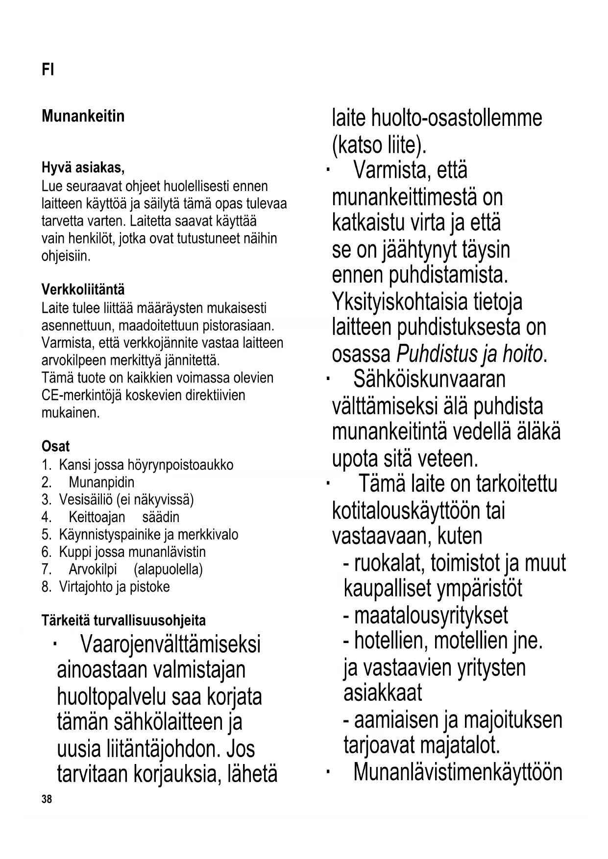 Tärkeitä turvallisuusohjeita ∙ Vaarojen välttämiseksi ainoastaan valmistajan huoltopalvelu saa korjata tämän sähkölaitteen ja uusia liitäntäjohdon. Jos tarvitaan korjauksia, lähetä laite huolto-osastollemme (katso liite). ∙ Varmista, että munankeittimestä on katkaistu virta ja että se on jäähtynyt täysin ennen puhdistamista. Yksityiskohtaisia tietoja laitteen puhdistuksesta on osassa Puhdistus ja hoito. ∙ Sähköiskun vaaran välttämiseksi älä puhdista munankeitintä vedellä äläkä upota sitä veteen. ∙ Tämä laite on tarkoitettu kotitalouskäyttöön tai vastaavaan, kuten - ruokalat, toimistot ja muut kaupalliset ympäristöt - maatalousyritykset - hotellien, motellien jne. ja vastaavien yritysten asiakkaat - aamiaisen ja majoituksen tarjoavat majatalot. ∙ Munanlävistimen käyttöön FI39 liittyy loukkaantumisvaara, ole siis varovainen. ∙ Ulkopinnat ja vesisäiliö kuumenevat käytön aikana ja ovat kuumia jonkin aikaa sen jälkeen. Käsittele kuumaa laitetta vain kahvasta. ∙ Varoitus: Kannesta voi päästä ulos kuumaa höyryä. ∙ Varoitus: Väärinkäytöstä saattaa seurata vakavia henkilövammoja. ∙ Tätä laitetta saavat käyttää lapset (vähintään 8-vuotiaat) sekä henkilöt, joilla on fyysisesti, aistillisesti tai henkisesti rajoittunut toimintakyky tai joilla on puuttuvat tai vajavaiset tiedot laitteen toiminnasta, mikäli heitä valvotaan tai ohjataan laitteen käytössä ja he ymmärtävät täysin kaikki käyttöön liittyvät vaarat ja turvatoimenpiteet. ∙ Lasten ei saa antaa leikkiä laitteella. ∙ Lasten ei saa antaa tehdä laitteen puhdistus- tai huoltotoimenpiteitä, elleivät he ole aikuisen valvonnassa sekä vähintään 8 vuotta vanhoja. ∙ Laite ja sen liitäntäjohto täytyy aina pitää alle 8-vuotiaiden ulottumattomissa. ∙ Varoitus: Pidä lapset poissa pakkausmateriaalien luota potentiaalisen vaaratilanteen esim. tukehtumisvaaran vuoksi. ∙ Tarkasta aina ennen laitteen käyttöä huolellisesti laitteen runko, liitäntäjohto ja mahdolliset asennetut lisäosat vaurioiden varalta. Jos laite on esimerkiksi pudonnut kovalle pinnalle tai liitäntäjohdon vetämiseen on käytetty liikaa voimaa, laitetta ei saa enää käyttää: näkymättömätkin vauriot voivat aiheuttaa laitetta käytettäessä vaaratilanteita. Ota tässä tapauksessa yhteyttä asiakaspalveluun. ∙ Älä koskaan poistu paikalta laitteen ollessa toimintakunnossa. ∙ Varo, ettei liitäntäjohto kosketa munankeittimen kuumia osia. Älä kierrä johtoa lämpimän laitteen ympärille. ∙ Irrota pistotulppa pistorasiasta aina40 - jos laitteessa on käyttöhäiriö - käytön jälkeen - ennen laitteen puhdistamista. ∙ Kun irrotat pistokkeen pistorasiasta, älä vedä liitäntäjohdosta vaan tartu aina pistokkeeseen. ∙ Laitteen täytyy olla sijoitettuna käytön aikana tasaiselle, kuumuutta ja vettä hylkivälle pinnalle. ∙ Älä sijoita laitetta kuumille pinnoille tai niiden tai avotulen läheisyyteen, kuten keittolevyjen tai kaasuliekkien. Älä käytä laitetta herkkien esineiden tai huonekalujen alla, kuten seinäkaappien, koska kannesta pääsee ulos vettä käytön aikana. ∙ Jos laite vahingoittuu väärinkäytön seurauksena tai siksi, että annettuja ohjeita ei ole noudatettu, valmistaja ei vastaa aiheutuneista vahingoista. Ennen ensimmäistä käyttöä Puhdista vesisäiliö, munanpidin ja kansi kostealla kankaalla. Munankeittimen käyttö ∙ Kaada mittakuppi täyteen kylmää vettä ja kaada se vesisäiliöön. ∙ Lävistä munien tylppä pää munanlävistimellä. Se vähentää munin halkeilua keittämisen aikana. ∙ Aseta munat pitimeen, laita pidin vesisäiliöön ja sulje kansi. ∙ Valitse haluamasi kovuusaste keittoajan säätimellä: – pehmeä – keskikova – kova ∙ Merkinnät on tarkoitettu keskikokoisille munille. Munien kovuutta voi kuitenkin säätää rajattomasti keitettävien munien lukumäärästä ja koosta riippuen. ∙ Liitä pistoke pistorasiaan ja käynnistä munankeitin käynnistyspainikkeella. Merkkivalo syttyy. ∙ Kuuluu piippaus, kun haluttua munien kovuutta varten esiasetettu keittoaika on kulunut. ∙ Kytke laitteesta virta. Merkkivalo sammuu. Irrota pistotulppa pistorasiasta. ∙ Avaa kansi. Varoitus: Kun kansi on auki, laitteesta vapautuu kuumaa höyryä. ∙ Poista munanpidin ja munat säiliöstä ja aseta ne heti kylmän juoksevan veden alle. Huomaa: jos munia ei heti poisteta keittimestä, niiden kypsyminen jatkuu. Puhdistus ja hoito ∙ Irrota aina pistotulppa pistorasiasta, anna laitteen jäähtyä ja kaada pois jäljelle jäänyt vesi ennen kuin pudistat laitteen. ∙ Sähköiskun välttämiseksi älä puhdista laitetta vedellä äläkä upota sitä veteen. ∙ Jotta kiillotetut pinnat eivät vahingoittuisi, älä käytä hankaavia tai voimakkaita puhdistusaineita. ∙ Puhdista vesisäiliö vain kostealla kankaalla pyyhkimällä. ∙ Vesisäiliöön mahdolliset muodostuvat kertymät voi poistaa veden ja etikan sekoituksella. Sen jälkeen etikka poistetaan suorittamalla yksi keittojakso puhdasta kylmää vettä käyttäen. ∙ Huuhtele munanpidin perusteellisesti ja pyyhi se sen jälkeen kuivaksi. ∙ Kannen voi pyyhkiä hieman kostealla kankaalla.41 Jätehuolto Tällä symbolilla merkityt laitteet täytyy hävittää kotitalousjätteestä erillään, sillä ne sisältävät arvokkaita kierrätyskelpoisia materiaaleja. Asianmukaisella hävittämisellä suojellaan ympäristöä ja ihmisterveyttä. Saat aiheesta lisätietoa paikallisilta viranomaisilta tai jälleenmyyjiltä. Takuu Laitteelle myönnetään 2 vuoden takuu, joka koskee valmistus- ja ainevikoja, ostopäivästä lukien yksilöityä ostokuittia vastaan yleisten Suomessa kulloinkin alalla voimassa olevien takuuehtojen mukaan. Mikäli laitetta käytetään väärin, käyttöohjeen vastaisesti tai huolimattomasti, vastuu syntyvistä esine- ja henkilövahingoista lankeaa laitteen käyttäjälle. Tämä takuu ei vaikuta lakimääräisii