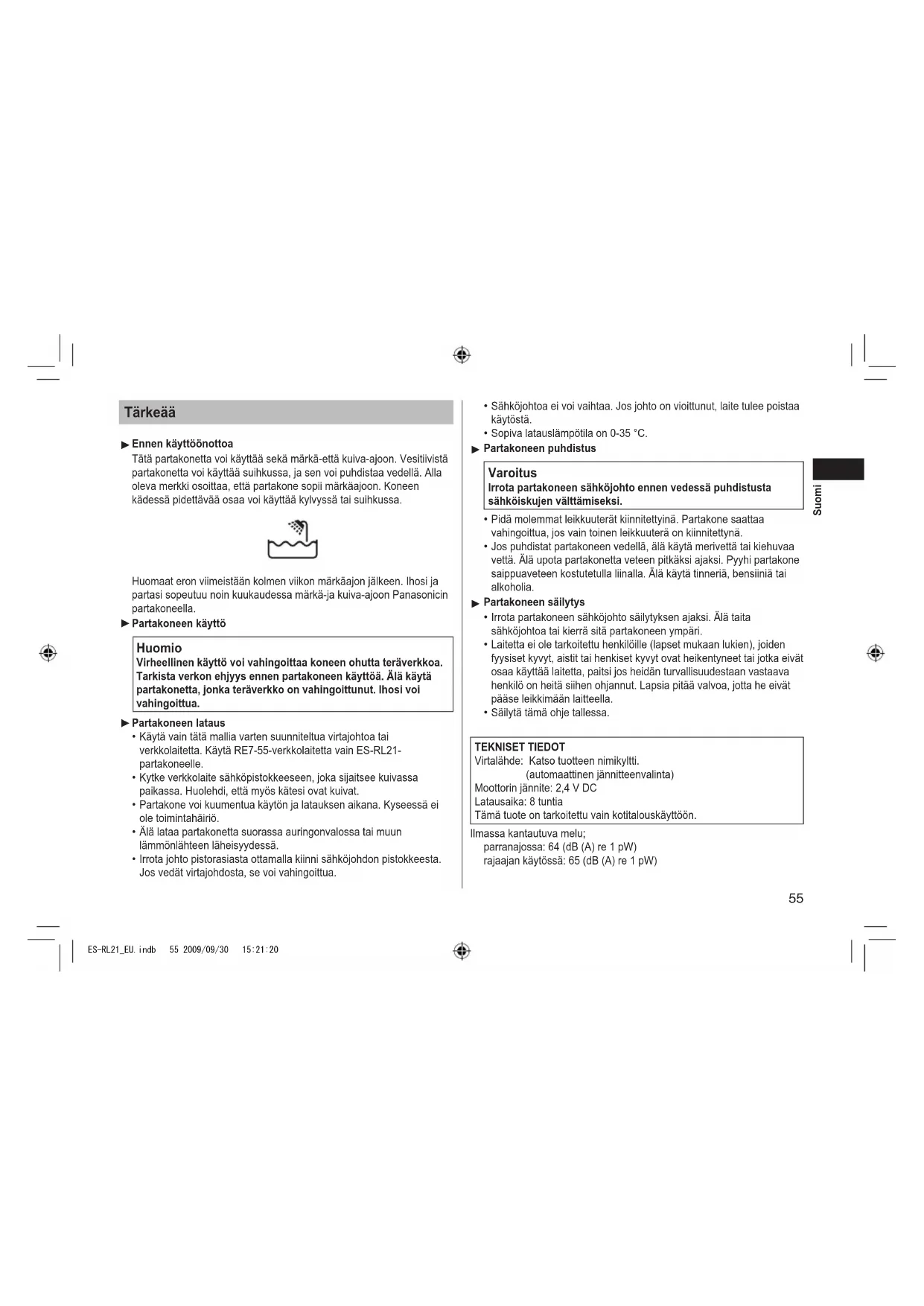 passande uppsamlingsställe i enlighet med nationella bestämmelser och direktiven 2002/96/EC och 2006/66/ EC. När du kasserar dessa produkter och batterier på rätt sätt hjälper du till att spara på värdefulla resurser och förebygga en potentiell negativ inverkan på människors hälsa och på miljön som annars skulle kunna uppstå p.g.a. otillbörlig avfallshantering. För mer information om uppsamling och återvinning av gamla produkter och batterier, var god kontakta din kommun, din avfallshanterare eller det försäljningsställe där du köpte din artikel. Olämplig avfallshantering kan beläggas med straff i enlighet med nationella bestämmelser. För affärsanvändare inom den Europeiska Unionen Om du vill kassera elektrisk eller elektronisk utrustning, var god kontakta din återförsäljare eller leverantör för ytterligare information. [Information om avfallshantering i länder utanför den Europeiska unionen] Dessa symboler är endast giltiga inom den Europeiska Unionen. Om du vill kassera dessa föremål, var god kontakta dina lokala myndigheter eller din lokala återförsäljare och fråga efter rätt metod för avfallshantering. Notering till batterisymbolen (nedtill, två symbolexempel): Denna symbol kan användas i kombination med en kemisk symbol. I detta fall iakttar den de krav som ställs upp i direktivet för den aktuella kemikalien. ES-RL21_EU.indb 54 2009/09/30 15:21:2055 Suomi Tärkeää Ennen käyttöönottoa Tätä partakonetta voi käyttää sekä märkä-että kuiva-ajoon. Vesitiivistä partakonetta voi käyttää suihkussa, ja sen voi puhdistaa vedellä. Alla oleva merkki osoittaa, että partakone sopii märkäajoon. Koneen kädessä pidettävää osaa voi käyttää kylvyssä tai suihkussa. Huomaat eron viimeistään kolmen viikon märkäajon jälkeen. Ihosi ja partasi sopeutuu noin kuukaudessa märkä-ja kuiva-ajoon Panasonicin partakoneella. Partakoneen käyttö Huomio Virheellinen käyttö voi vahingoittaa koneen ohutta teräverkkoa. Tarkista verkon ehjyys ennen partakoneen käyttöä. Älä käytä partakonetta, jonka teräverkko on vahingoittunut. Ihosi voi vahingoittua. Partakoneen lataus Käytä vain tätä mallia varten suunniteltua virtajohtoa tai verkkolaitetta. Käytä RE7-55-verkkolaitetta vain ES-RL21- partakoneelle. Kytke verkkolaite sähköpistokkeeseen, joka sijaitsee kuivassa paikassa. Huolehdi, että myös kätesi ovat kuivat. Partakone voi kuumentua käytön ja latauksen aikana. Kyseessä ei ole toimintahäiriö. Älä lataa partakonetta suorassa auringonvalossa tai muun lämmönlähteen läheisyydessä. Irrota johto pistorasiasta ottamalla kiinni sähköjohdon pistokkeesta. Jos vedät virtajohdosta, se voi vahingoittua.