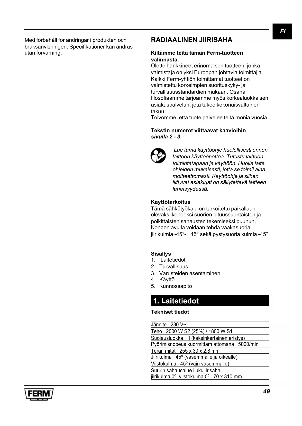 Med förbehåll för ändringar i produkten och bruksanvisningen. Specifikationer kan ändras utan förvarning. RADIAALINEN JIIRISAHA Kiitämme teitä tämän Ferm-tuotteen valinnasta. Olette hankkineet erinomaisen tuotteen, jonka valmistaja on yksi Euroopan johtavia toimittajia. Kaikki Ferm-yhtiön toimittamat tuotteet on valmistettu korkeimpien suorituskyky- ja turvallisuusstandardien mukaan. Osana filosofiaamme tarjoamme myös korkealuokkaisen asiakaspalvelun, jota tukee kokonaisvaltainen takuu. Toivomme, että tuote palvelee teitä monia vuosia. Tekstin numerot viittaavat kaavioihin sivulla 2 - 3 Lue tämä käyttöohje huolellisesti ennen laitteen käyttöönottoa. Tutustu laitteen toimintatapaan ja käyttöön. Huolla laite ohjeiden mukaisesti, jotta se toimii aina moitteettomasti. Käyttöohje ja siihen liittyvät asiakirjat on säilytettävä laitteen läheisyydessä. Käyttötarkoitus Tämä sähkötyökalu on tarkoitettu paikallaan olevaksi koneeksi suorien pituussuuntaisten ja poikittaisten sahausten tekemiseksi puuhun. Koneen avulla voidaan tehdä vaakasuoria jiirikulmia -45°- +45° sekä pystysuoria kulmia -45°. Sisällys