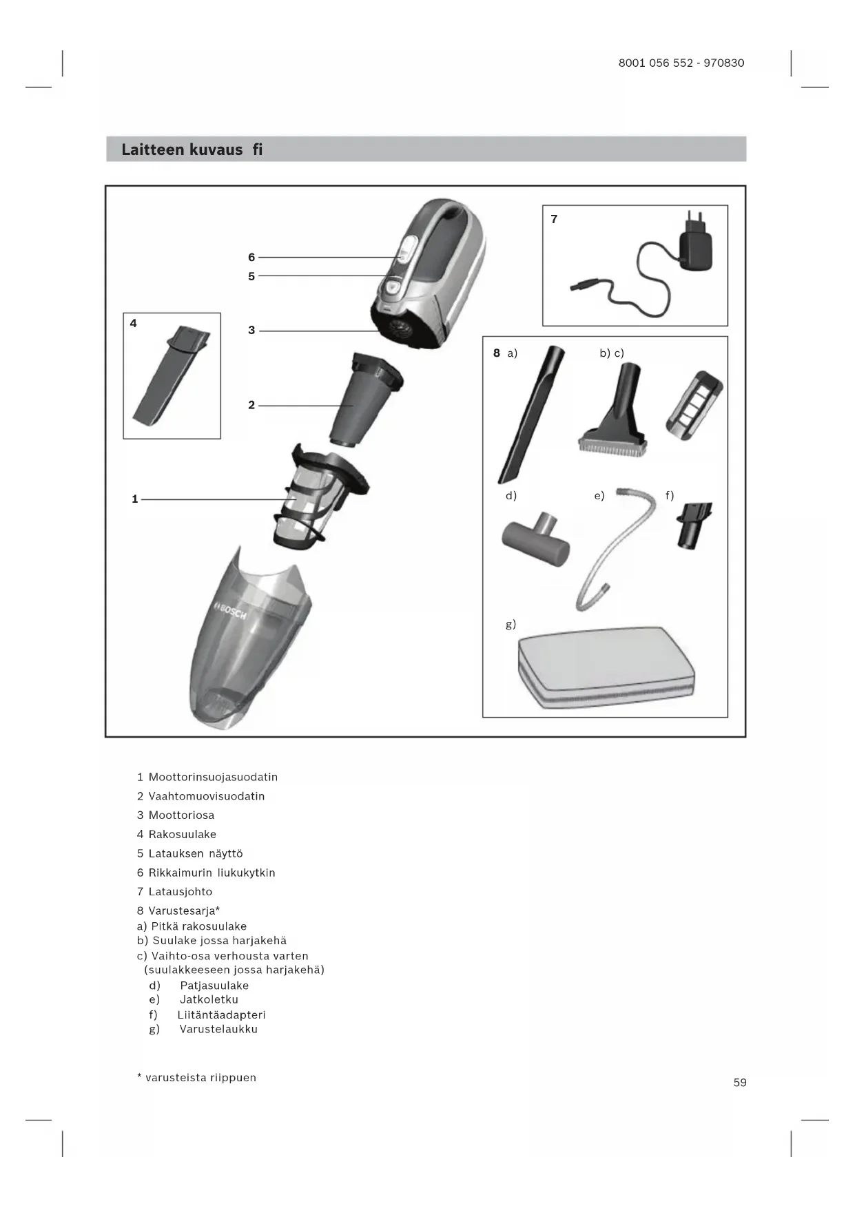 Använd inte skurmedel, fönsterputs eller allrent. Doppa aldrig dammsugaren i vatten! Rätten till tekniska ändringar förbehålls.59 8001 056 552 - 970830 Laitteen kuvaus fi 1 Moottorinsuojasuodatin 2 Vaahtomuovisuodatin 3 Moottoriosa 4 Rakosuulake 5 Latauksen näyttö 6 Rikkaimurin liukukytkin 7 Latausjohto 8 Varustesarja* a) Pitkä rakosuulake b) Suulake jossa harjakehä c) Vaihto-osa verhousta varten (suulakkeeseen jossa harjakehä) d) Patjasuulake e) Jatkoletku f) Liitäntäadapteri g) Varustelaukku