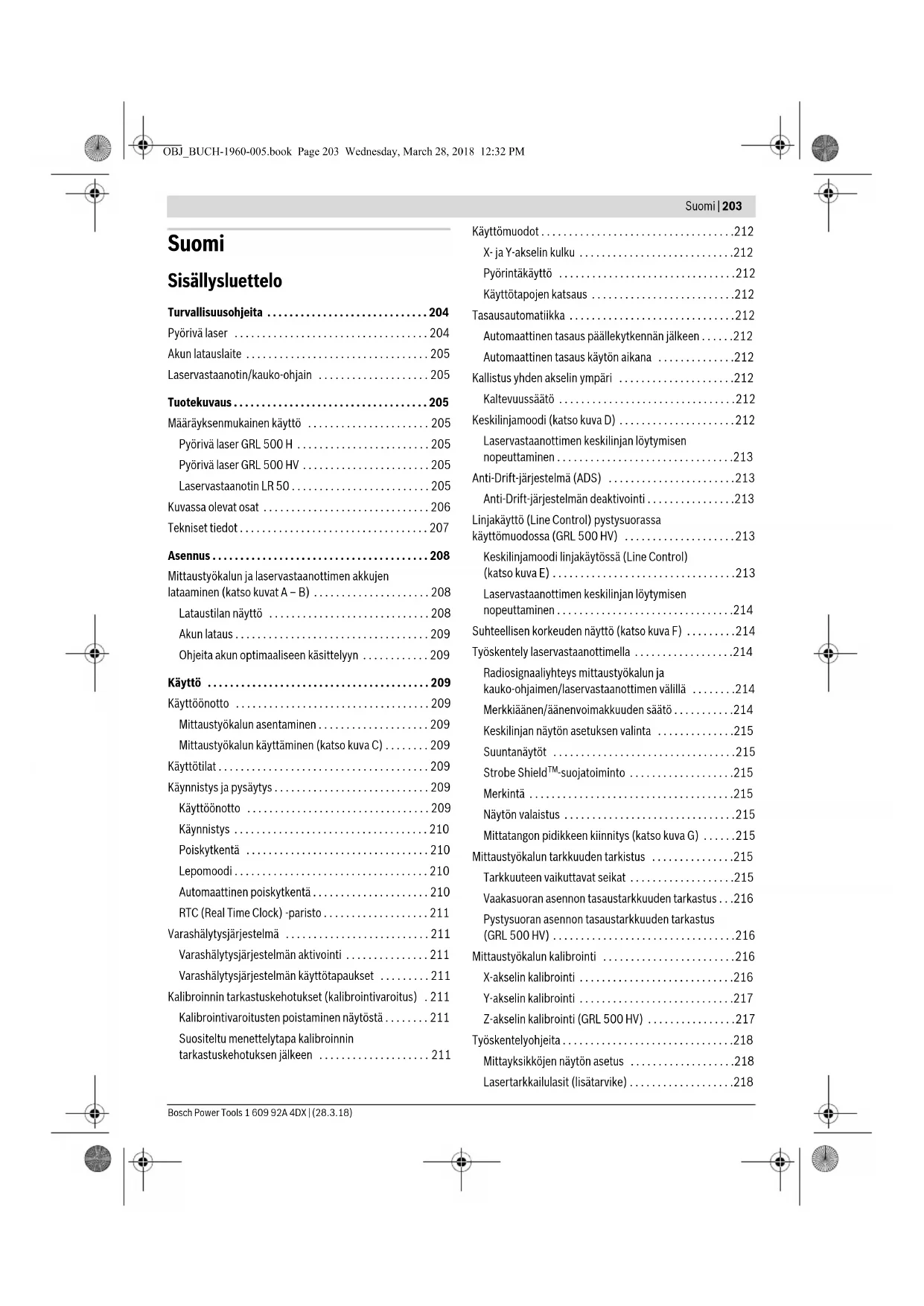 - Vaakasuoran asennon tasaustarkkuuden tarkastus p. 216