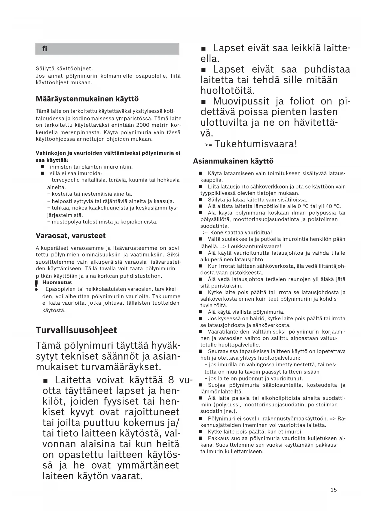 ) intryckt tills batteriet är helt urladdat innan du tar ur batteriet ur dammsu- garen Skruva ur skruvarna i höljet, ta av det och ta ur batteriet. Undvik kortslutning genom att lossa batterianslut- ningarna en i sänder och direkt isolera resp. pol. Även om batteriet är helt urladdat finns det kvar en restkapacitet som kan bli frigjord vid kortslutning.15 Lapset eivät saa leikkiä laitte- ella. Lapset eivät saa puhdistaa laitetta tai tehdä sille mitään huoltotöitä. Muovipussit ja foliot on pi- dettävä poissa pienten lasten ulottuvilta ja ne on hävitettä- vä. >= Tukehtumisvaara! Asianmukainen käyttö Käytä lataamiseen vain toimitukseen sisältyvää lataus-kaapelia. Liitä latausjohto sähköverkkoon ja ota se käyttöön vain tyyppikilvessä olevien tietojen mukaan. Säilytä ja lataa laitetta vain sisätiloissa. Älä altista laitetta lämpötiloille alle 0 °C tai yli 40 °C. Älä käytä pölynimuria koskaan ilman pölypussia tai pölysäiliötä, moottorinsuojasuodatinta ja poistoilman suodatinta.>= Kone saattaa vaurioitua! Vältä suulakkeella ja putkella imurointia henkilön pään lähellä. => Loukkaantumisvaara! Älä käytä vaurioitunutta latausjohtoa ja vaihda tilalle alkuperäinen latausjohto. Kun irrotat laitteen sähköverkosta, älä vedä liitäntäjoh-dosta vaan pistokkeesta. Älä vedä latausjohtoa terävien reunojen yli äläkä jätä sitä puristuksiin. Kytke laite pois päältä tai irrota se latausjohdosta ja sähköverkosta ennen kuin teet pölynimuriin ja kohdis-tuvia töitä. Älä käytä viallista pölynimuria. Jos kyseessä on häiriö, kytke laite pois päältä tai irrota se latausjohdosta ja sähköverkosta. Vaaratilanteiden välttämiseksi pölynimurin korjaami-nen ja varaosien vaihto on sallittu ainoastaan valtuu-tetulle huoltopalvelulle. Seuraavissa tapauksissa laitteen käyttö on lopetettava heti ja otettava yhteys huoltopalveluun: − jos imurilla on vahingossa imetty nestettä, tai nes-tettä on muulla tavoin päässyt laitteen sisään − jos laite on pudonnut ja vaurioitunut. Suojaa pölynimuria sääolosuhteilta, kosteudelta ja lämmönlähteiltä. Älä laita palavia tai alkoholipitoisia aineita suodatti-miin (pölypussi, moottorinsuojasuodatin, poistoilman suodatin jne.). Pölynimuri ei sovellu rakennustyömaakäyttöön. => Ra-kennusjätteiden imeminen voi vaurioittaa laitetta. Kytke laite pois päältä, kun et imuroi. Pakkaus suojaa pölynimuria vaurioilta kuljetuksen ai-kana. Suosittelemme sen vuoksi käyttämään pakkaus-ta imurin kuljettamiseen.Säilytä käyttöohjeet.Jos annat pölynimurin kolmannelle osapuolelle, liitä käyttöohjeet mukaan. Määräystenmukainen käyttö Tämä laite on tarkoitettu käytettäväksi yksityisessä koti-taloudessa ja kodinomaisessa ympäristössä. Tämä laite on tarkoitettu käytettäväksi enintään 2000 metrin kor-keudella merenpinnasta. Käytä pölynimuria vain tässä käyttöohjeessa annettujen ohjeiden mukaan.Vahinkojen ja vaurioiden välttämiseksi pölynimuria ei saa käyttää: ihmisten tai eläinten imurointiin. sillä ei saa imuroida: − terveydelle haitallisia, teräviä, kuumia tai hehkuvia aineita. − kosteita tai nestemäisiä aineita. − helposti syttyviä tai räjähtäviä aineita ja kaasuja. − tuhkaa, nokea kaakeliuuneista ja keskuslämmitys-järjestelmistä. − mustepölyä tulostimista ja kopiokoneista. Varaosat, varusteet Alkuperäiset varaosamme ja lisävarusteemme on sovi-tettu pölynimien ominaisuuksiin ja vaatimuksiin. Siksi suosittelemme vain alkuperäisiä varaosia lisävarustei-den käyttämiseen. Tällä tavalla voit taata pölynimurin pitkän käyttöiän ja aina korkean puhdistustehon. Huomautus Epäsopivien tai heikkolaatuisten varaosien, tarvikkei-den, voi aiheuttaa pölynimuriin vaurioita. Takuumme ei kata vaurioita, jotka johtuvat tällaisten tuotteiden käytöstä. Turvallisuusohjeet Tämä pölynimuri täyttää hyväk- sytyt tekniset säännöt ja asian- mukaiset turvamääräykset. Laitetta voivat käyttää 8 vu- otta täyttäneet lapset ja hen- kilöt, joiden fyysiset tai hen- kiset kyvyt ovat rajoittuneet tai joilta puuttuu kokemus ja/ tai tieto laitteen käytöstä, val- vonnan alaisina tai kun heitä on opastettu laitteen käytös- sä ja he ovat ymmärtäneet laiteen käytön vaarat. fi16
