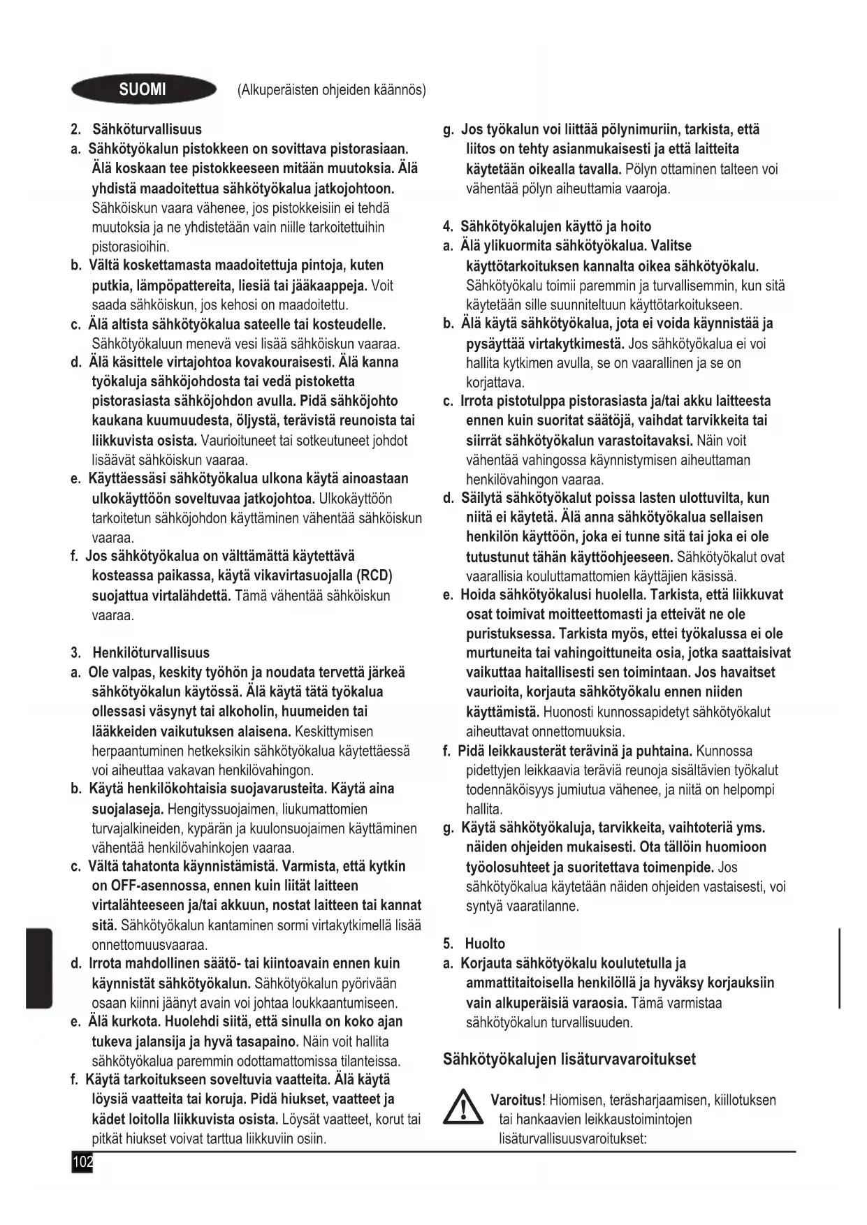 a. Pidä työalue puhtaana ja hyvin valaistuna. Onnettomuuksia sattuu herkemmin epäsiistissä tai huonosti valaistussa ympäristössä. b. Älä käytä sähkötyökalua räjähdysalttiissa ympäristössä, jossa on syttyvää nestettä, kaasua tai pölyä. Sähkötyökalujen aiheuttamat kipinät voivat sytyttää pölyn tai kaasut. c. Pidä lapset ja sivulliset loitolla sähkötyökalua käyttäessäsi. Keskittymiskyvyn herpaantuminen voi aiheuttaa hallinnan menettämisen.102 (Alkuperäisten ohjeiden käännös) SUOMI