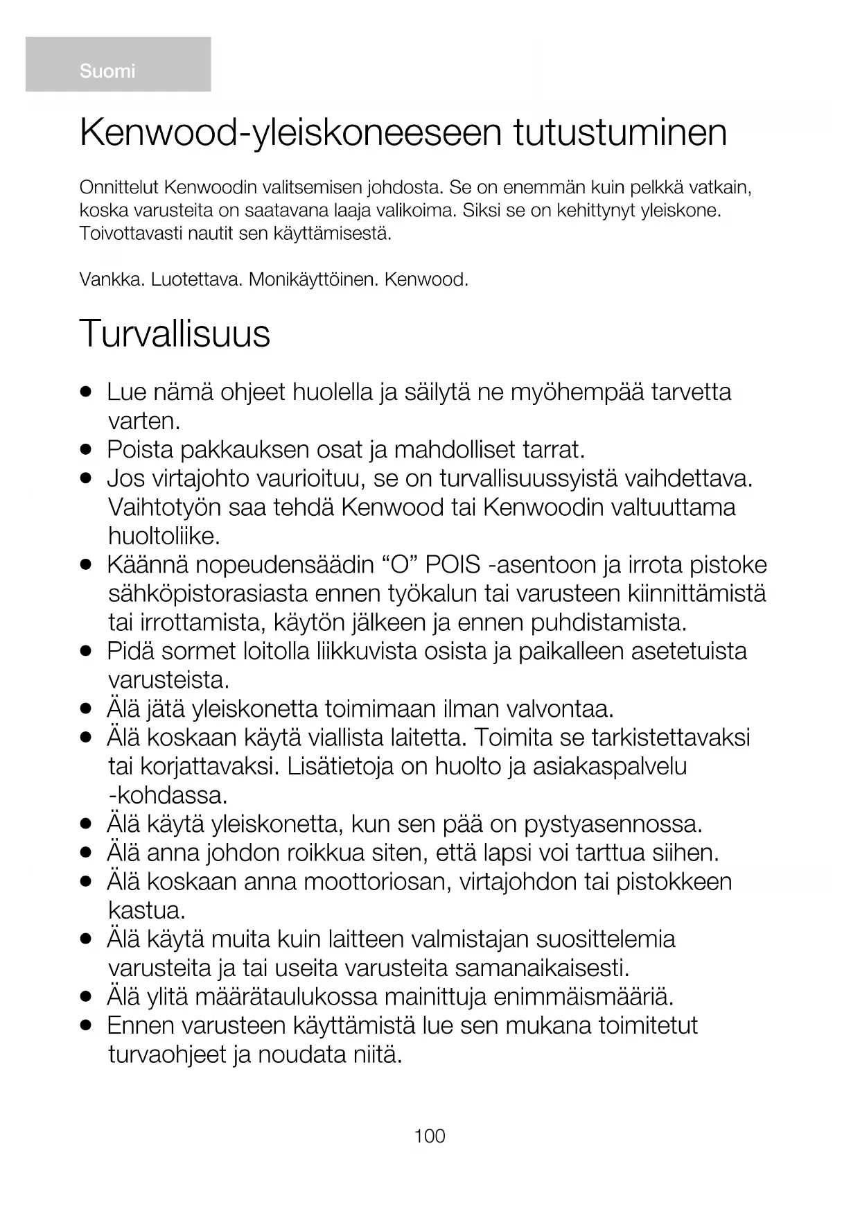 Käytä laitetta ainoastaan sille tarkoitettuun kotitalouskäytöön. Kenwood-yhtiö ei ole korvausvelvollinen, jos laitetta on käytetty väärin tai näitä ohjeita ei ole noudatettu.