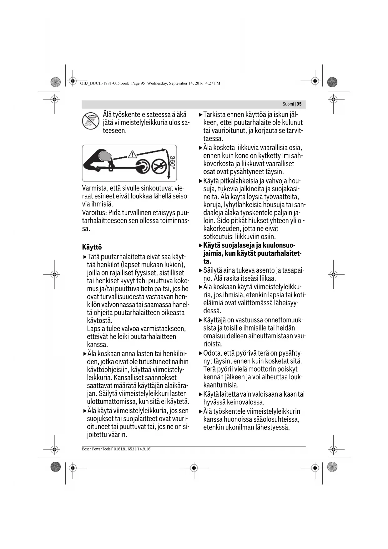 OBJ_BUCH-1981-005.book Page 92 Wednesday, September 14, 2016 4:27 PMNorsk | 93 Bosch Power Tools F 016 L81 652 | (14.9.16) Meldingenes betydning Blinkende grønt lys (rask blinking) på indikator for batterilading Hurtigladingen signaliseres ved hurtig blin- king i den grønne indikatoren for batterila- ding. Merk: Hurtigoppladingen er kun mulig hvis temperaturen på batteriet er i godkjent ladetemperaturområde, se avsnitt «Tekniske data». Blinkende grønt lys (langsom blinking) på indika- tor for batterilading Hvis batteriets ladenivå er 80 %, blinker den grønne indikatoren for batterilading lang- somt. Batteriet kan tas ut og brukes umiddelbart. Konstant lys i grønn batteri-ladeindikator Konstant lys i den grønne batteri-ladeindikato- ren signaliserer at batteriet er helt oppladet. Uten innsatt batteri signaliserer kontinuerlig lys i batteri-in- dikatoren at støpselet er satt inn i stikkontakten og at ladeap- paratet er driftsklart. Konstant lys i rød batteri-ladeindikator Konstant lysing i den røde batteri-ladeindikato- ren signaliserer at temperaturen til batteriet er utenfor godkjent ladetemperaturområde, se avsnitt «Teknis- ke data». Så snart det tillatte temperaturområdet er nådd, ko- bler ladeapparatet automatisk om til hurtigopplading. Blinklys rød batteri-ladeindikator Blinklyset til den røde batteri-ladeindikatoren signaliserer en annen feil i ladeprosessen, se av- snitt «Feilsøking». Informasjoner om opplading Ved kontinuerlige oppladingssykluser hhv. oppladingssyklu- ser som følger rett etter hverandre uten avbrudd kan ladeap- paratet bli varmt. Dette er ikke farlig og er ikke tegn på en tek- nisk defekt. En vesentlig kortere driftstid etter oppladingen er et tegn på at batteriet er oppbrukt og må skiftes ut. Feilsøking d.c. Symptomer Mulig årsak Utbedring Vernedekselet kan ikke trekkes over skjæreplaten Gal montering Fjern skjæreplate og monter vernedek- sel på nytt Gresstrimmeren går ikke Utladet batteri Lad opp batteriet, se også «Henvisnin- ger om opplading» For kaldt/varmt batteri Varm opp/avkjøl batteriet Gresstrimmeren går rykkvis Interne kabelforbindelser i hageredska- pet er defekt Ta kontakt med kundeservice På-/av-bryter defekt Ta kontakt med kundeservice Hageredskap overbelastet For høyt gress Klipp trinnvis Hageredskapet klipper ikke Skadet kniv Utskifting av kniven Forsterkede vibrasjoner Skadet kniv Utskifting av kniven Batteri-ladeindikator lyser kontinuerlig Ingen opplading mulig Batteriet er ikke satt (riktig) inn Sett batteriet riktig på ladeapparatet Batterikontaktene er tilsmusset Rengjør batterikontaktene; f.eks. ved hyppig innsetting og fjerning av batteri- et, skift eventuelt ut batteriet Batteriet er defekt Skift ut batteriet OBJ_BUCH-1981-005.book Page 93 Wednesday, September 14, 2016 4:27 PM94 | Suomi F 016 L81 652 | (14.9.16) Bosch Power Tools Kundeservice og rådgivning ved bruk www.bosch-garden.com Ved alle forespørsler og reservedelsbestillinger må du oppgi det 10-sifrede produktnummeret som er angitt på hagered- skapets typeskilt. Norsk Robert Bosch AS Postboks 350 1402 Ski Tel.: 64 87 89 50 Faks: 64 87 89 55 Transport Li-ion-batteriene i verktøyet underligger kravene for farlig gods. Batteriene kan transporteres på veier av brukeren uten ytterligere krav. Ved forsendelse gjennom tredje personer (f. eks.: lufttran- sport eller spedisjon) må det oppfylles spesielle krav til em- ballasje og merking. Du må da konsultere en ekspert for farlig gods ved forberedelse av forsendelsen. Send batterier kun hvis huset ikke er skadet. Lim igjen de åp- ne kontaktene og pakk batteriet slik at det ikke beveger seg i emballasjen. Ta også hensyn til eventuelle videreførende nasjonale for- skrifter. Deponering Hageredskaper, ladeapparater og batterier må ikke kastes i vanlig søppel! Kun for EU-land: Iht. det europeiske direktivet 2012/19/EU om gamle elektriske og elektroniske maski- ner og iht. det europeiske direktivet 2006/66/EF må defekte eller oppbrukte bat- terier/oppladbare batterier samles inn adskilt og leveres inn til en miljøvennlig resir- kulering. Batterier/oppladbare batterier: Li-Ion: Ta hensyn til informasjonene i avsnittet «Transport». Rett til endringer forbeholdes. Suomi Turvallisuusohjeita Huom! Lue seuraavat ohjeet tarkasti. Tutustu puutarhalaitteen käyttöele- mentteihin ja asianmukaiseen käyt- töön. Säilytä käyttöohje huolellisesti myöhempää käyttöä varten. Kuvatunnusten selitys Yleiset varoitusohjeet. Lue käyttöohje huolellisesti. Varmista, että sivulle sinkoutu- vat vieraat esineet eivät loukkaa lähellä seisovia ihmisiä. Varoitus: Pidä turvallinen etäi- syys puutarhalaitteeseen sen ollessa toiminnassa. Ei sopiva. Poista akku ennen kuin suoritat puutarhalaitteeseen kohdistu- via säätö- tai puhdistustöitä tai kun puutarhalaite jää pidem- mäksi aikaa ilman valvontaa. Käytä kuulonsuojaimia ja suoja- laseja. Batteri-ladeindikator lyser ikke Strømstøpselet til ladeapparatet er ikke satt (riktig) inn Sett strømstøpselet (helt) inn i stikkon- takten Stikkontakt, strømledning eller ladeap- parat er defekt Sjekk strømspenningen, la ladeappara- tet eventuelt kontrolleres av en autori- sert kundeservice for Bosch-elektro- verktøy Symptomer Mulig årsak Utbedring a.c. d.c. OBJ_BUCH-1981-005.book Page 94 Wednesday, September 14, 2016 4:27 PMSuomi | 95 Bosch Power Tools F 016 L81 652 | (14.9.16) Älä työskentele sateessa äläkä jätä viimeistelyleikkuria ulos sa- teeseen. Varmista, että sivulle sinkoutuvat vie- raat esineet eivät loukkaa lähellä seiso- via ihmisiä. Varoitus: Pidä turvallinen etäisyys puu- tarhalaitteeseen sen ollessa toiminnas- sa. Käyttö Tätä puutarhalaitetta eivät saa käyt- tää henkilöt (lapset mukaan lukien), joilla on rajalliset fyysiset, aistilliset tai henkiset kyvyt tahi puuttuva koke- mus ja/tai puuttuva tieto paitsi, jos he ovat turvallisuudesta vastaavan hen- kilön valvonnassa tai saamassa hänel- tä ohjeita 