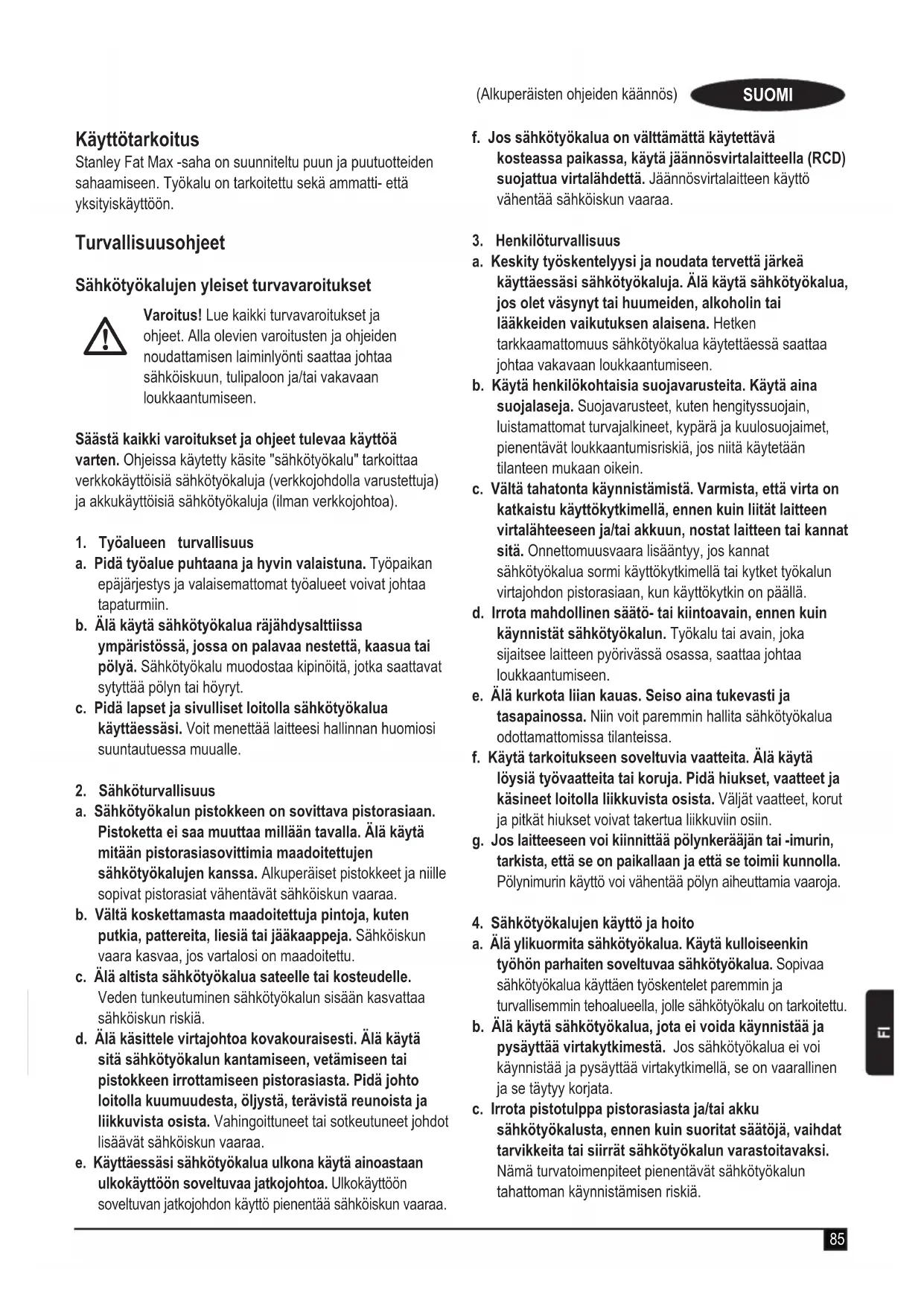 e. Käyttaessäsi sahkötyokalua ulkona käyt ainoastaan ulkokayttöön soveltuvaa jatkojohtoa. Ulkokayttöön soveltuvan jatkojohdon käytto pientaà sahköiskun vaaraa.