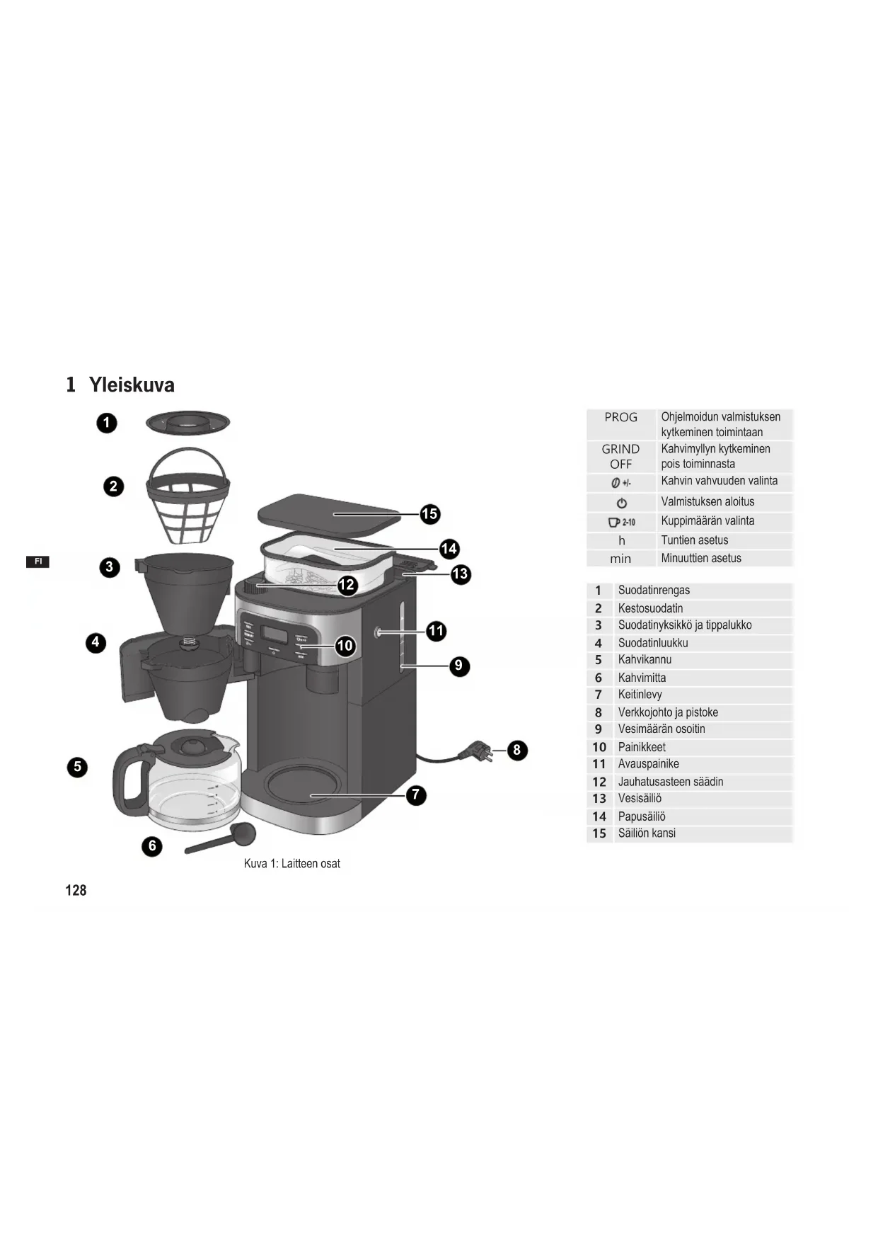 ”PROG”-painikkeen vieressä oleva LED palaa. Laite valmistaa kahvin valittuna ajankohtana valituilla asetuksilla. Ohjelmoitu valmistus kytketään pois toiminnasta painamalla PROG-painiket- ta uudelleen. Â ”PROG”-painikkeen vieressä oleva LED sammuu. Ohjelmoitu valmistus on kytketty pois toiminnasta.139 FI FI 7 Laitteen puhdistus VAROITUS! Palovammavaara! – Irrota aina ennen laitteen puhdistusta pistoke
