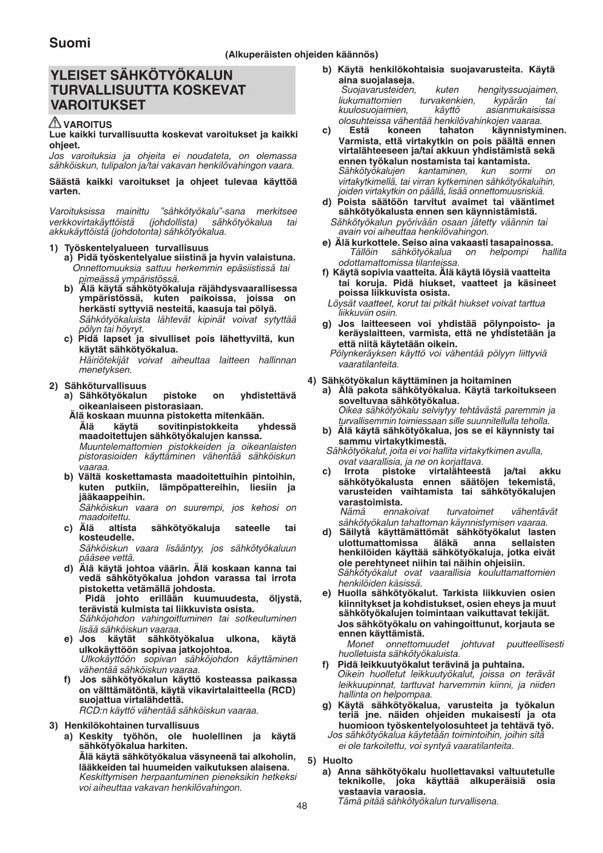 TURVALLISUUTTA KOSKEVAT VAROITUKSET VAROITUS Lue kaikki turvallisuutta koskevat varoitukset ja kaikki ohjeet. Jos varoituksia ja ohjeita ei noudateta, on olemassa sähköiskun, tulipalon ja/tai vakavan henkilövahingon vaara. Säästä kaikki varoitukset ja ohjeet tulevaa käyttöä varten. Varoituksissa mainittu ”sähkötyökalu”-sana merkitsee verkkovirtakäyttöistä (johdollista) sähkötyökalua tai akkukäyttöistä (johdotonta) sähkötyökalua.