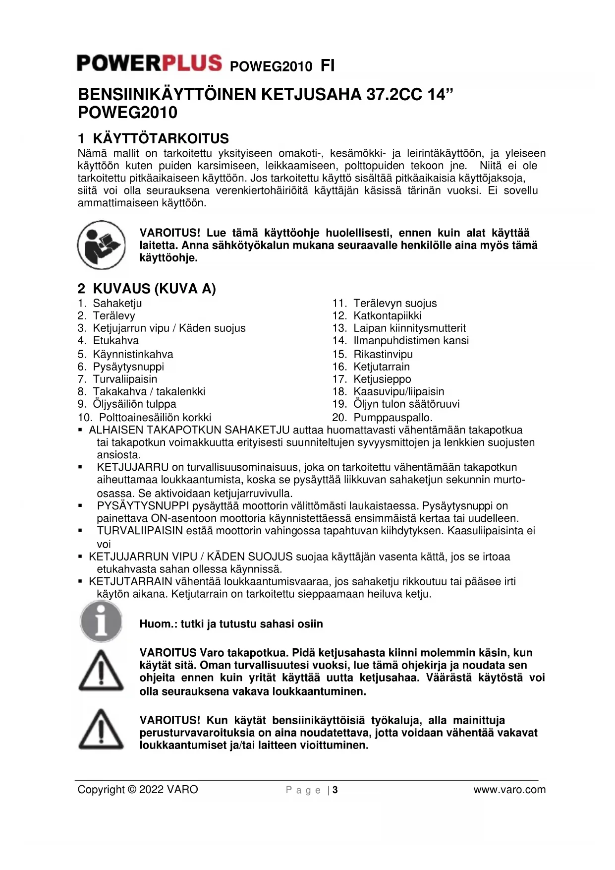 - KETJUTARRAIN vähentää loukkaantumisvaaraa, jos sahaketju rikkoutuu tai pääsee irti käytön aikana. Ketjutarrain on tarkoitettu sieppaamaan heiluva ketju. Huom.: tutki ja tutustu sahasi osiin VAROITUS Varo takapotkua. Pidä ketjusahasta kiinni molemmin käsin, kun käytät sitä. Oman turvallisuutesi vuoksi, lue tämä ohjekirja ja noudata sen ohjeita ennen kuin yrität käyttää uutta ketjusahaa. Väärästä käytöstä voi olla seurauksena vakava loukkaantuminen. VAROITUS! Kun käytät bensiinikäyttöisiä työkaluja, alla mainittuja perusturvavaroituksia on aina noudatettava, jotta voidaan vähentää vakavat loukkaantumiset ja/tai laitteen vioittuminen.POWEG2010 FI Copyright © 2022 VARO P a g e | 4 www.varo.com