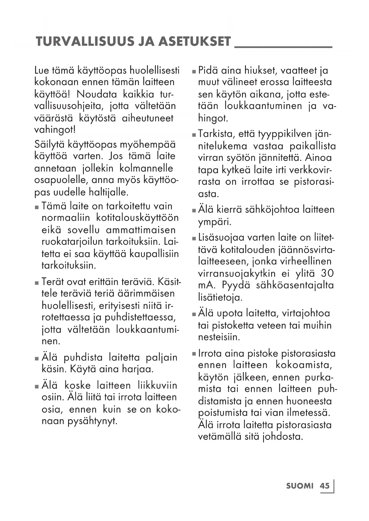 Pidä aina hiukset, vaatteet ja muut välineet erossa laitteesta sen käytön aikana, jotta este- tään loukkaantuminen ja va- hingot.
