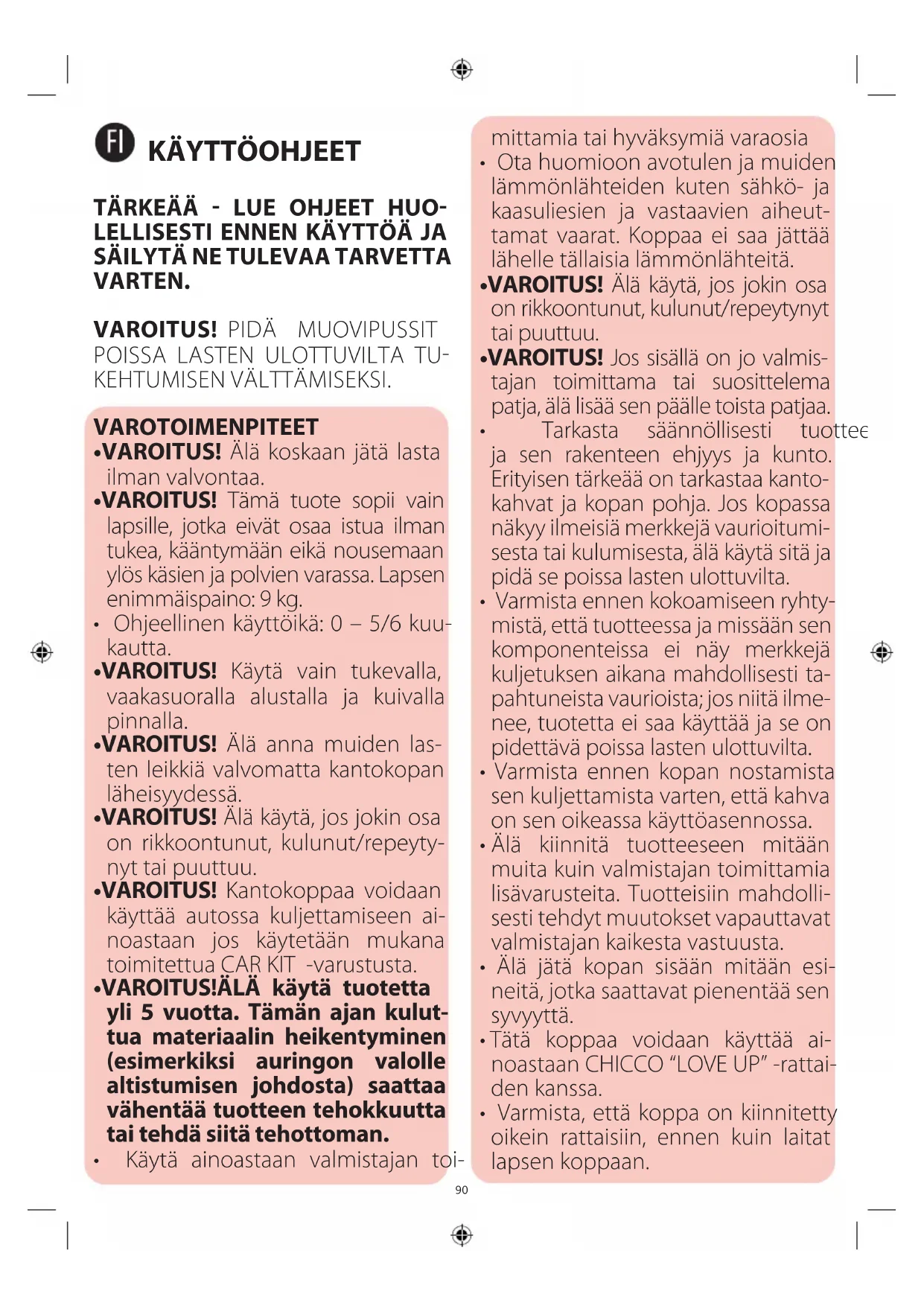 Tämä tuote tarvitsee säännöllistä huoltoa. Puhdistus- ja huol- totoimenpiteet kuuluvat aikuisen henkilön suoritettaviksi. PUHDISTUS Puhdista kangasosat kostealla sienellä ja neutraalilla saip- pualla. Puhdista muoviosat säännöllisesti kostealla liinalla. Kuivaa metalliosat, jos ne ovat tulleet kontaktiin veden kanssa, jotta niihin ei muodostuisi ruostetta. PESU Kopan sisä/ulkoverhoilu sekä patja voidaan irrottaa ja pes- tä; niiden irrottamisesta on kerrottu kappaleessa KOPAN VERHOILUN IRROTTAMINEN. Noudata huolellisesti kyseiseen osaan kiinnitetyssä etiketis- sä ilmoitettuja pesuohjeita. Seuraavassa on ilmoitettu pesumerkinnät sekä niiden mer- kitykset: Pese käsin kylmässä vedessä. Valkaisu kielletty. Rumpukuivaus kielletty. Silitys kielletty. Kemiallinen pesu kielletty. HUOLTO Kuivaa metalliset osat ruosteen muodostumisen ehkäise- miseksi. Älä upota veteen. Puhdista muoviosat säännölli- sesti kostealla liinalla. Pidä kitkan ehkäisemiseksi kopan ja vaunujen kiinnitysosat puhtaina pölystä ja hiekasta. Älä jätä tuotteita pitkäksi ajaksi aurinkoon; kankaat saattavat haalistua. Voitele ainoastaan tarpeen vaatiessa kuivalla sili- koniöljyllä. Älä käytä puhdistukseen liuotteita tai hankaavia tuotteita. KOPAN OMINAISUUDET Koppaan kuuluvat seuraavat osat: kangasverhoilu, kuomu, peite, patja, irrotettava patja, Comfort Kit (kaksi olkahihnaa ja yksi haarahihna), irrotettava sarja autossa kuljettamista varten.