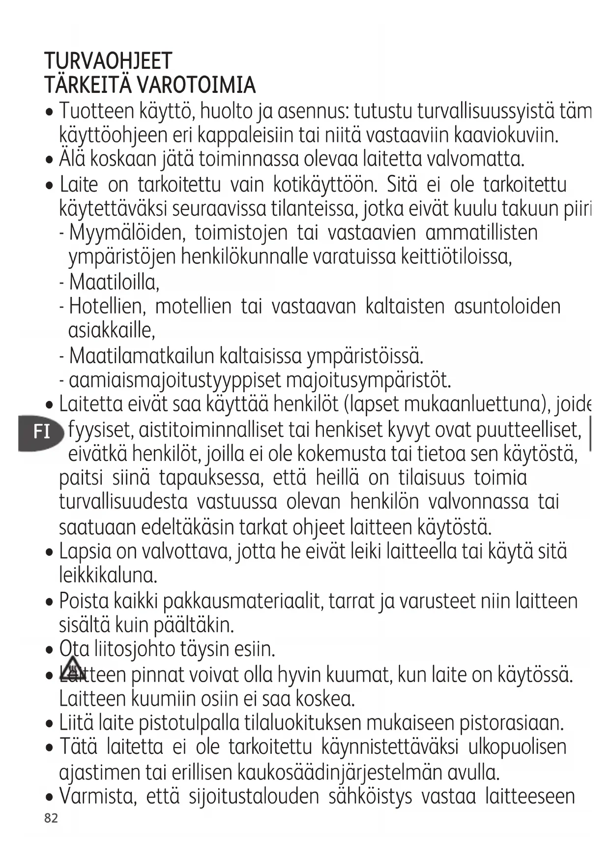 - Alle 8-vuotiaat lapset eivät saa käyttää laitetta. Vähintään 8- vuotiaat lapset voivat käyttää laitetta, jos heitä valvotaan jatkuvasti. Tätä laitetta voivat käyttää henkilöt, joiden fyysiset, aisteihin TURVAOHJEET
