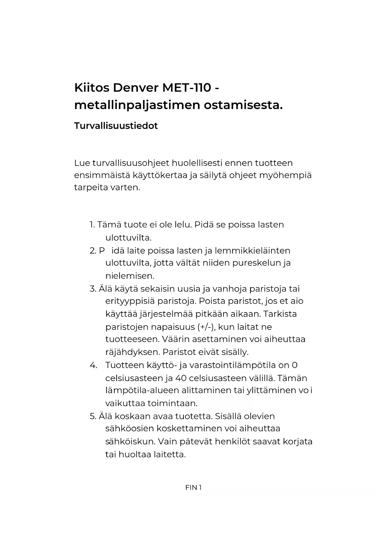 enver A/S Omega 5A, Soeften DK-8382 Hinnerup Danmark www.facebook.com/denver.euFIN 1 Kiitos Denver MET-110 - metallinpaljastimen ostamisesta. Turvallisuustiedot Lue turvallisuusohjeet huolellisesti ennen tuotteen ensimmäistä käyttökertaa ja säilytä ohjeet myöhempiä tarpeita varten.