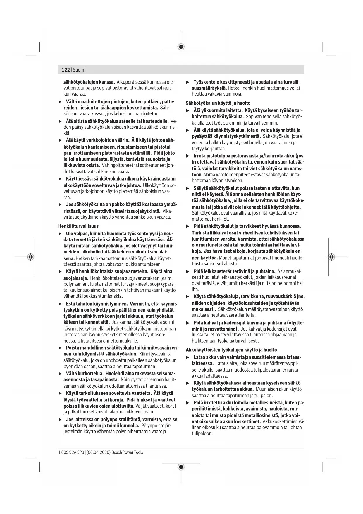 - Näissä käyttöohjeissa ilmoitetut tärinä- ja melupäästötiedot on mitattu standardissa määritetyn mittausmenetelmän mu- kaan ja niitä voi käyttää sähkötyökalujen keskinäiseen vertai- luun. Ne soveltuvat myös tärinä- ja melupäästöjen alustavaan arviointiin. Ilmoitetut tärinä- ja melupäästöt vastaavat sähkötyökalun pääasiallisia käyttötapoja. Tärinä- ja melupäästöt saattavat kuitenkin poiketa ilmoitetuista arvoista, jos sähkötyökalua käytetään toisiin töihin, muilla käyttötarvikkeilla tai riittämät- tömästi huollettuna. Tämä saattaa suurentaa koko työsken- telyajan tärinä- ja melupäästöjä huomattavasti. Tärinä- ja melupäästöjen tarkaksi arvioimiseksi on huomioi- tava myös ne ajat, jolloin laite on sammutettuna tai tyhjä- käynnillä. Tämä voi vähentää huomattavasti koko työskente- lyajan tärinä- ja melupäästöjä. Määrittele tarvittavat lisävarotoimenpiteet käyttäjän suojele- miseksi tärinän aiheuttamilta haitoilta (esimerkiksi sähkötyö- kalujen ja käyttötarvikkeiden huolto, käsien pitäminen lämpi- minä ja työprosessien organisointi). Bosch Power Tools 1 609 92A 5P3 | (06.04.2020)128 | Suomi Asennus Vakiovarustus Teollisuusakkuruuvinvääntimet toimitetaan ilman akkua. Teollisuusakkukulmaruuvinvääntimet toimitetaan ilman kul- maruuvauspäätä ja akkua. Ota sopivien tarvikkeiden valintaan liittyvissä kysymyksissä yhteyttä Bosch-teollisuustyökalujen edustajaan. Käyttö- ja säilytysympäristö Sähkötyökalu on tarkoitettu ainoastaan sisä- käyttöön. Työkalun kunnollisen toiminnan varmistami- seksi käyttöympäristön lämpötilan tulee olla –5