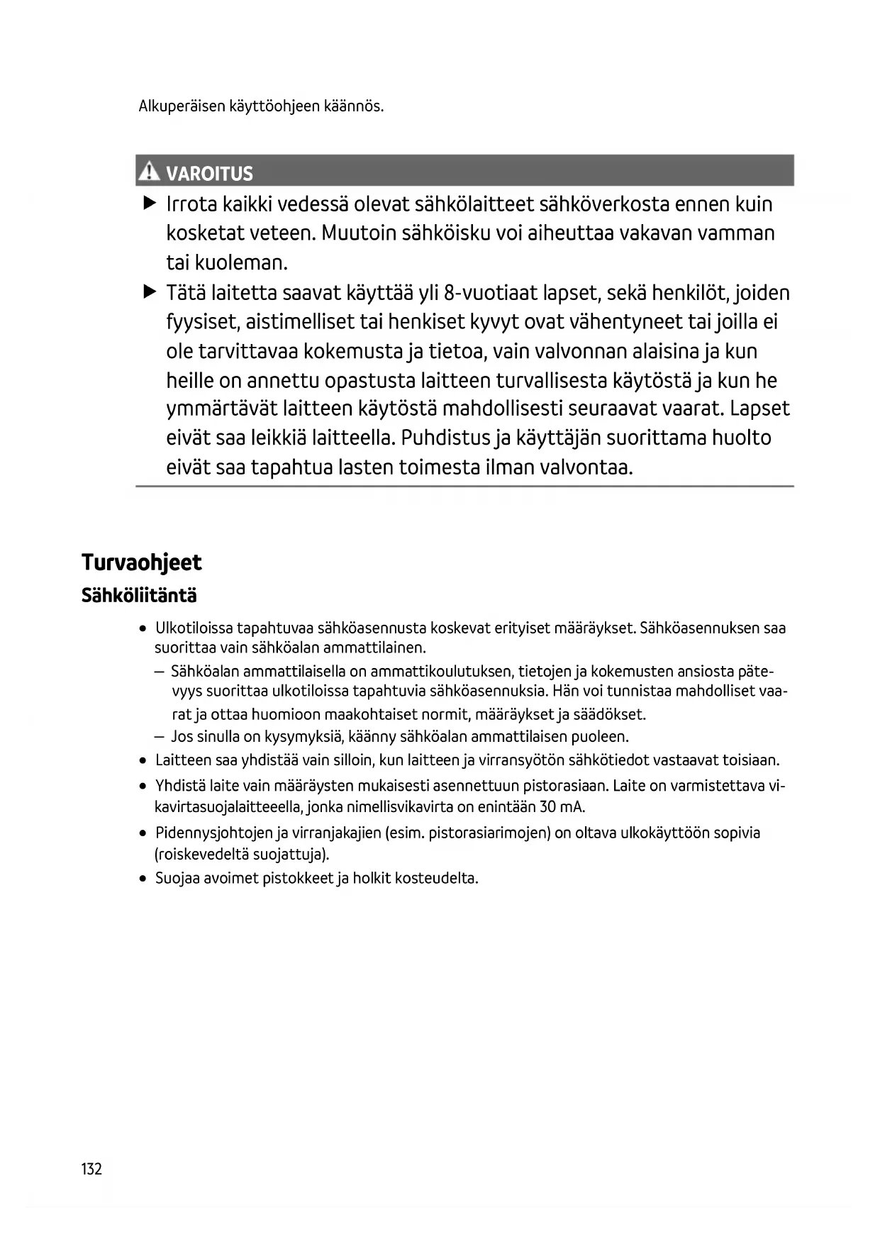 - Yhdistä laite vain määräysten mukaisesti asennettuun pistorasiaan. Laite on varmistettava vi- kavirtasuojalaitteeella, jonka nimellisvikavirta on enintään 30 mA.