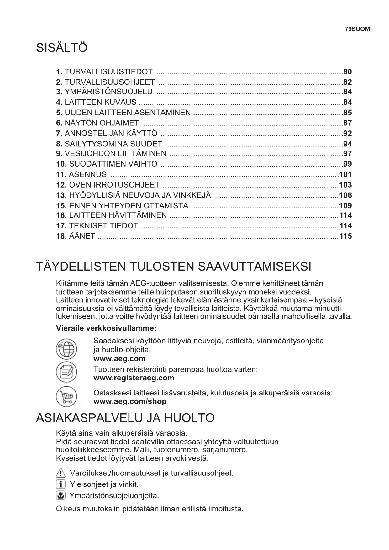 Kiitämme teitä tämän AEG-tuotteen valitsemisesta. Olemme kehittäneet tämän tuotteen tarjotaksemme teille huipputason suorituskyvyn moneksi vuodeksi. Laitteen innovatiiviset teknologiat tekevät elämästänne yksinkertaisempaa – kyseisiä ominaisuuksia ei välttämättä löydy tavallisista laitteista. Käyttäkää muutama minuutti lukemiseen, jotta voitte hyödyntää laitteen ominaisuudet parhaalla mahdollisella tavalla. Käytä aina vain alkuperäisiä varaosia. Pidä seuraavat tiedot saatavilla ottaessasi yhteyttä valtuutettuun huoltoliikkeeseemme. Malli, tuotenumero, sarjanumero. Kyseiset tiedot löytyvät laitteen arvokilvestä. Vieraile verkkosivullamme: Saadaksesi käyttöön liittyviä neuvoja, esitteitä, vianmääritysohjeita ja huolto-ohjeita: www.aeg.com Tuotteen rekisteröinti parempaa huoltoa varten: www.registeraeg.com Ostaaksesi laitteesi lisävarusteita, kulutusosia ja alkuperäisiä varaosia: www.aeg.com/shop Varoitukset/huomautukset ja turvallisuusohjeet. Yleisohjeet ja vinkit. Ympäristönsuojeluohjeita.