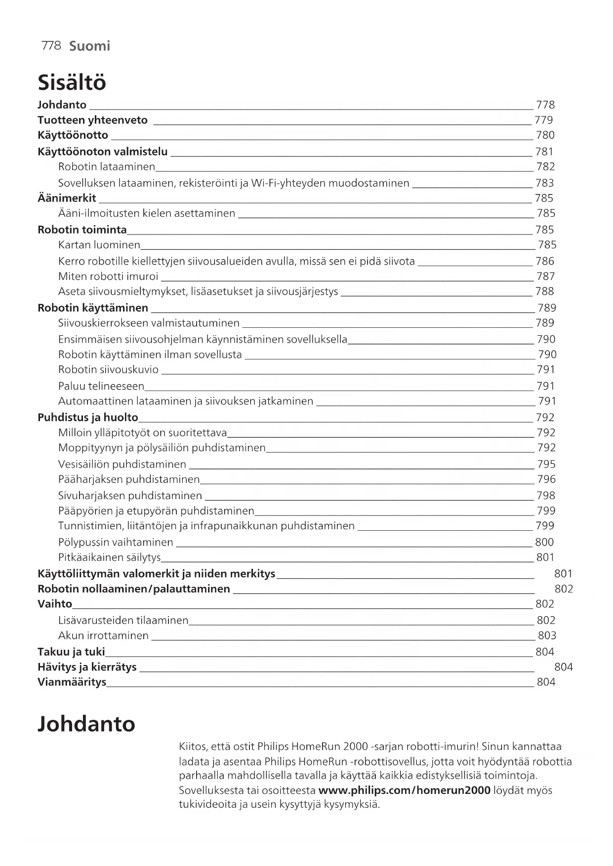 Suomi Sisältö Johdanto _________________________________________________________________________________ 778 Tuotteen yhteenveto _____________________________________________________________________ 779 Käyttöönotto _____________________________________________________________________________ 780 Käyttöönoton valmistelu __________________________________________________________________ 781 Robotin lataaminen_____________________________________________________________________ 782 Sovelluksen lataaminen, rekisteröinti ja Wi-Fi-yhteyden muodostaminen ______________________ 783 Äänimerkit _______________________________________________________________________________ 785 Ääni-ilmoitusten kielen asettaminen ______________________________________________________ 785 Robotin toiminta__________________________________________________________________________ 785 Kartan luominen________________________________________________________________________ 785 Kerro robotille kiellettyjen siivousalueiden avulla, missä sen ei pidä siivota _____________________ 786 Miten robotti imuroi ____________________________________________________________________ 787 Aseta siivousmieltymykset, lisäasetukset ja siivousjärjestys ___________________________________ 788 Robotin käyttäminen ______________________________________________________________________ 789 Siivouskierrokseen valmistautuminen _____________________________________________________ 789 Ensimmäisen siivousohjelman käynnistäminen sovelluksella__________________________________ 790 Robotin käyttäminen ilman sovellusta _____________________________________________________ 790 Robotin siivouskuvio ____________________________________________________________________ 791 Paluu telineeseen_______________________________________________________________________ 791 Automaattinen lataaminen ja siivouksen jatkaminen ________________________________________ 791 Puhdistus ja huolto________________________________________________________________________ 792 Milloin ylläpitotyöt on suoritettava________________________________________________________ 792 Moppityynyn ja pölysäiliön puhdistaminen_________________________________________________ 792 Vesisäiliön puhdistaminen _______________________________________________________________ 795 Pääharjaksen puhdistaminen_____________________________________________________________ 796 Sivuharjaksen puhdistaminen ____________________________________________________________ 798 Pääpyörien ja etupyörän puhdistaminen___________________________________________________ 799 Tunnistimien, liitäntöjen ja infrapunaikkunan puhdistaminen ________________________________ 799 Pölypussin vaihtaminen _________________________________________________________________ 800 Pitkäaikainen säilytys____________________________________________________________________ 801 Käyttöliittymän valomerkit ja niiden merkitys_______________________________________________ 801 Robotin nollaaminen/palauttaminen _______________________________________________________ 802 Vaihto____________________________________________________________________________________ 802 Lisävarusteiden tilaaminen_______________________________________________________________ 802 Akun irrottaminen ______________________________________________________________________ 803 Takuu ja tuki______________________________________________________________________________ 804 Hävitys ja kierrätys ________________________________________________________________________ 804 Vianmääritys______________________________________________________________________________ 804 Johdanto Kiitos, että ostit Philips HomeRun 2000 ‑sarjan robotti-imurin! Sinun kannattaa ladata ja asentaa Philips HomeRun ‑robottisovellus, jotta voit hyödyntää robottia parhaalla mahdollisella tavalla ja käyttää kaikkia edistyksellisiä toimintoja. Sovelluksesta tai osoitteesta www.philips.com/homerun2000 löydät myös tukivideoita ja usein kysyttyjä kysymyksiä.779 Suomi Lue erillinen turvallisuuslehtinen huolellisesti ennen robotin ensimmäistä käyttökertaa ja säilytä se vastaisen varalle. Tuotteen yhteenveto