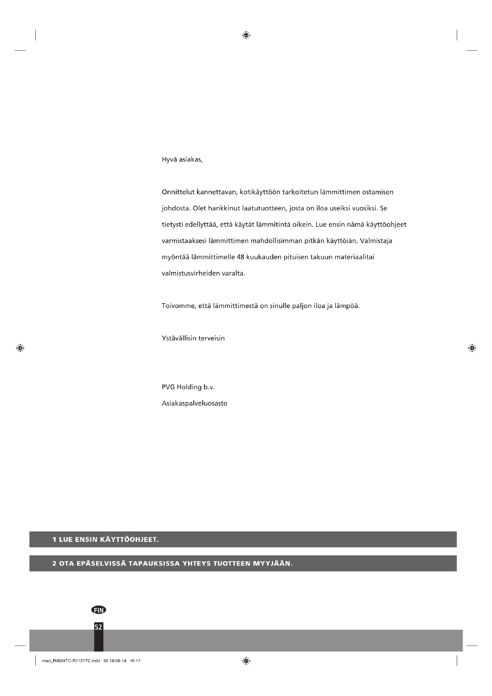 FIN man_R4024TC-R7127TC.indd 53 18-09-14 15:1734 1998/1999 R125E mitä sinun tuLee tietää ennen KäyttÖä VARMISTA AINA, ETTÄ ILMANVAIHTO ON RIITTÄVÄ Luetämäkäyttöopashuolellisestiennenkuinkäytätlaitetta.Säilytäopas vastaisuudenvaralle.Asennalaitevainsiinätapauksessa,ettäseonpaikallisten jakansallistenlakien,määräystenjastandardienmukainen.Laitettasaakäyttää vainlämmityslaitteenakotitalouksissa.Laitettasaakäyttäävainkuivissasisätiloissa tavallisissakotioloissa,kutenolohuoneessa,keittiössätaiautotallissa. Mallistariippumattaonainavarmistettava,ettälämmitintäkäytetäänriittävän suuressatilassa,jolloinkäyttöonturvallistaeikälisäilmanvaihtoatarvita.Jos huoneonvaadittuapienempi,ovitaiikkunaonpidettävähiemanraollaan(noin 2,5cm).Tilassa,jossalämmitintäkäytetään,onoltavariittäväilmanvaihto(tulo- japoistoilma-aukkojenonoltavavähintään50cm