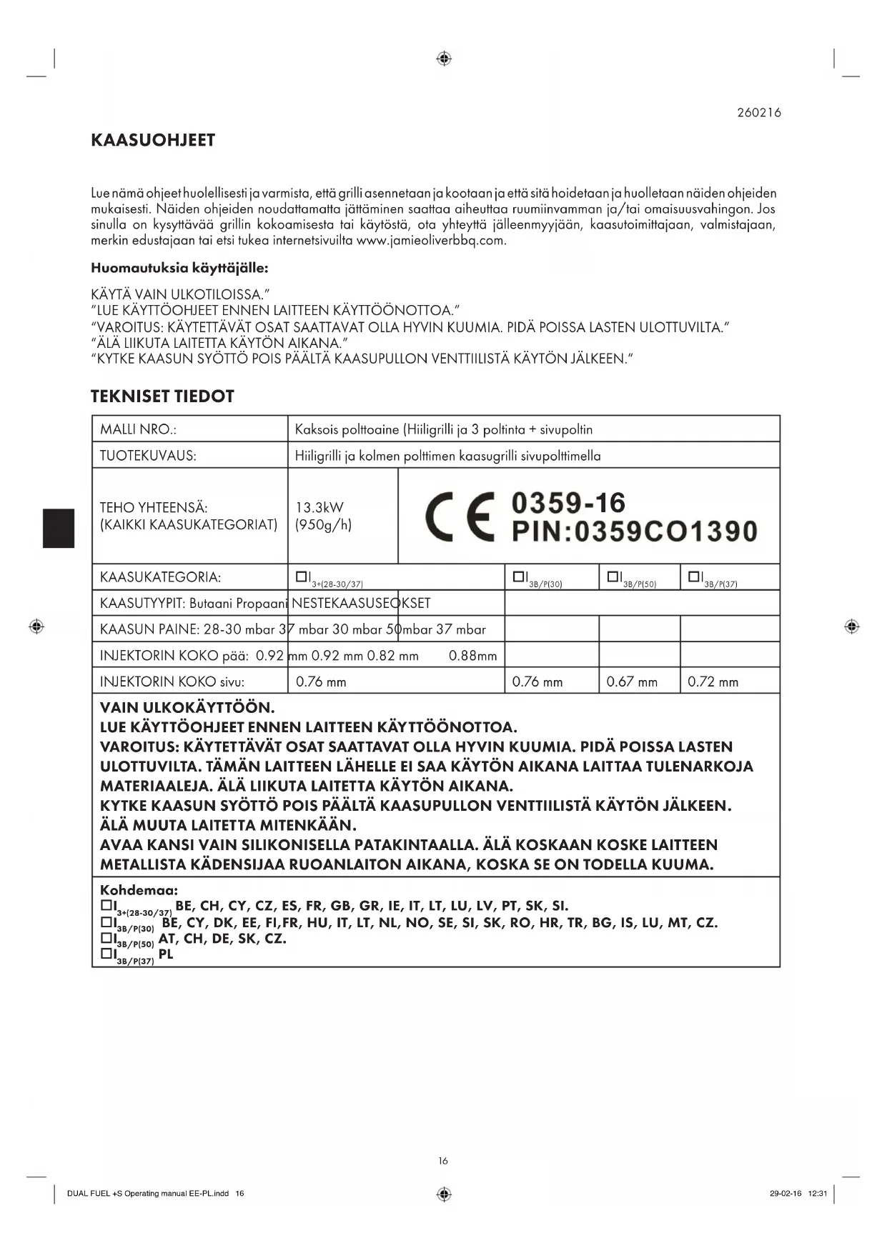 käyttämällä pitkävartisia pihtejä. VAROITUS: PIDÄ VASEN SIVUTASO AINA YLHÄÄLLÄ, KUN KÄYTÄT GRILLIN HIILIPUOLTA. VAROITUS KUUMAT PINNAT: Käytä uunikinnasta, kun avaat tai suljet hiiligrillin ilmaluukun. DUAL FUEL +S Operating manual EE-PL.indd 23 29-02-16 12:31KAASUGRILLIN TAKUU Kaupan takuun lisäksi Jamie Oliver BBQ lupaa korvata uuden osan, jos laitteessa esiintyy materiaali- tai valmistusvirheitä sovitun takuuajan aikana ostopäivästä alkaen. Takuu on voimassa edellyttäen: e. Että laite on ollut normaalissa yksityisessä kotikäytössä. f. Että laitetta ei ole muutettu tai korjattu asiattoman henkilön toimesta. g. Että laite on säilytetty kuivassa tilassa talven yli. h. Että laitetta ei ole vahingoitettu.